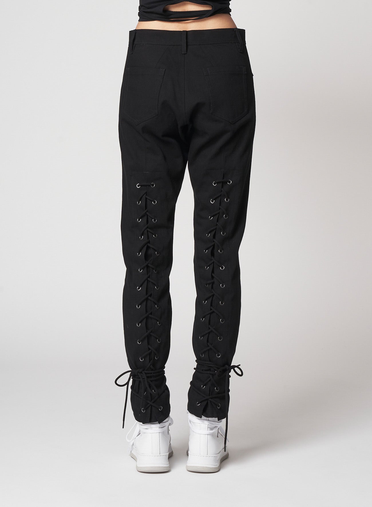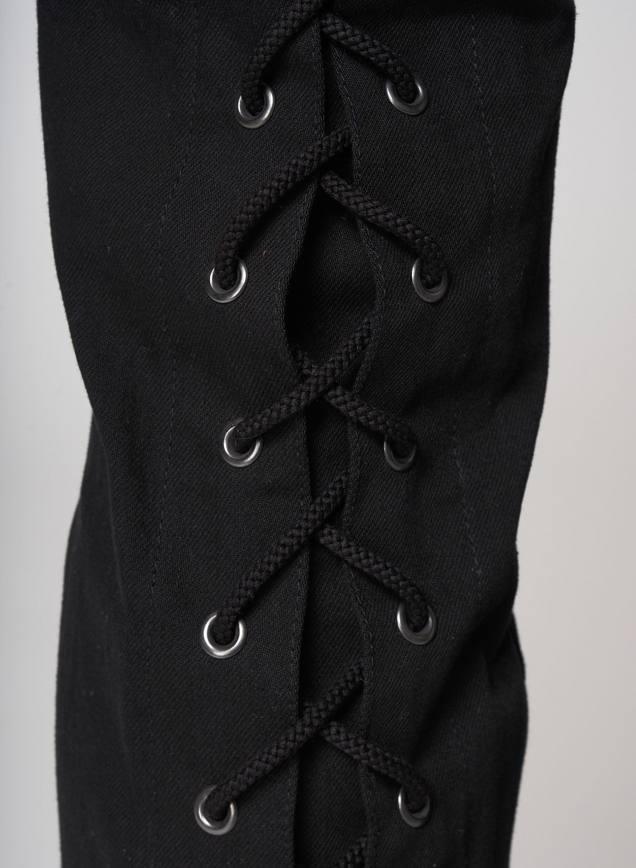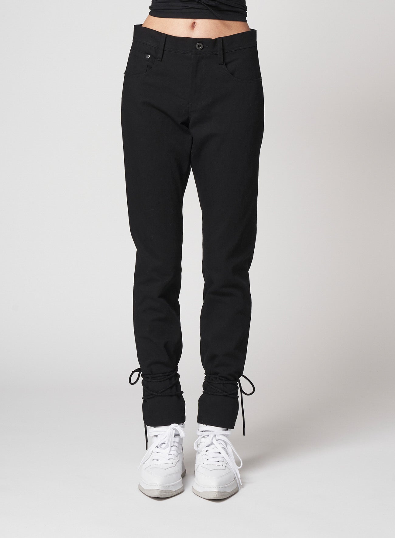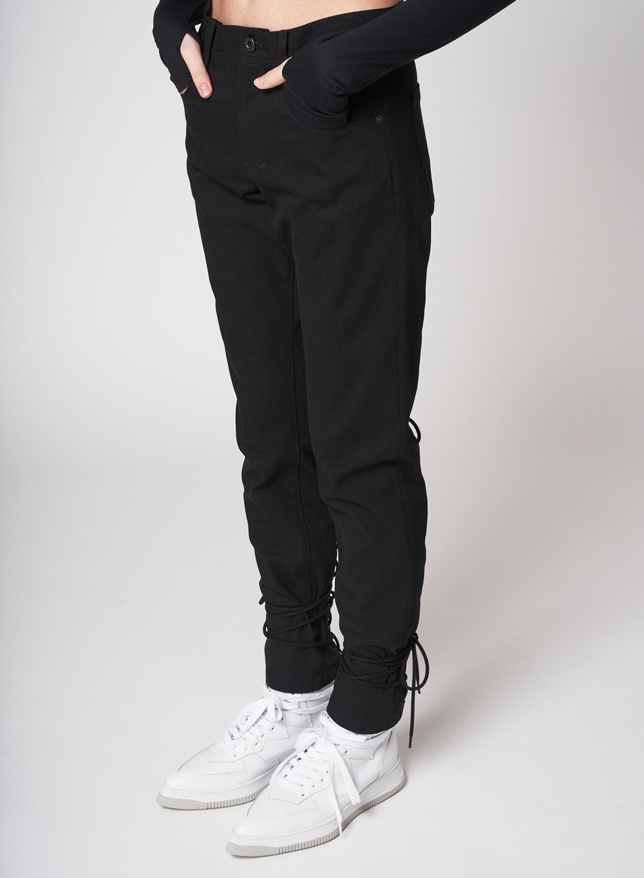 Un denim nero ricco di carattere che diventa più profondo nel colore grazie alla ridipintura. I jeans invecchiano nel tempo, offrendo un aspetto unico. Questi pantaloni skinny hanno un retro con lacci, che consente di indossare i lacci semplicemente o avvolti attorno alle caviglie.