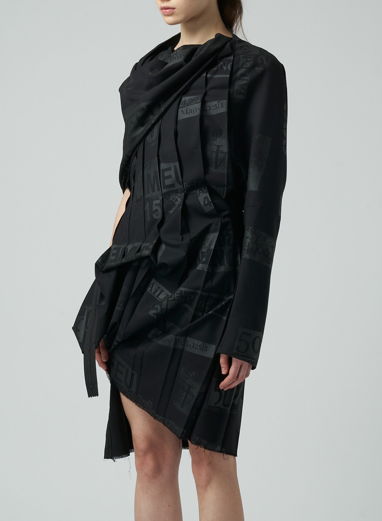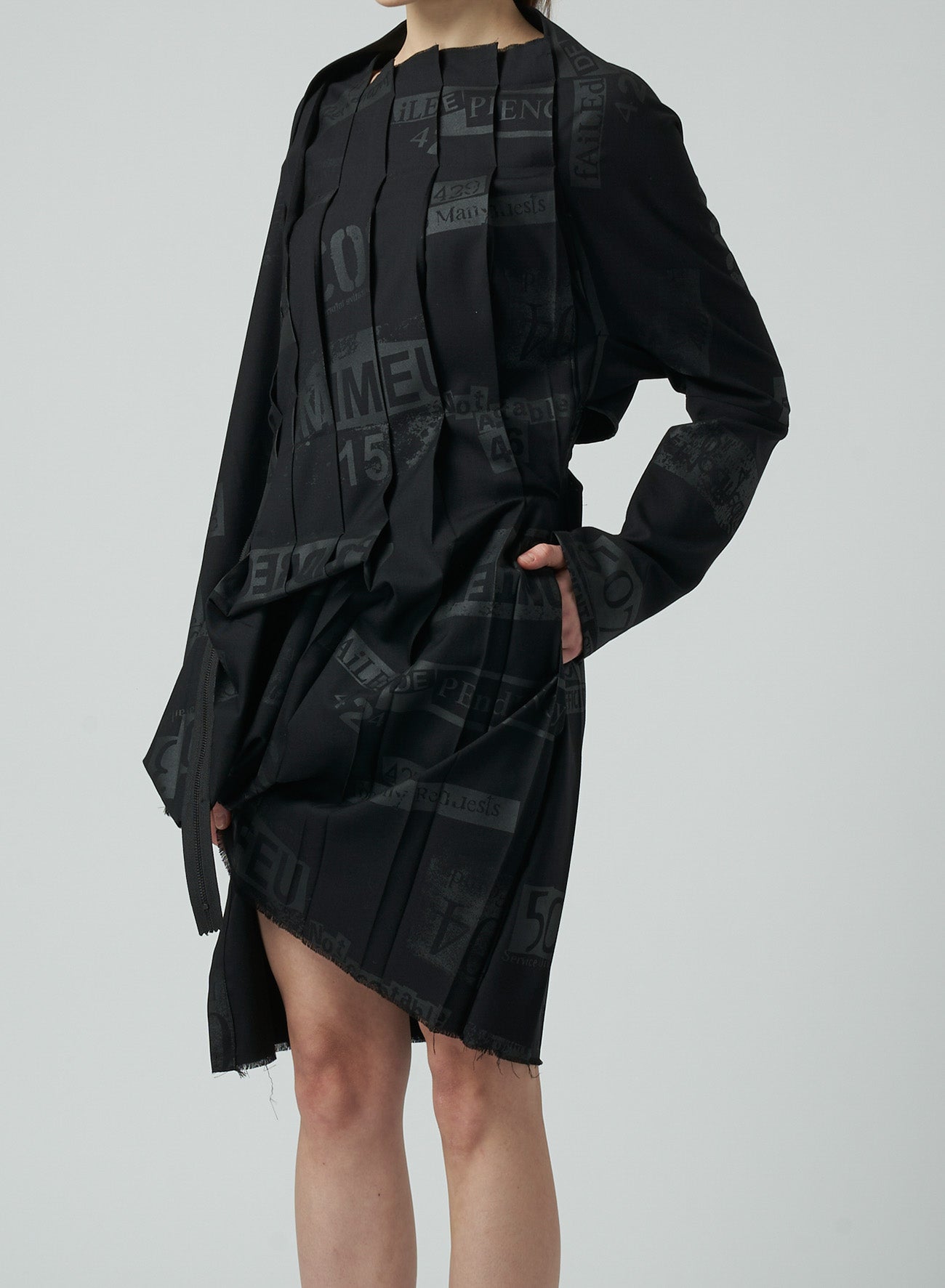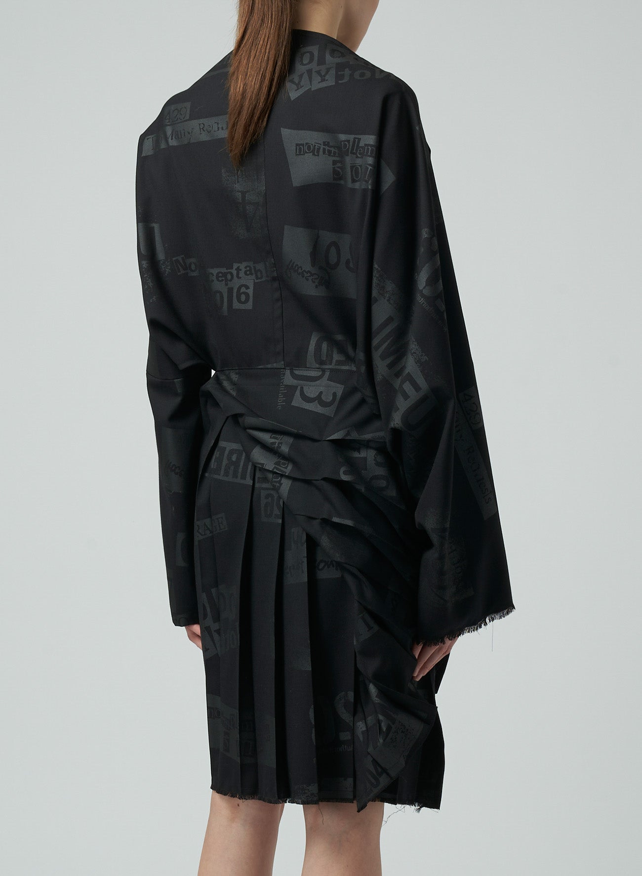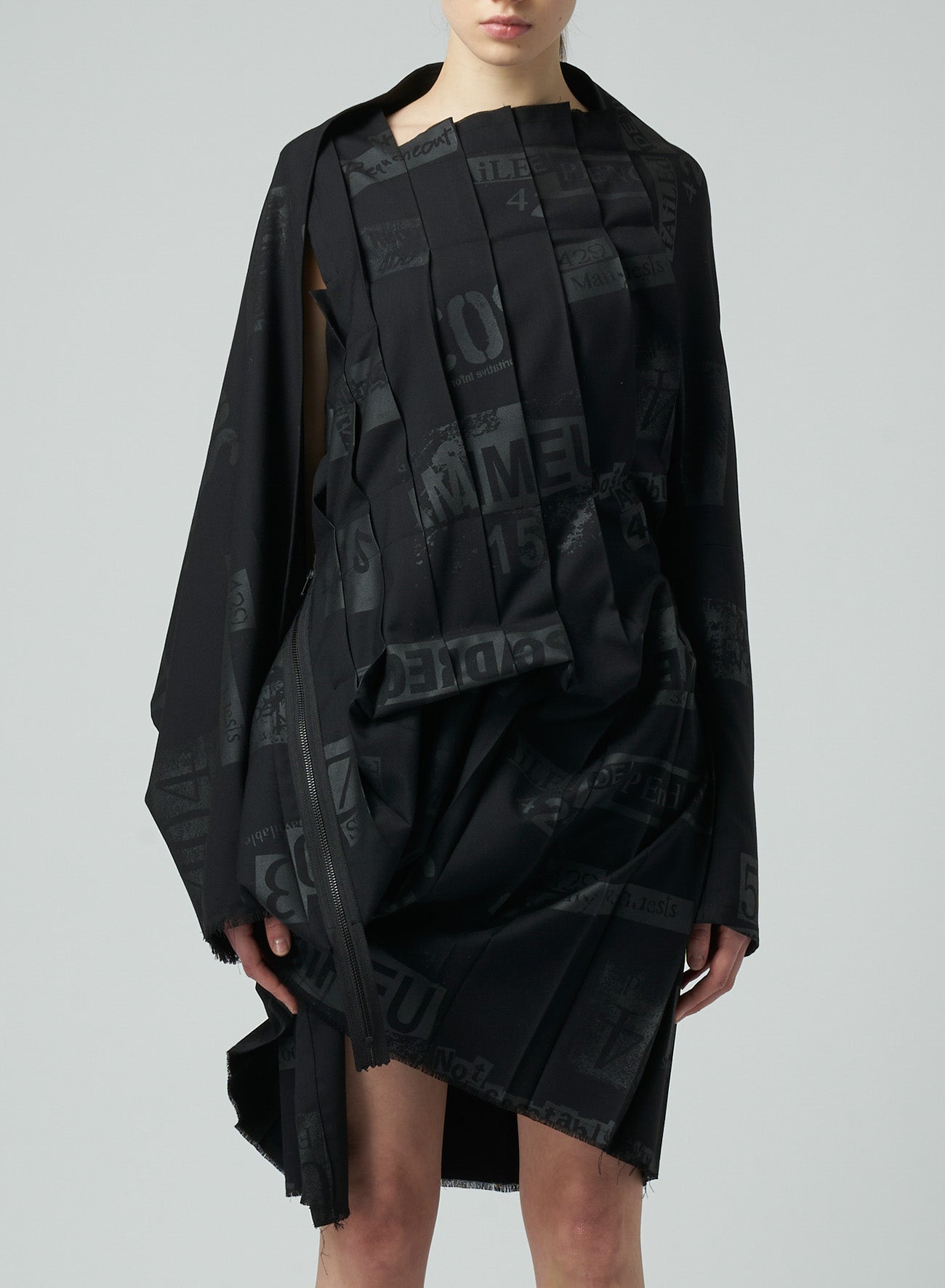 Questo pezzo visivo presenta codici di stato HTTP che esprimono umorismo e angoscia attraverso vari caratteri su un vestito stampato in serigrafia a pigmento. Il design unico combina tessuto plissettato con un orlo arricciato, creando un effetto snellente dalla schiena. Una manica è aperta, permettendo diverse opzioni di stile. Il vestito è lungo fino al ginocchio e abbastanza versatile per essere indossato a strati.