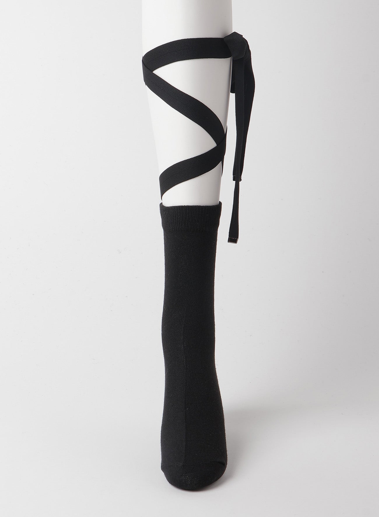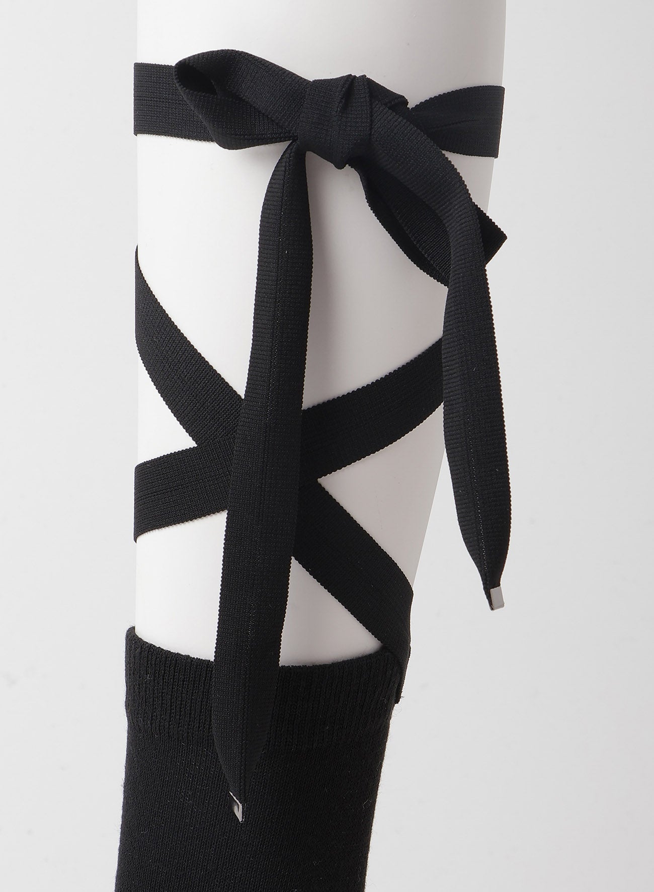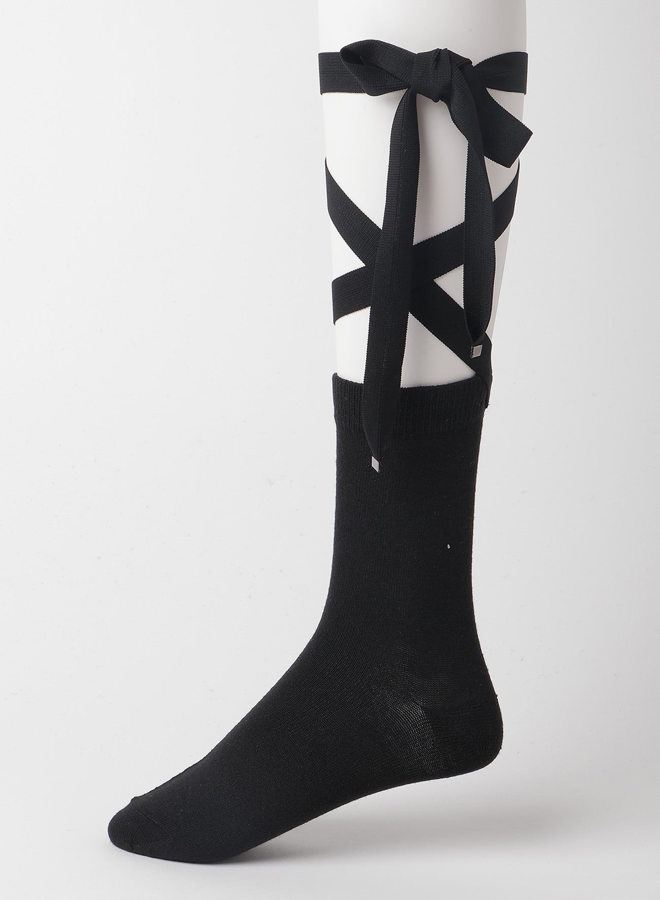 Queste calze in cotone sono realizzate con nastro elastico che forma un motivo unico. Le estremità del nastro sono decorate con punte metalliche, aggiungendo un tocco di eleganza.