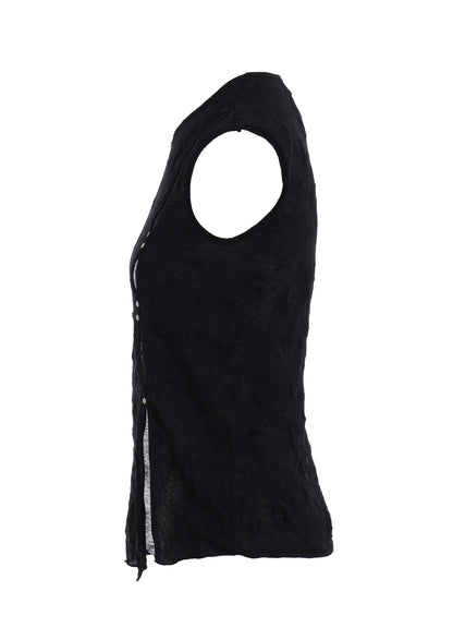 Questo top presenta una texture morbida che combina poliestere e cotone con una maglia semplice, caratterizzata dalla sua trasparenza. Il tessuto è stato ammorbidito per esaltare la texture e l'aspetto naturale. Con un look stropicciato casual, questo capo mantiene un'eleganza, rendendolo versatile per vari outfit.