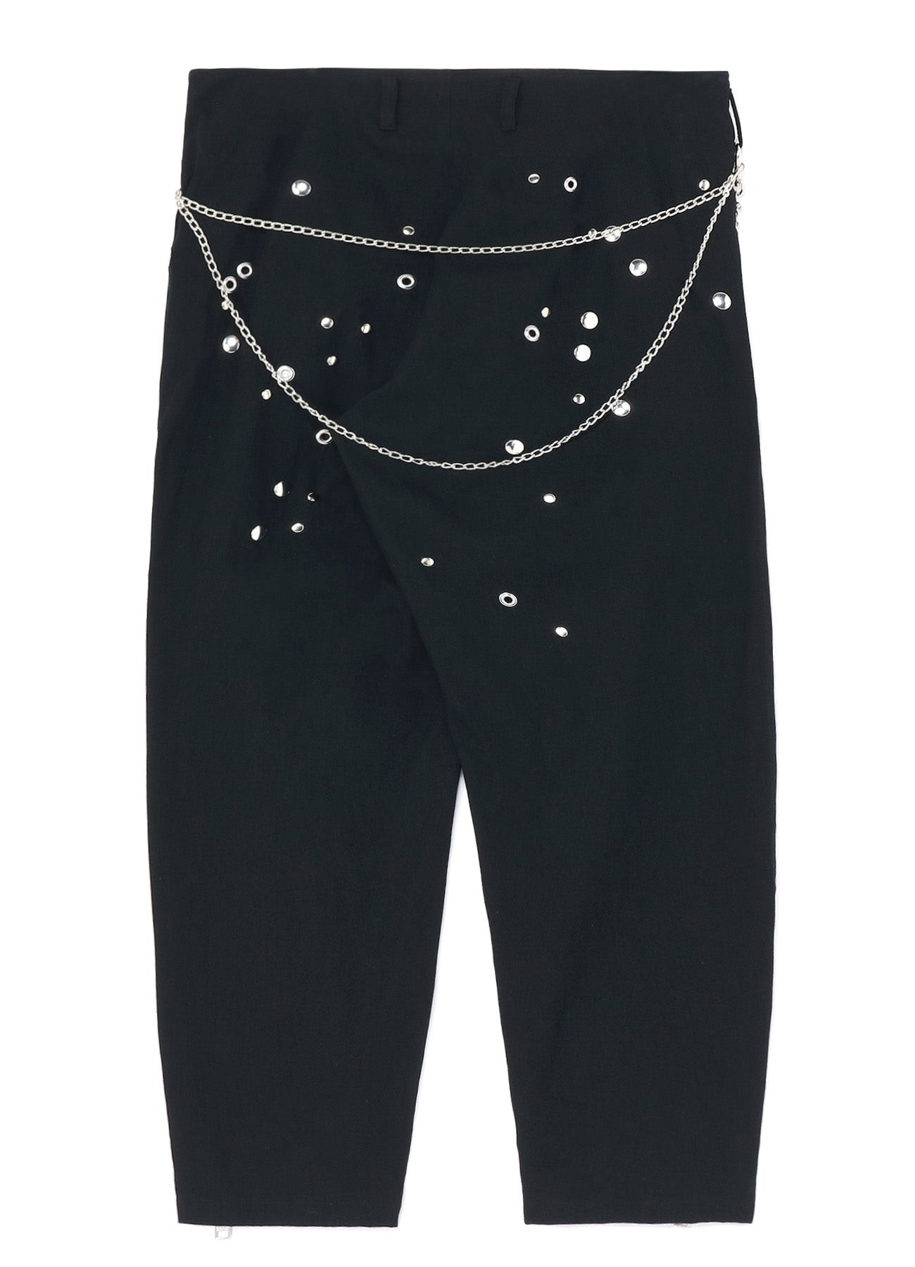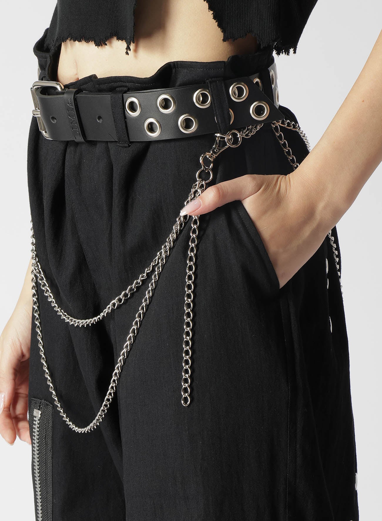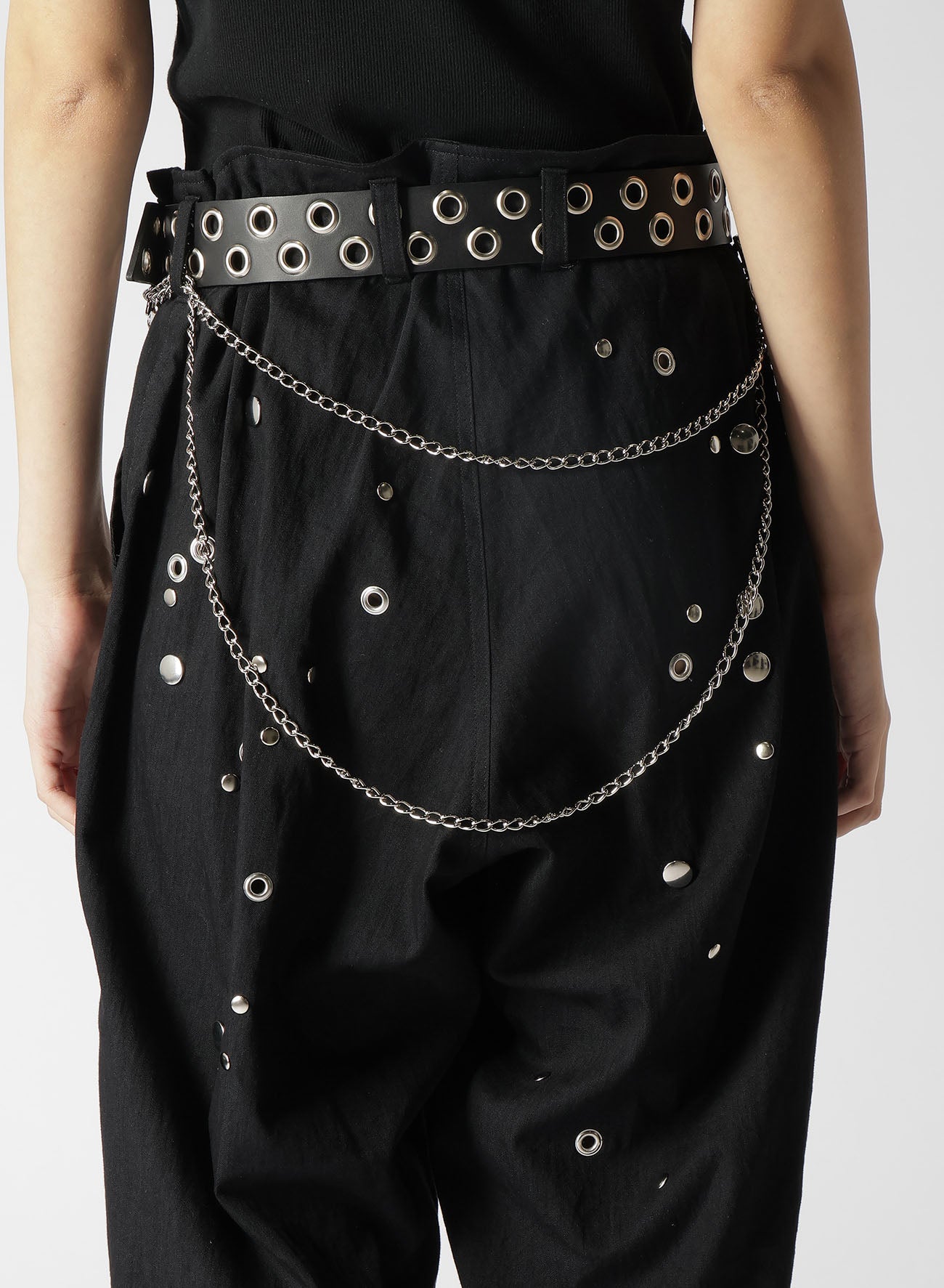 Questo capo presenta un denim nero leggero unico con metalli e sfrangiature applicati a mano, creando un'estetica su misura. La disposizione di elementi come catene e anelli esalta l'unicità di ogni paio. Col tempo, l'aspetto del denim si evolverà e svilupperà un carattere personale.