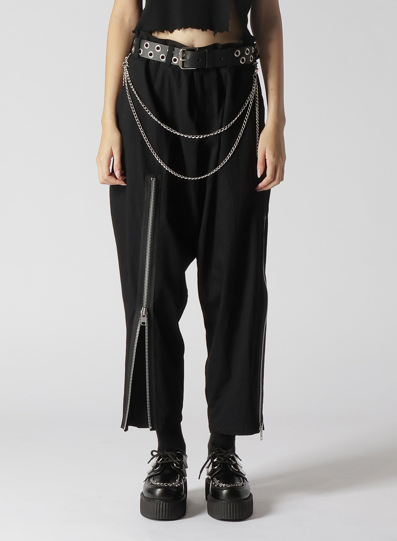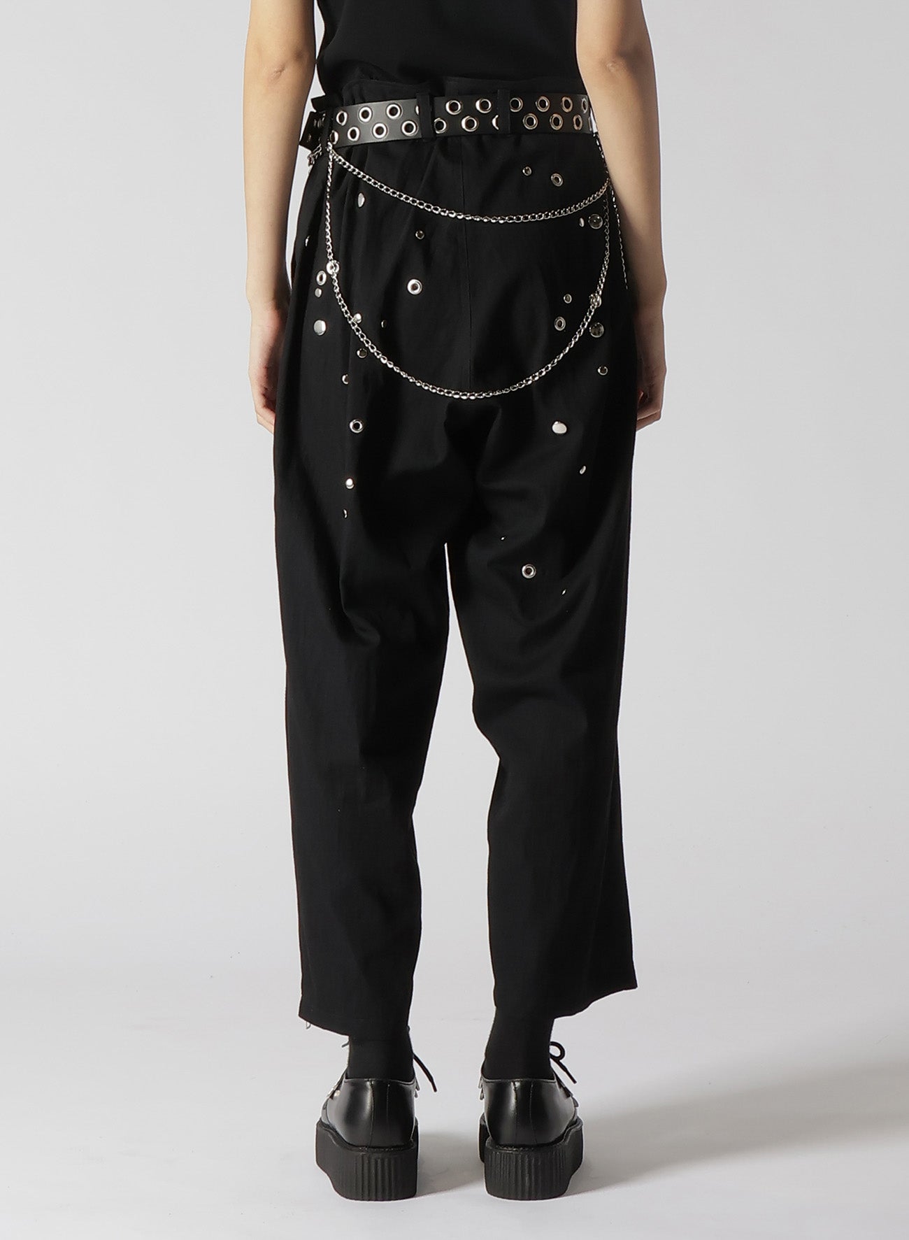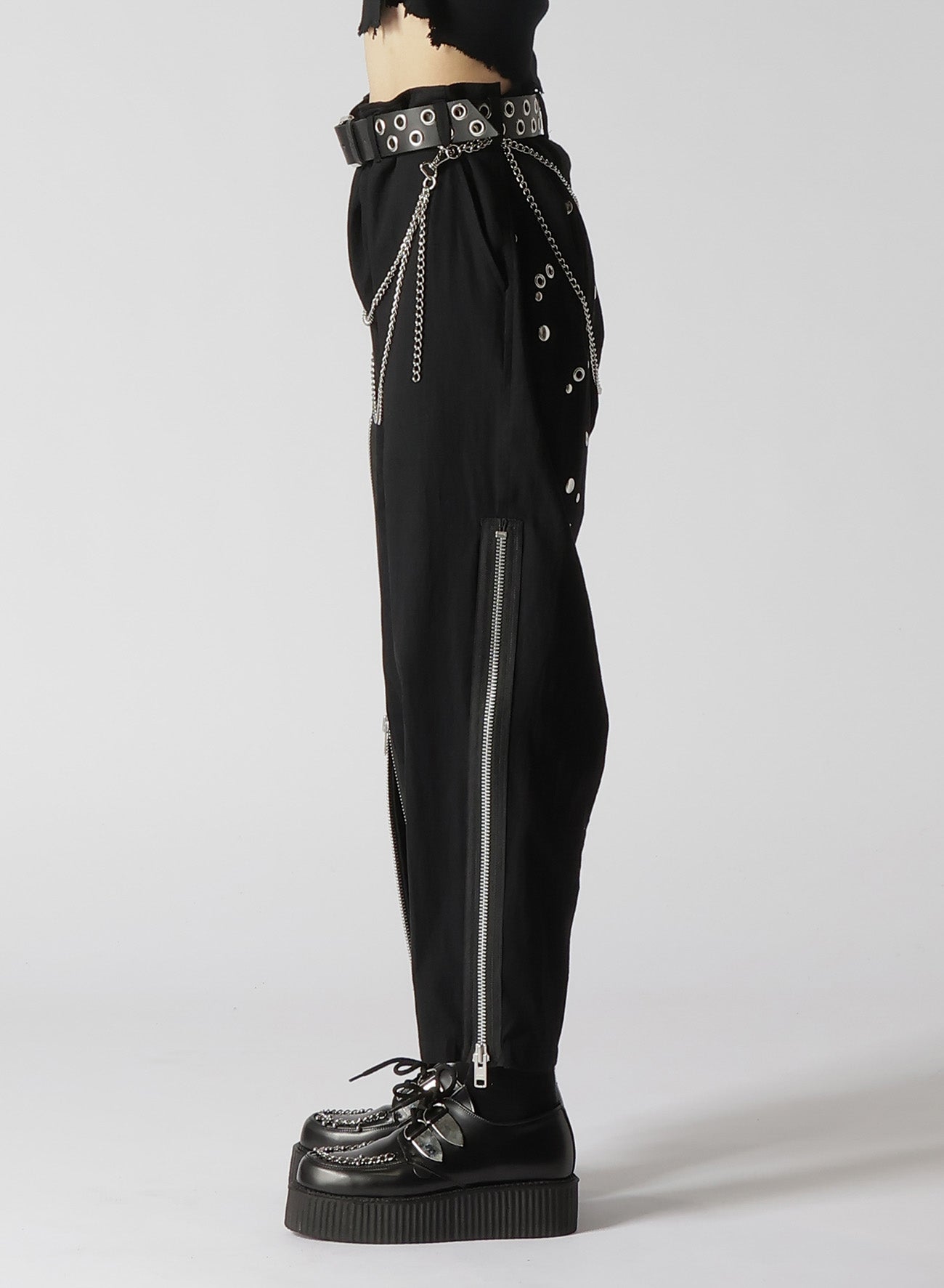 Questo capo presenta un denim nero leggero unico con metalli e sfrangiature applicati a mano, creando un'estetica su misura. La disposizione di elementi come catene e anelli esalta l'unicità di ogni paio. Col tempo, l'aspetto del denim si evolverà e svilupperà un carattere personale.