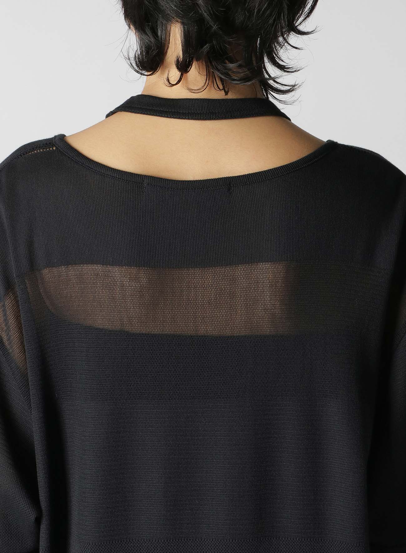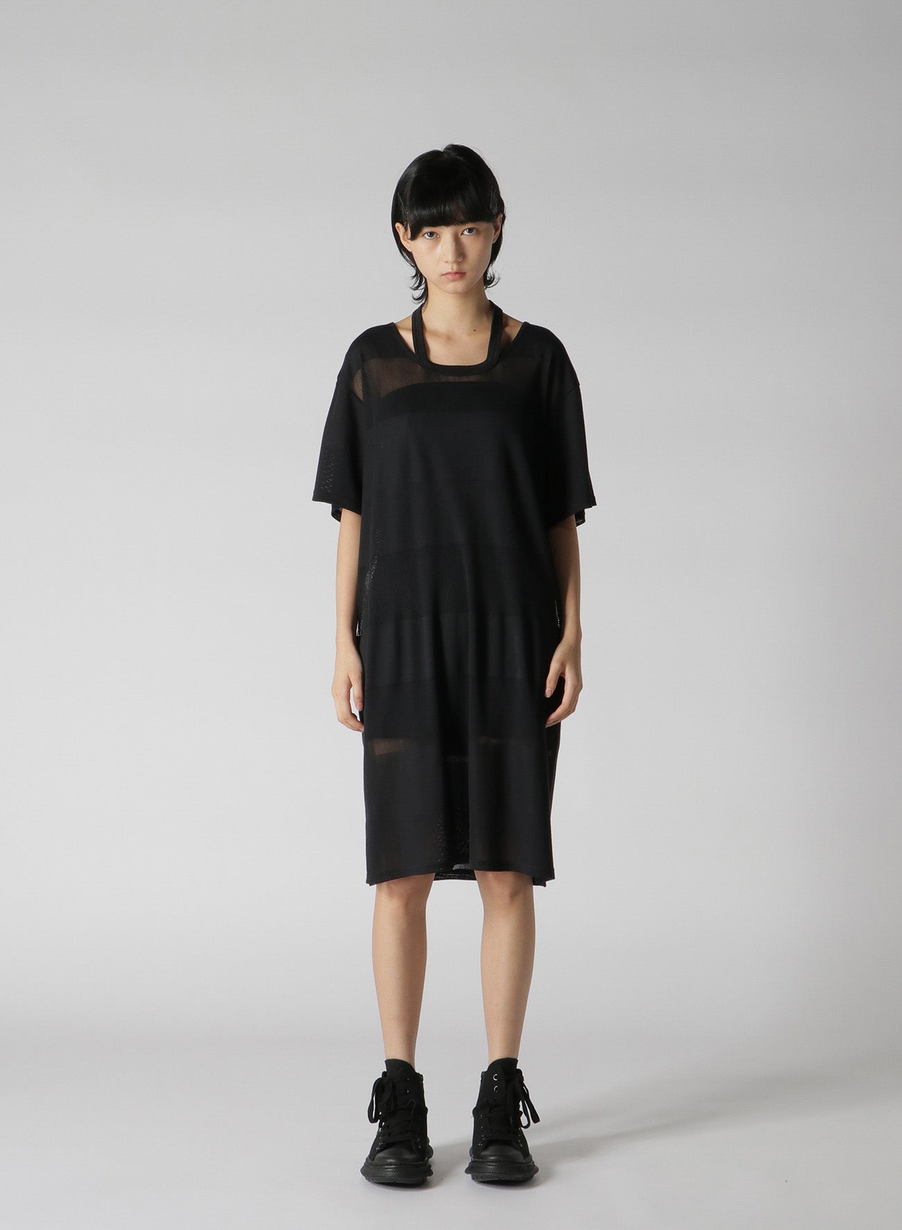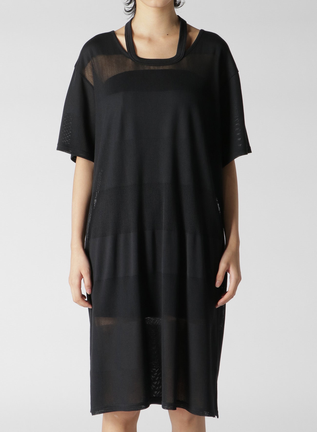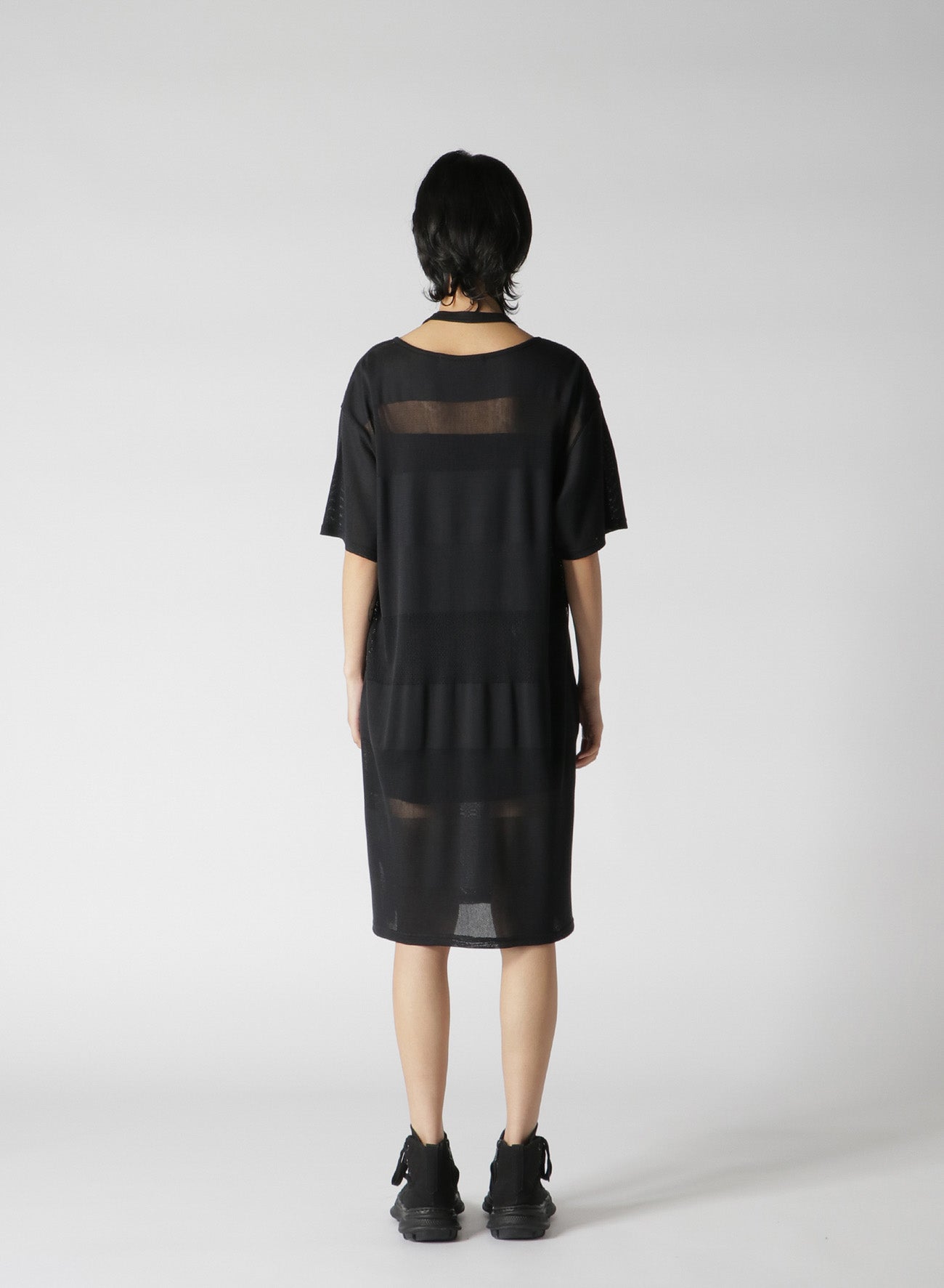 Questo top lungo presenta cinque distinti modelli di maglia disposti a strisce, offrendo sottili variazioni di trasparenza, realizzato in un mix di cotone e rayon per morbidezza e comfort. Il design con scollatura a fessura lo rende versatile come vestito o abbinato a pantaloni.
