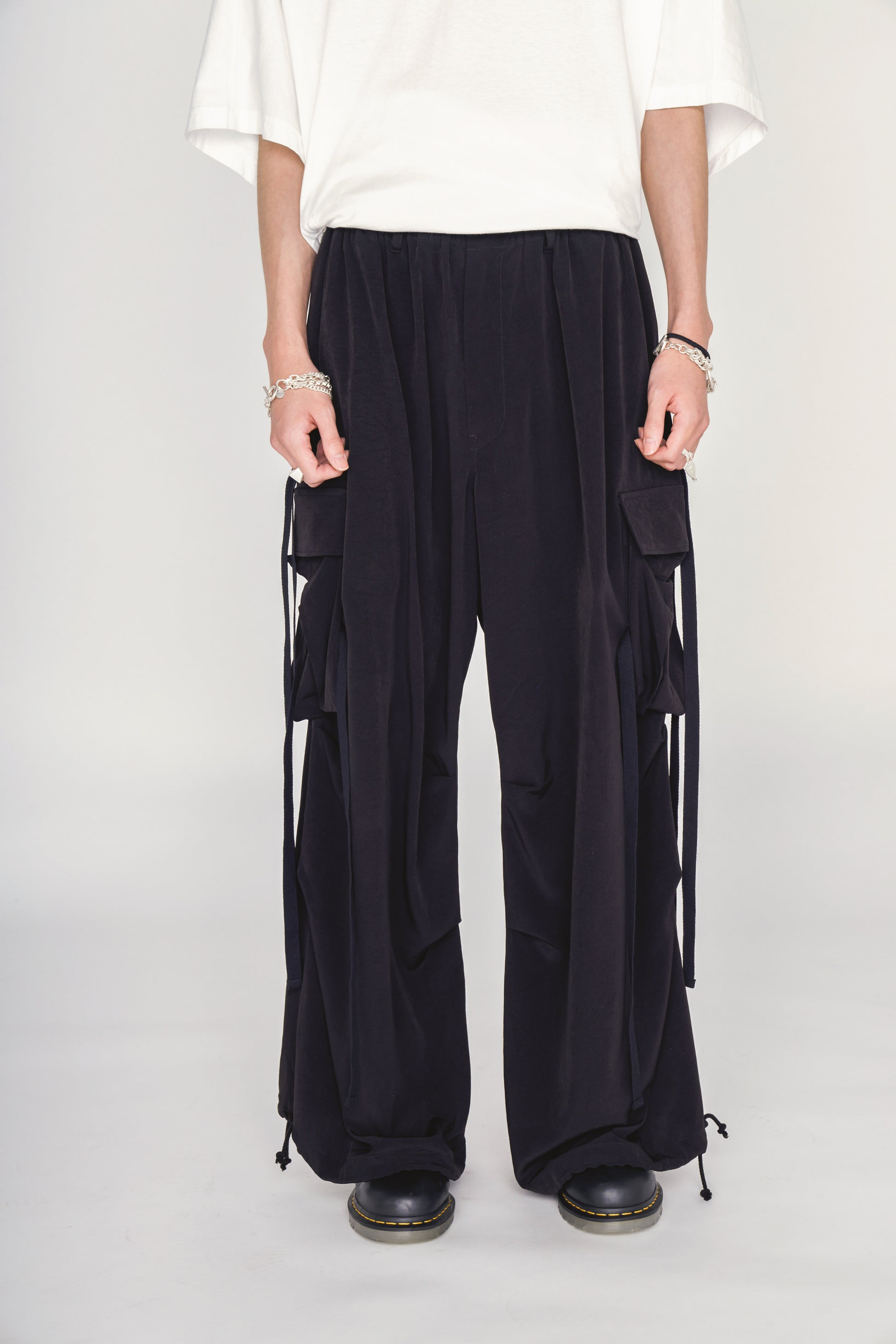 Creati in CREPE de CHINE, i Technopants si distinguono per il drappeggio raffinato e il movimento fluido. La silhouette ampia e le bande mosse dal vento aggiungono un forte accento all'outfit. I laccetti regolabili in vita e al fondo sposano elementi militari con un tocco moderno ed elegante. - Realizzati in CREPE de CHINE per un effetto drappeggiato unico. - Laccetti regolabili in vita e al fondo. - Design accattivante grazie alle bande multiple. - Disponibili in due lunghezze diverse. - Aggiungono profondità e movimento a qualsiasi outfit. - Adatti a occasioni casual e raffinate.