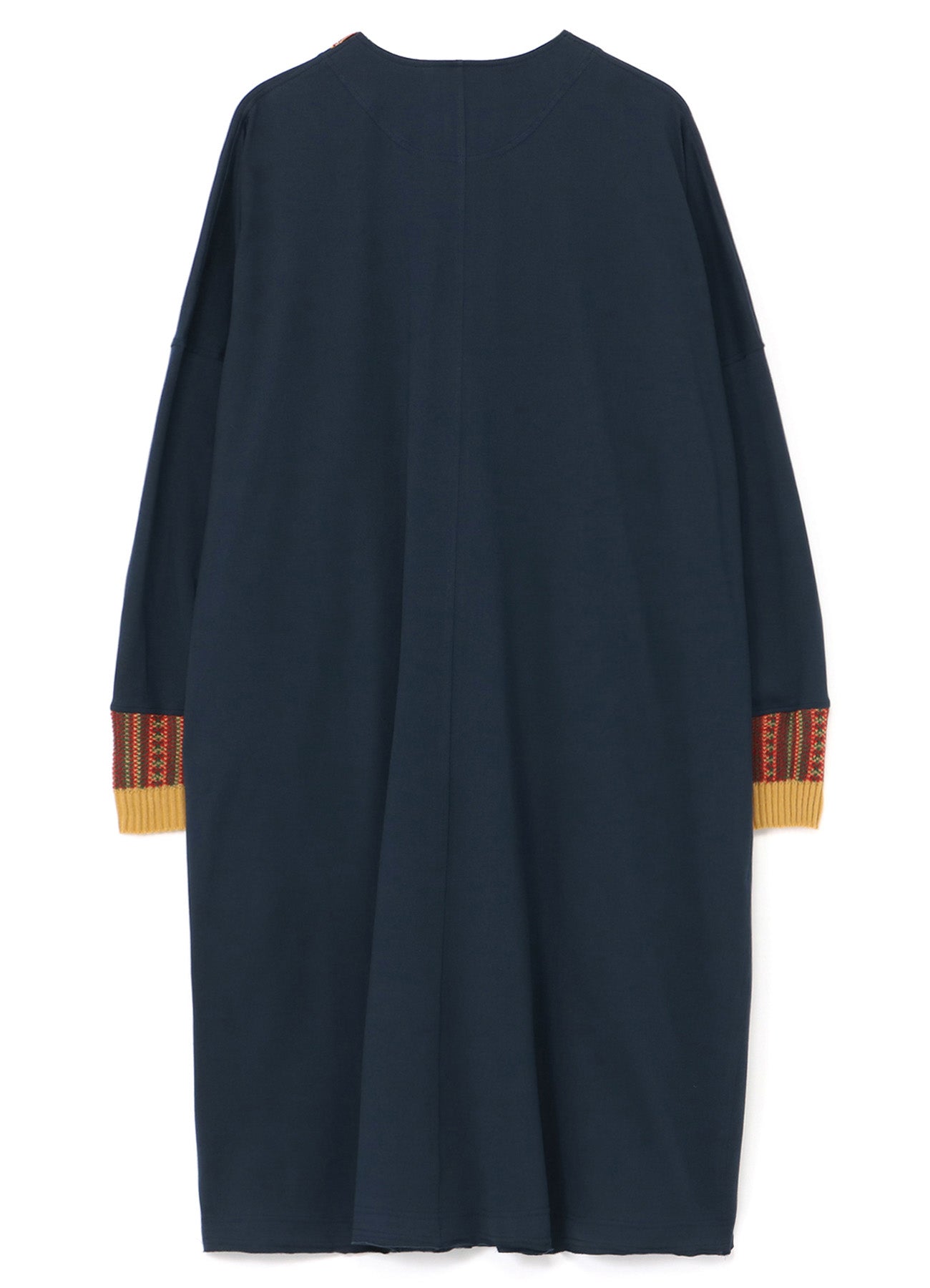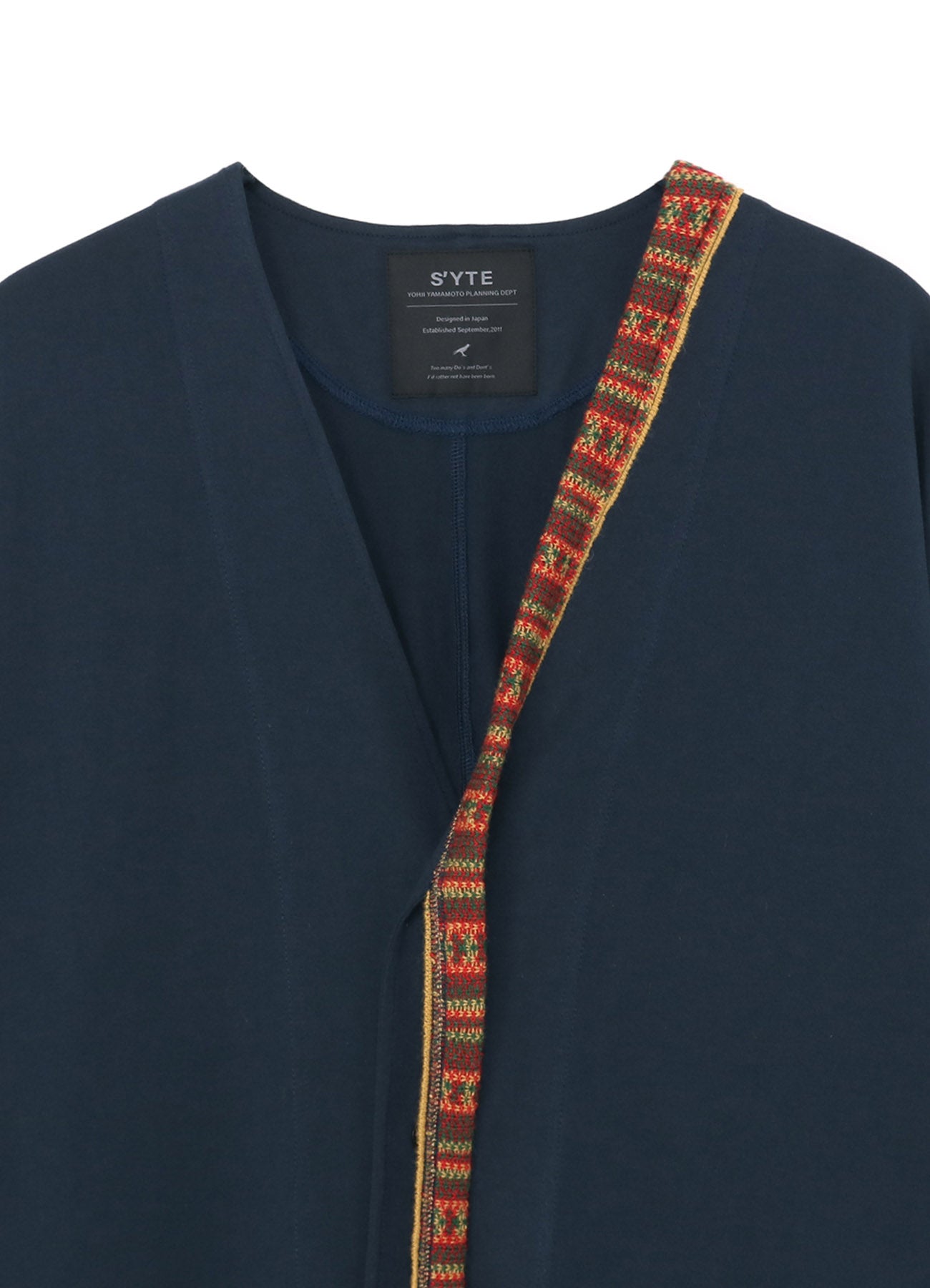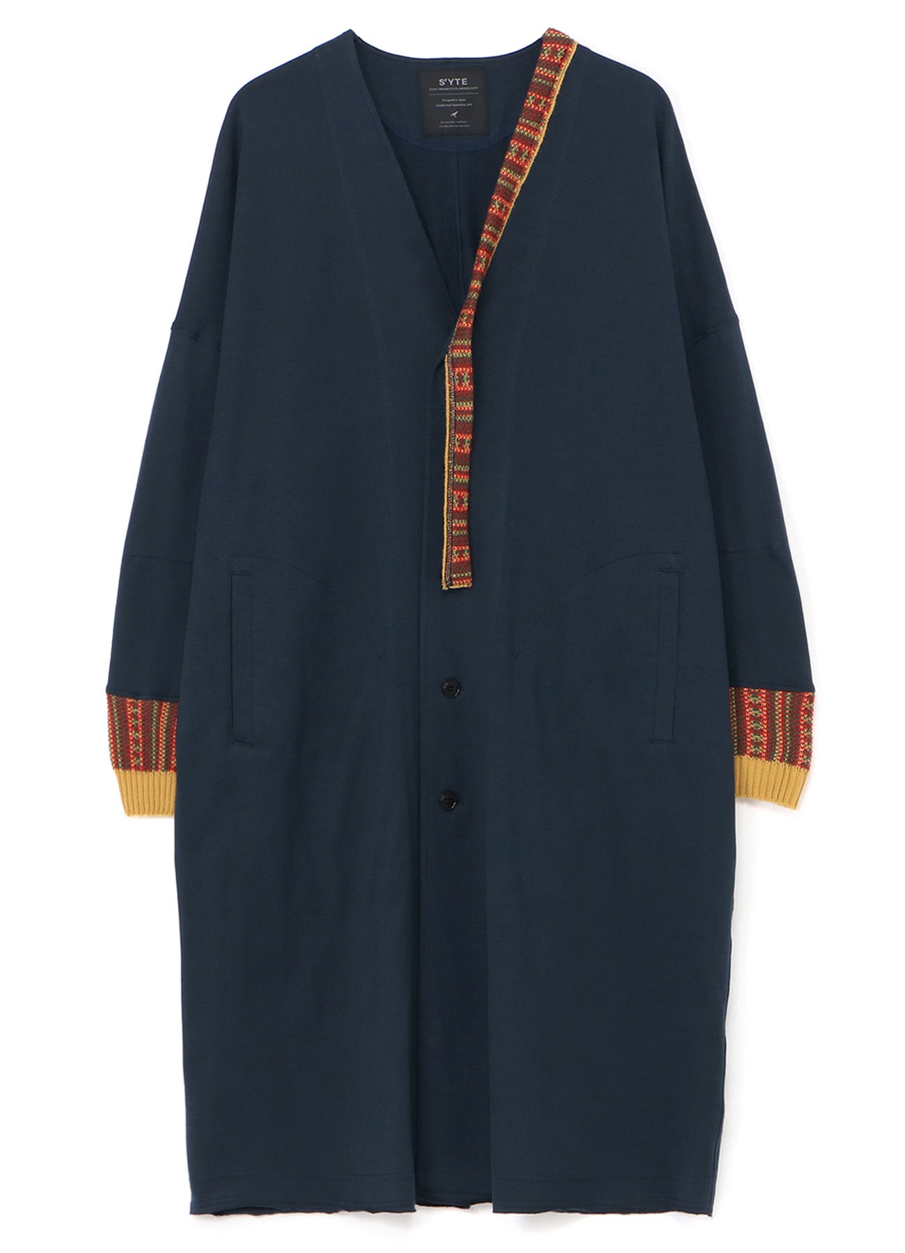 Questo cardigan lungo senza colletto presenta un motivo etnico a bordo lavorato a maglia sul collo e sui polsini. Le cuciture delle spalle scese aggiungono una silhouette rilassata, con un ulteriore tessuto a maglia nel colletto e una lunghezza lunga e drappeggiata che crea un movimento dinamico. Il tessuto leggero e sottile lo rende perfetto per essere indossato a strati, offrendo una vestibilità comoda. Ideale per l'uso quotidiano con il suo design accattivante.