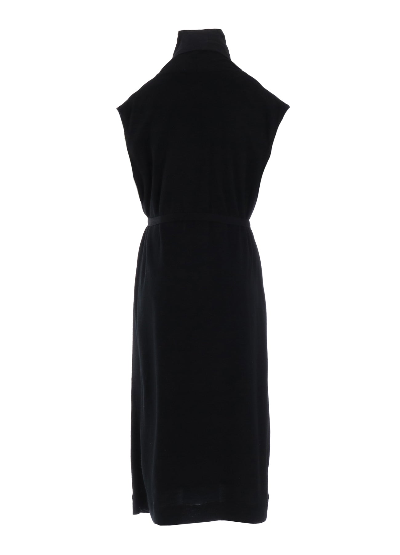 This long gilet features elegant drapery with a double-layered design. The exterior uses bulky plain stitch fabric from long-fiber wool, while the interior is made from cotton silk, ensuring warmth and a smooth feel. The removable waist cord allows for customizable styling.