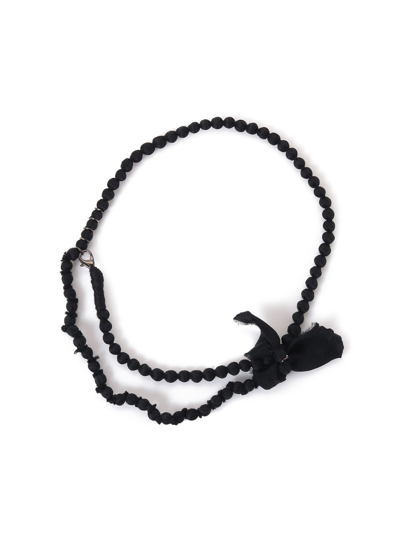 This silk ball necklace, a painstakingly crafted accessory with each ball wrapped in silk by artisans, allows versatile styles. Change the fastening position to customize your look. Drape one side and tie it for a layered accessory.