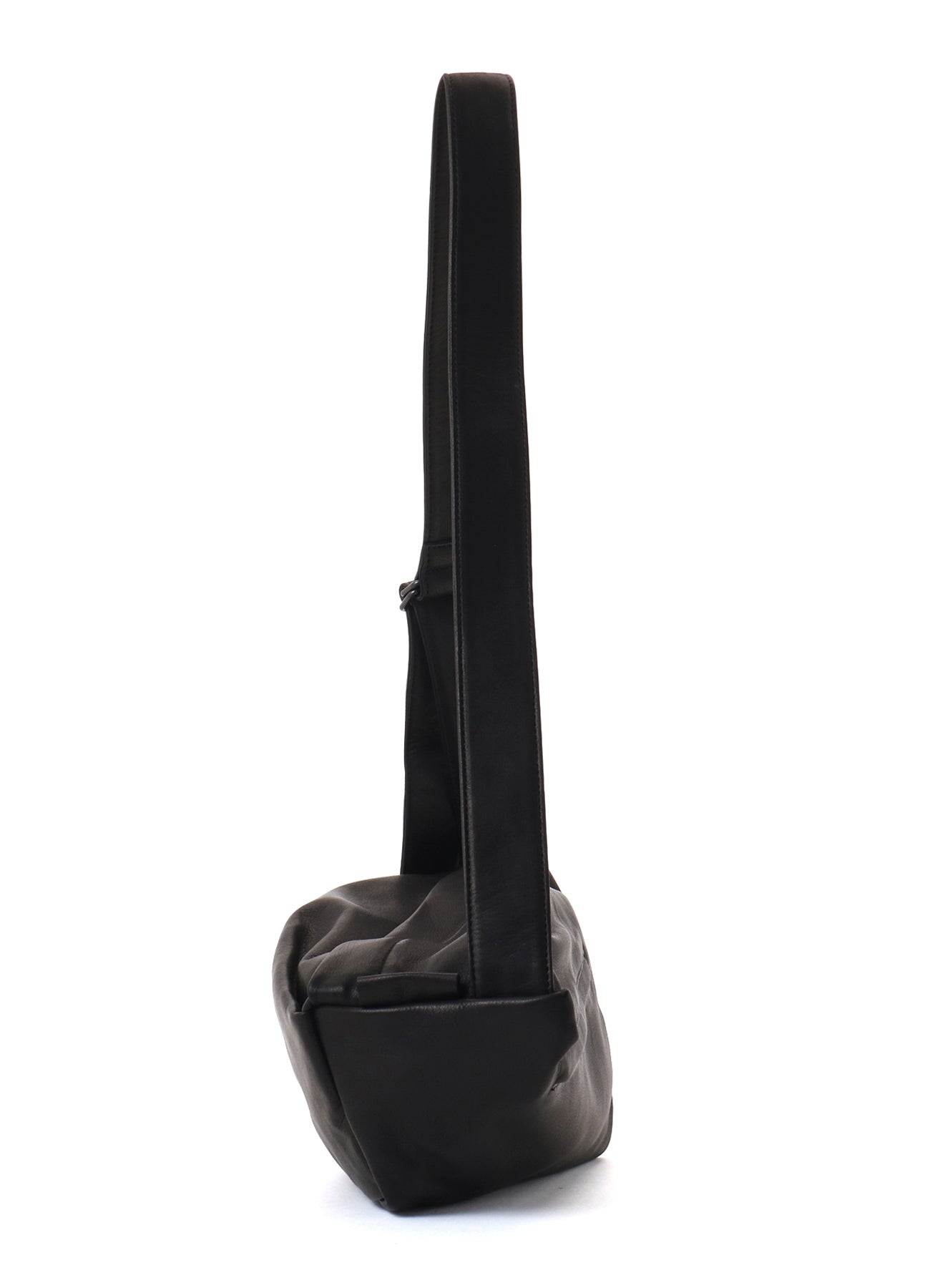 This shoulder bag is crafted from soft leather and features an intricate design formed by joining two flat patterns in a complex manner, enhanced by creating pleats for a three-dimensional shape.