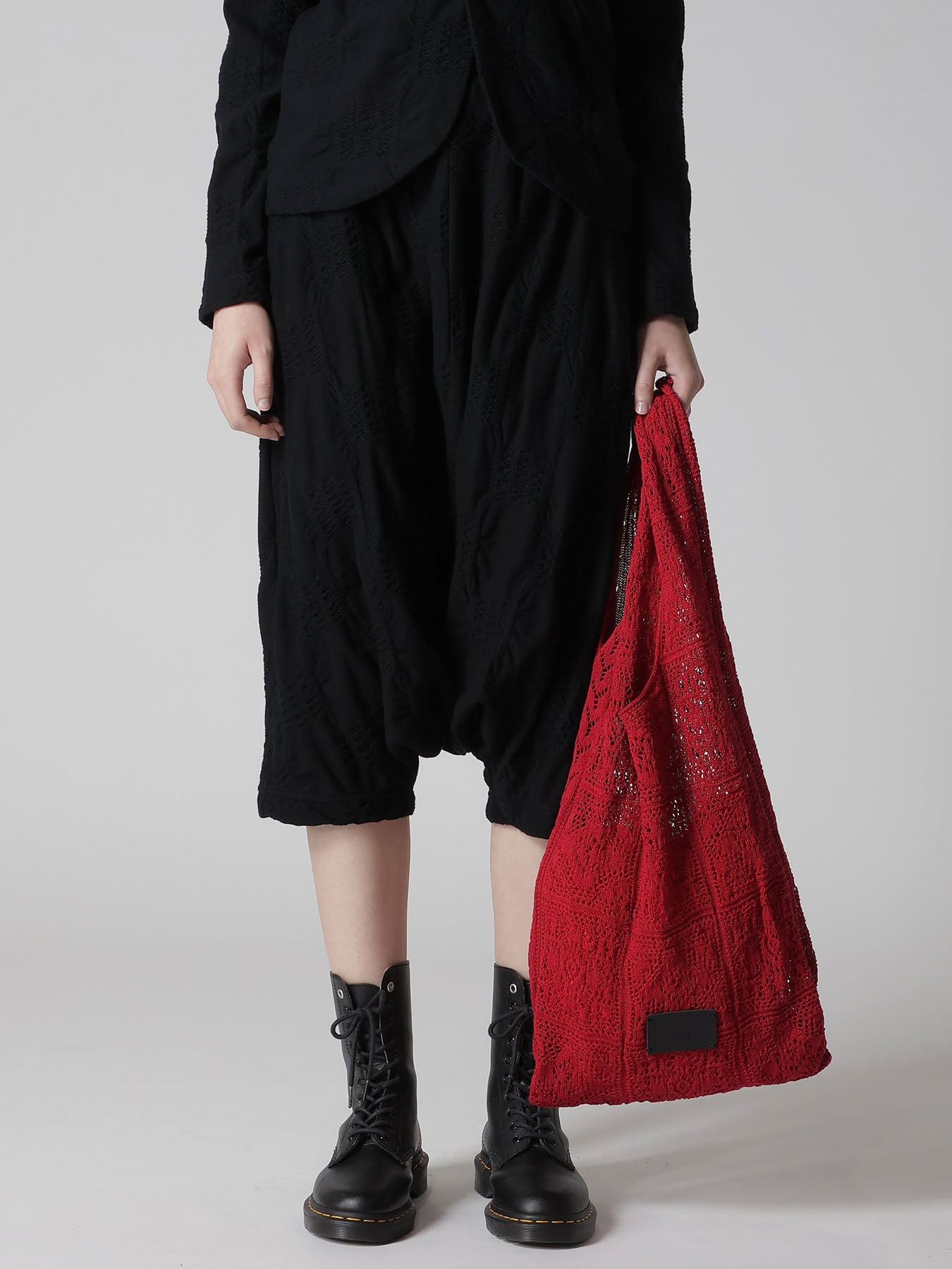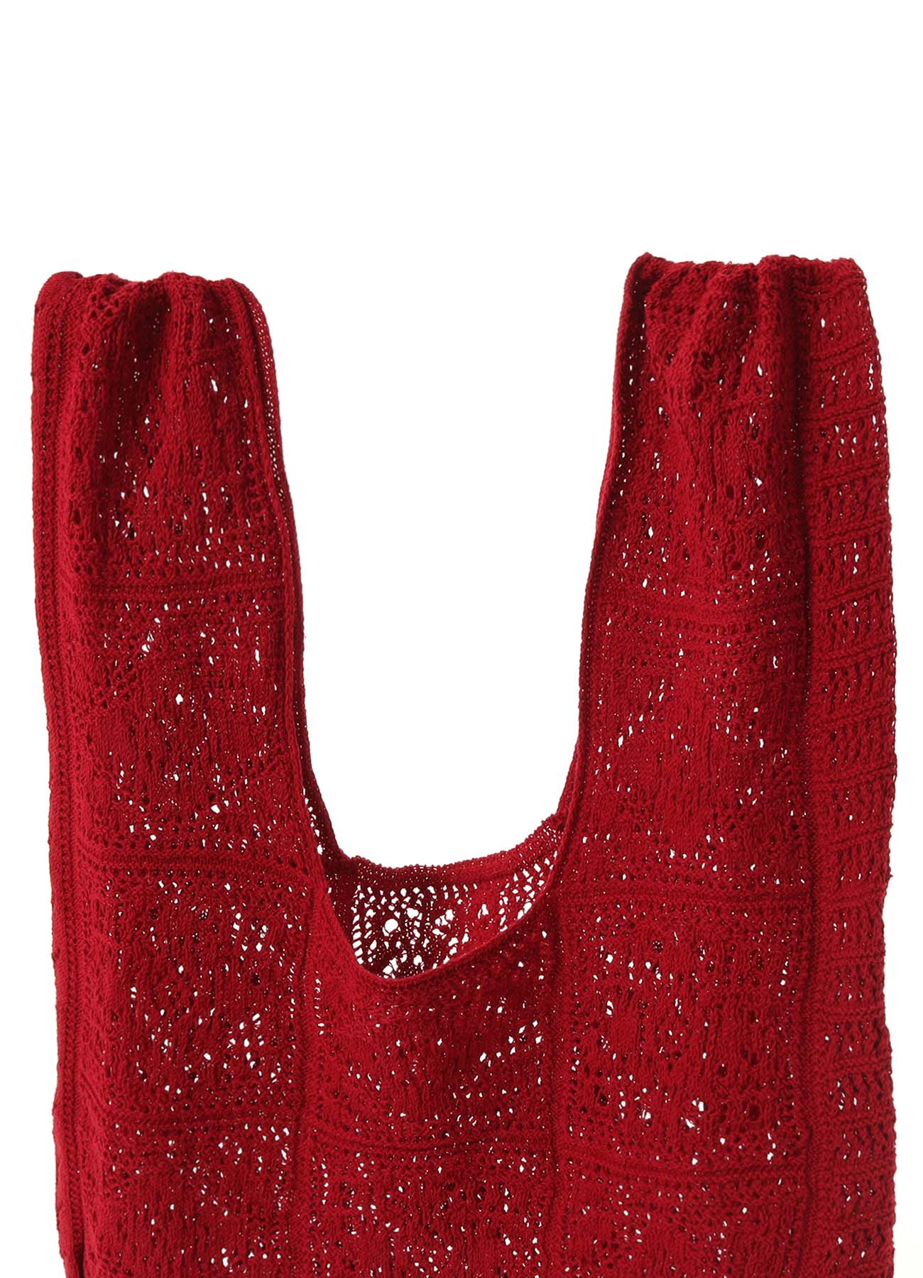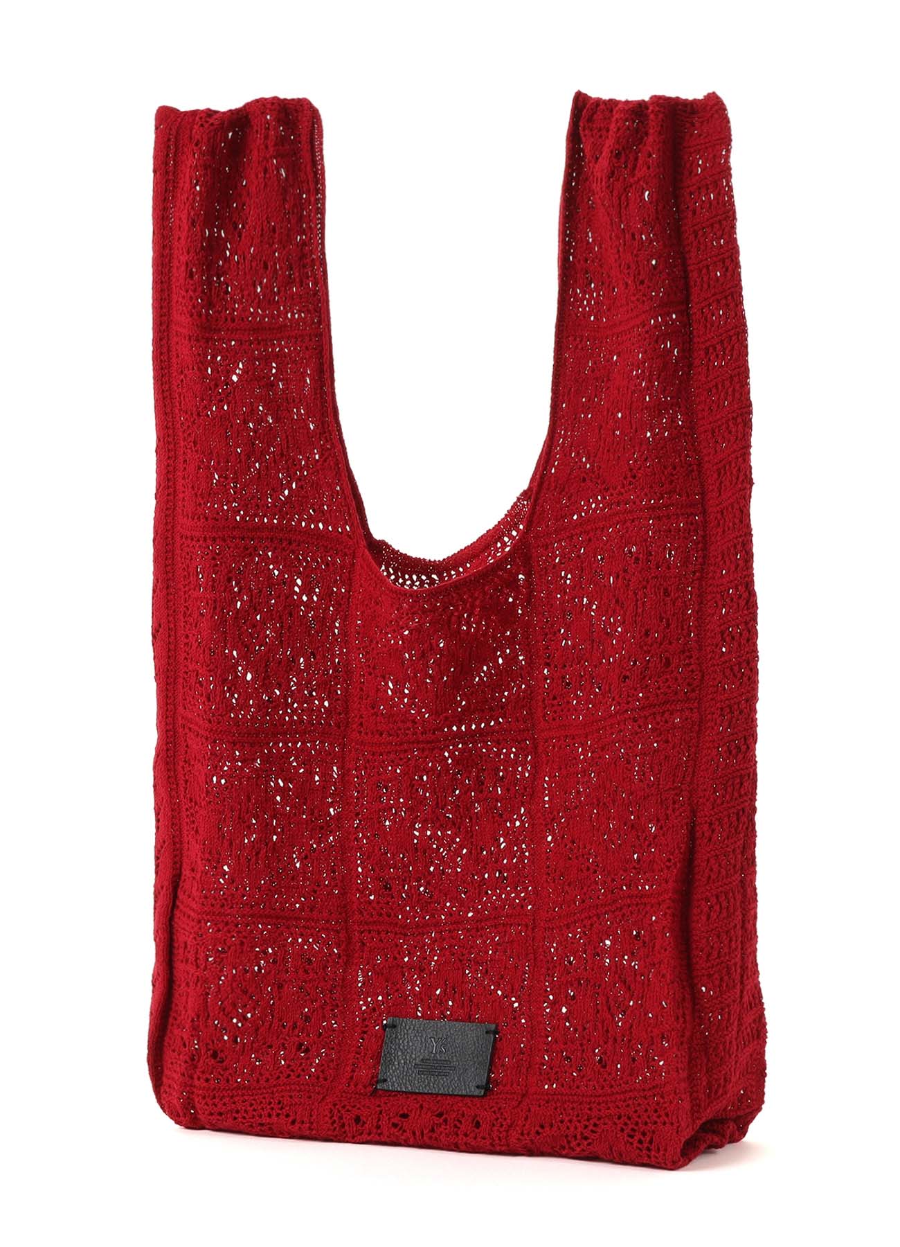 This knit tote features an original pattern inspired by Mexican tiles, secretly embedding a "Y" motif. The design includes an inner pouch. The delicate fabric requires caution to avoid snags and pulls; avoid placing heavy or sharp objects inside.
