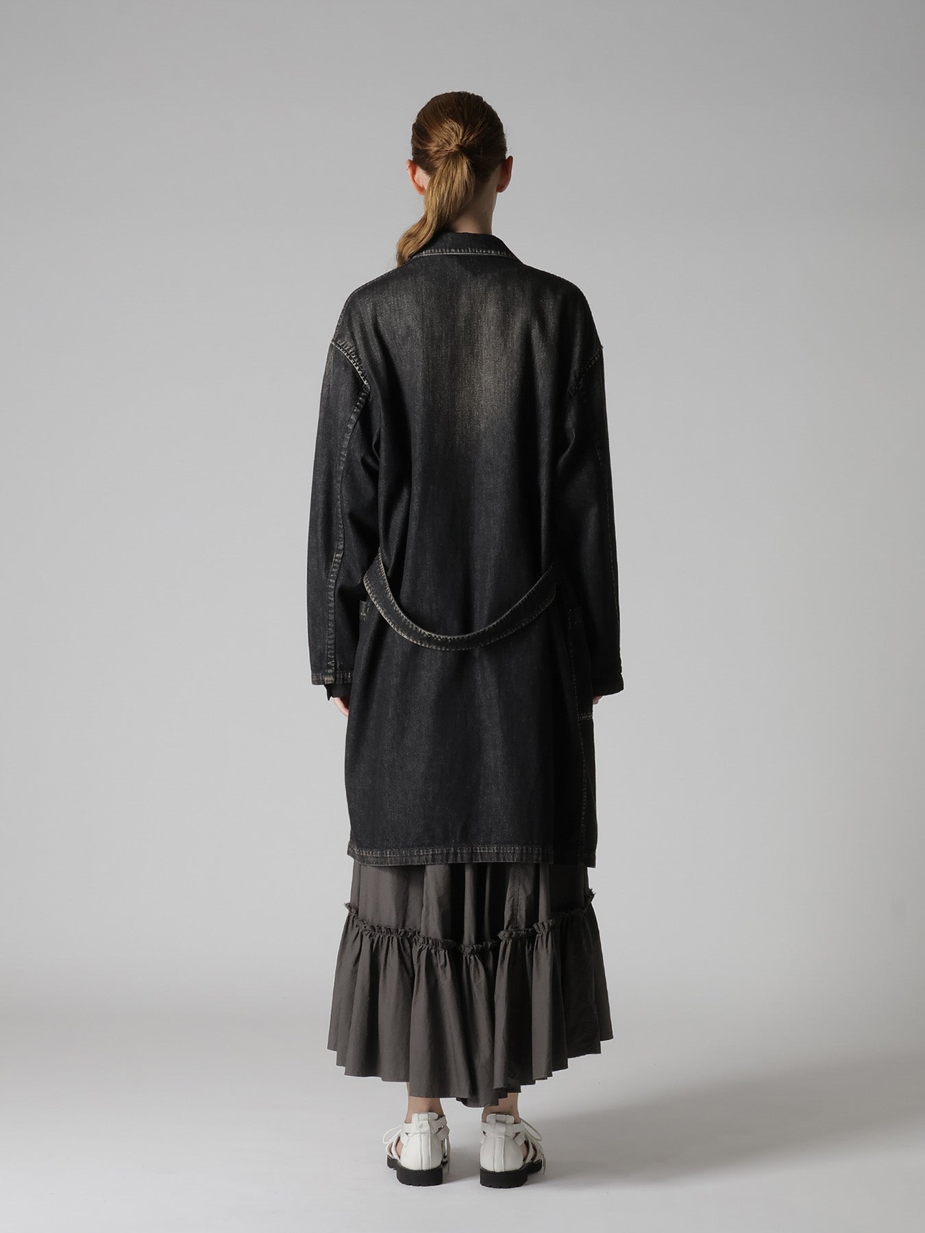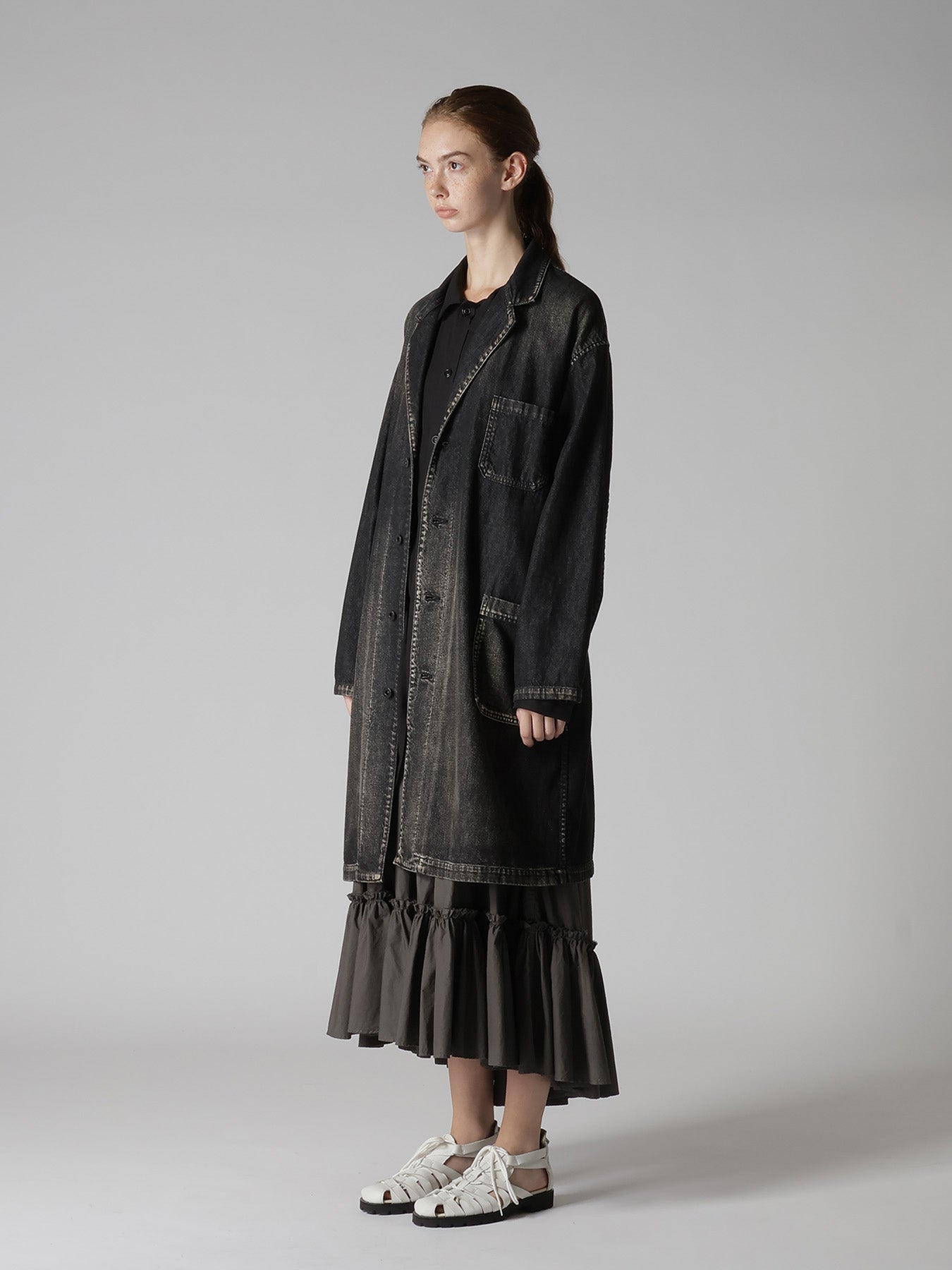 This season's work jacket from Spotted Horse Craft, featuring a Magic Wash for a natural gradient effect, has been appreciated every season. The jacket boasts a menswear-inspired oversized silhouette. Due to the hand-crafted process, each piece is unique. Be cautious of potential color transfer during wear and washing.