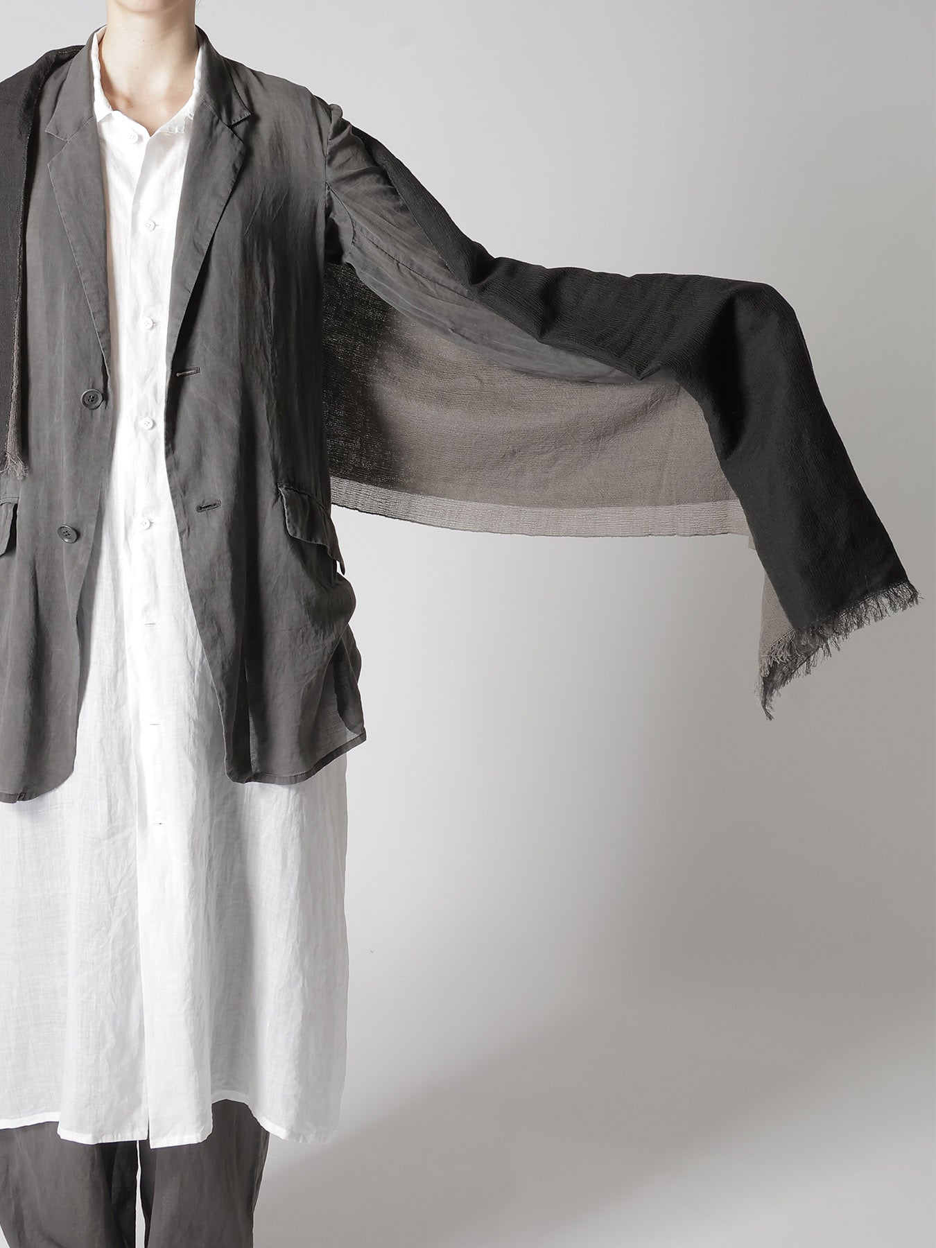 This stole features a two-piece wool design, combining multiple colors. Different wrapping methods allow you to vary the color display and expression. Due to the natural characteristics of the material, be cautious of pilling or snags from friction or catching.