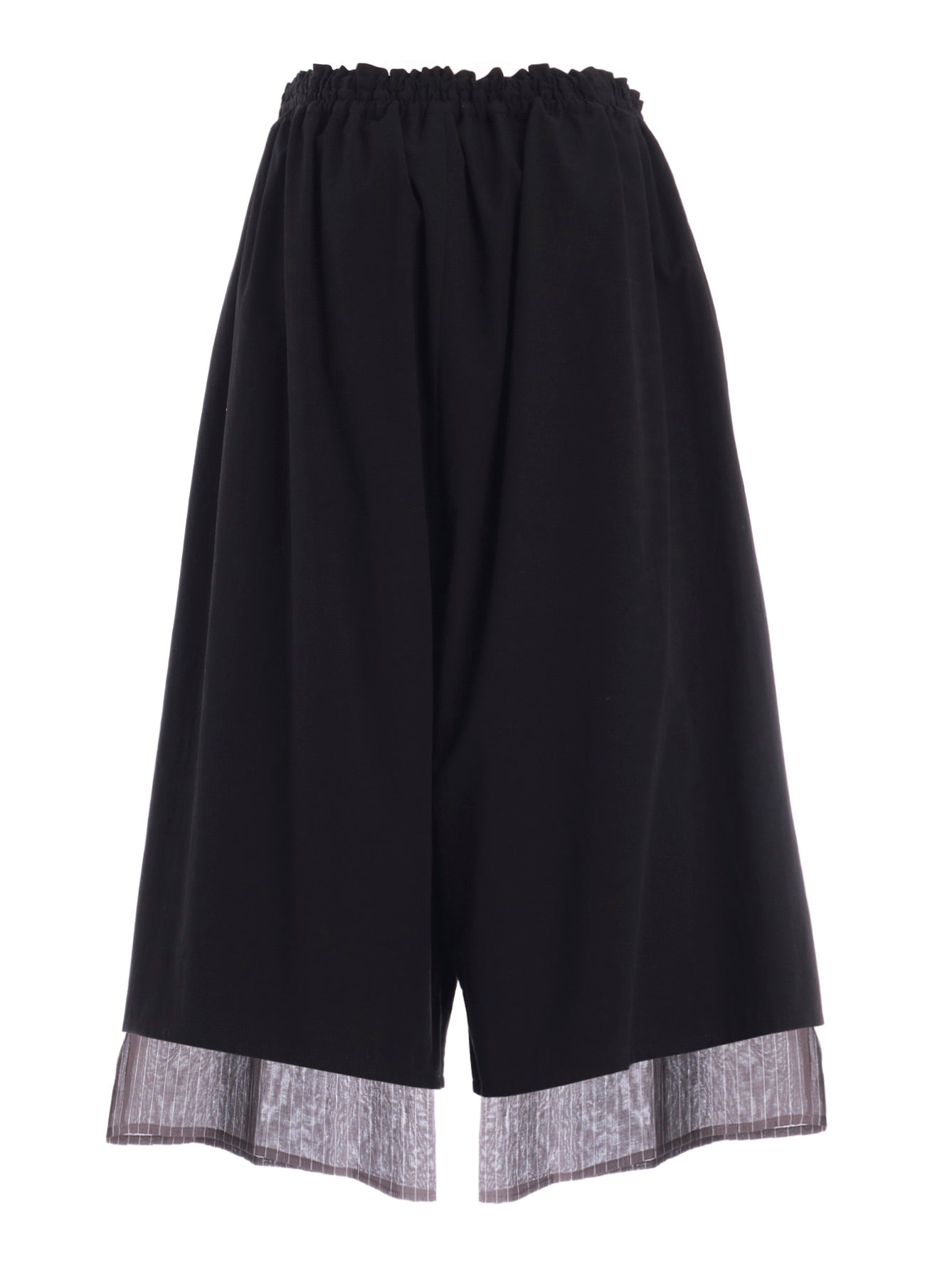 These cotton pants feature a distinctive blend of natural wrinkles and soft puffiness. The adjustable waist includes an elastic band and drawstring for a comfortable fit. The pants are highlighted by a stripe fabric peeking out at the hem, adding a unique accent.