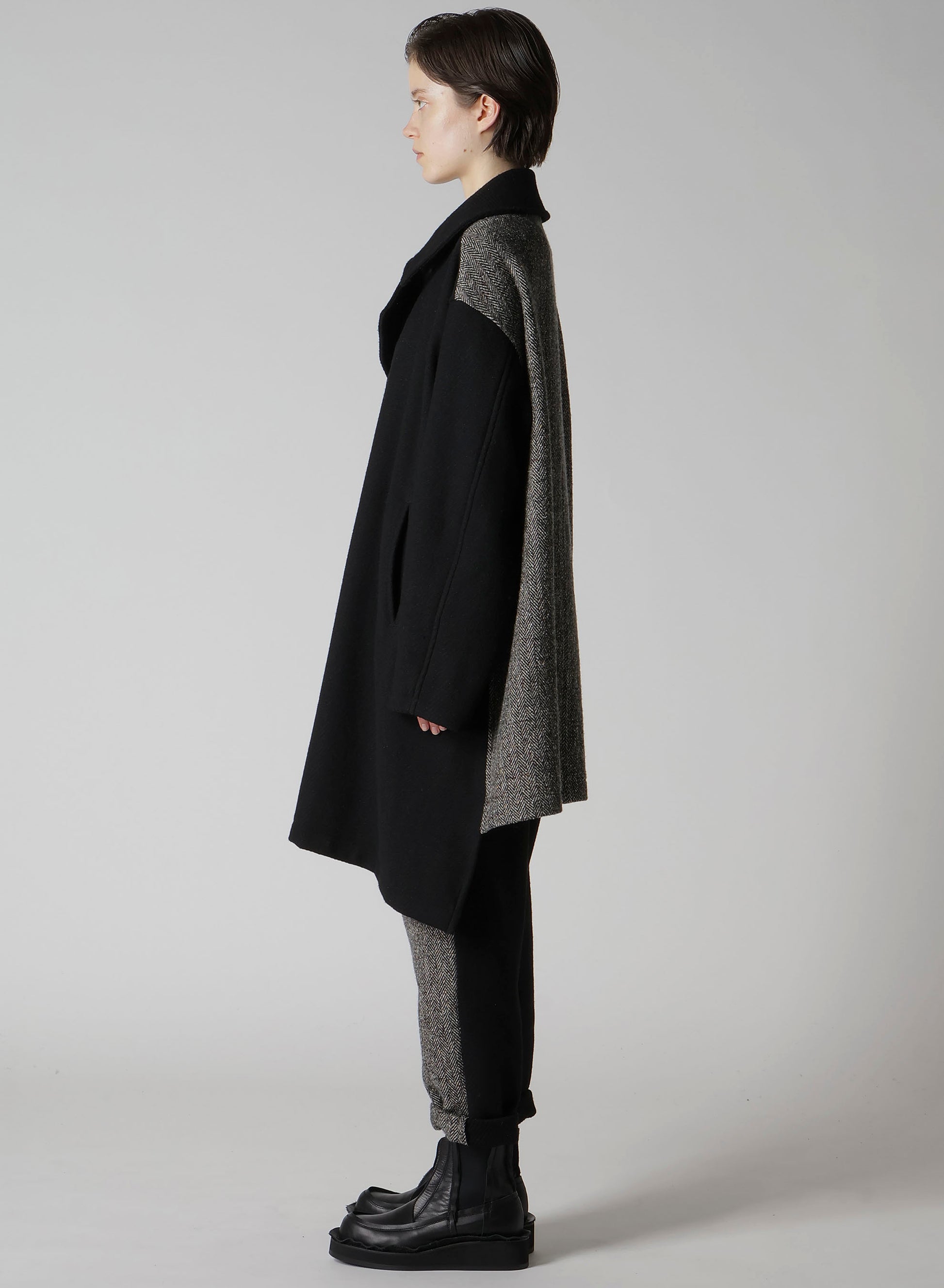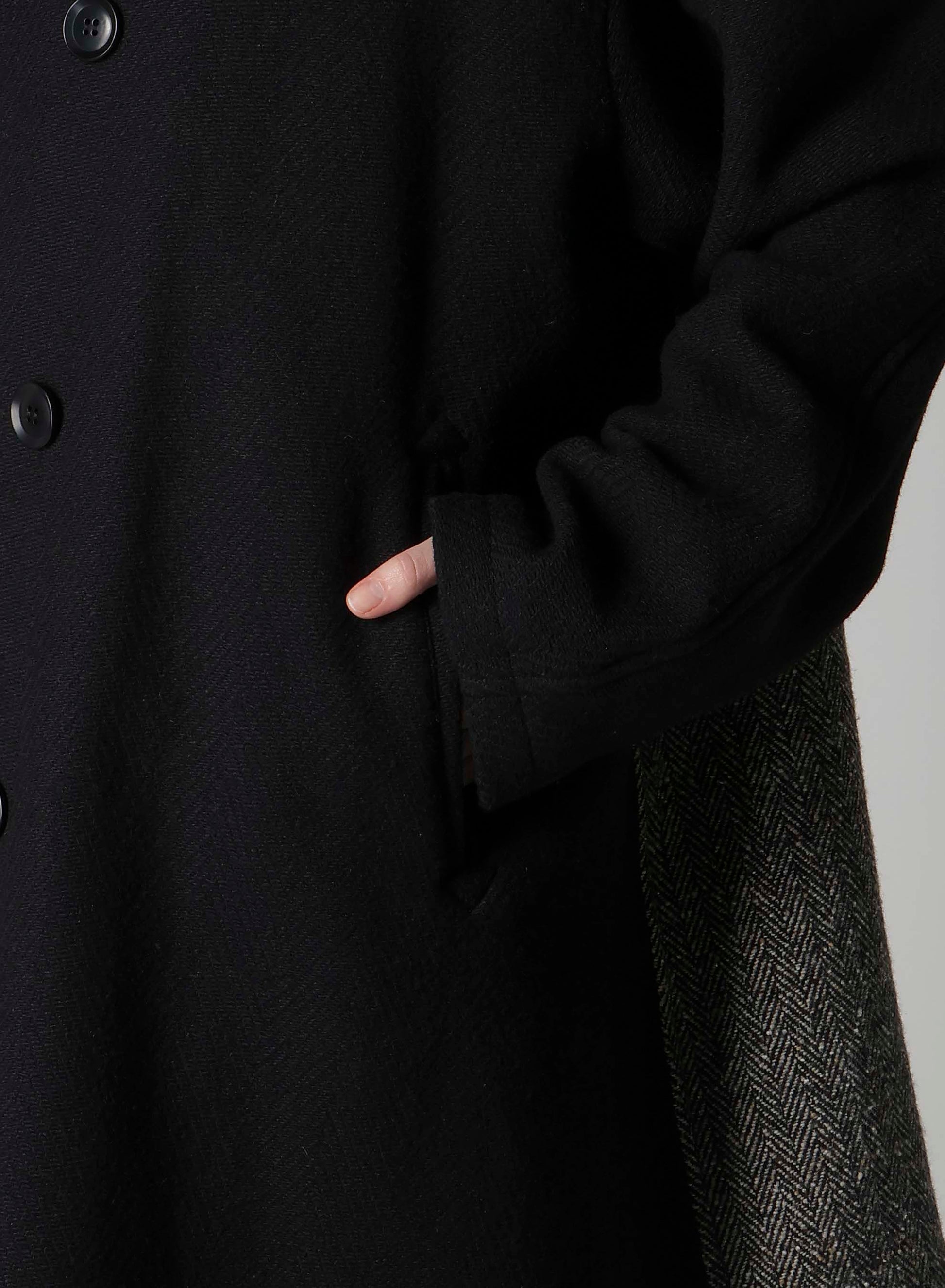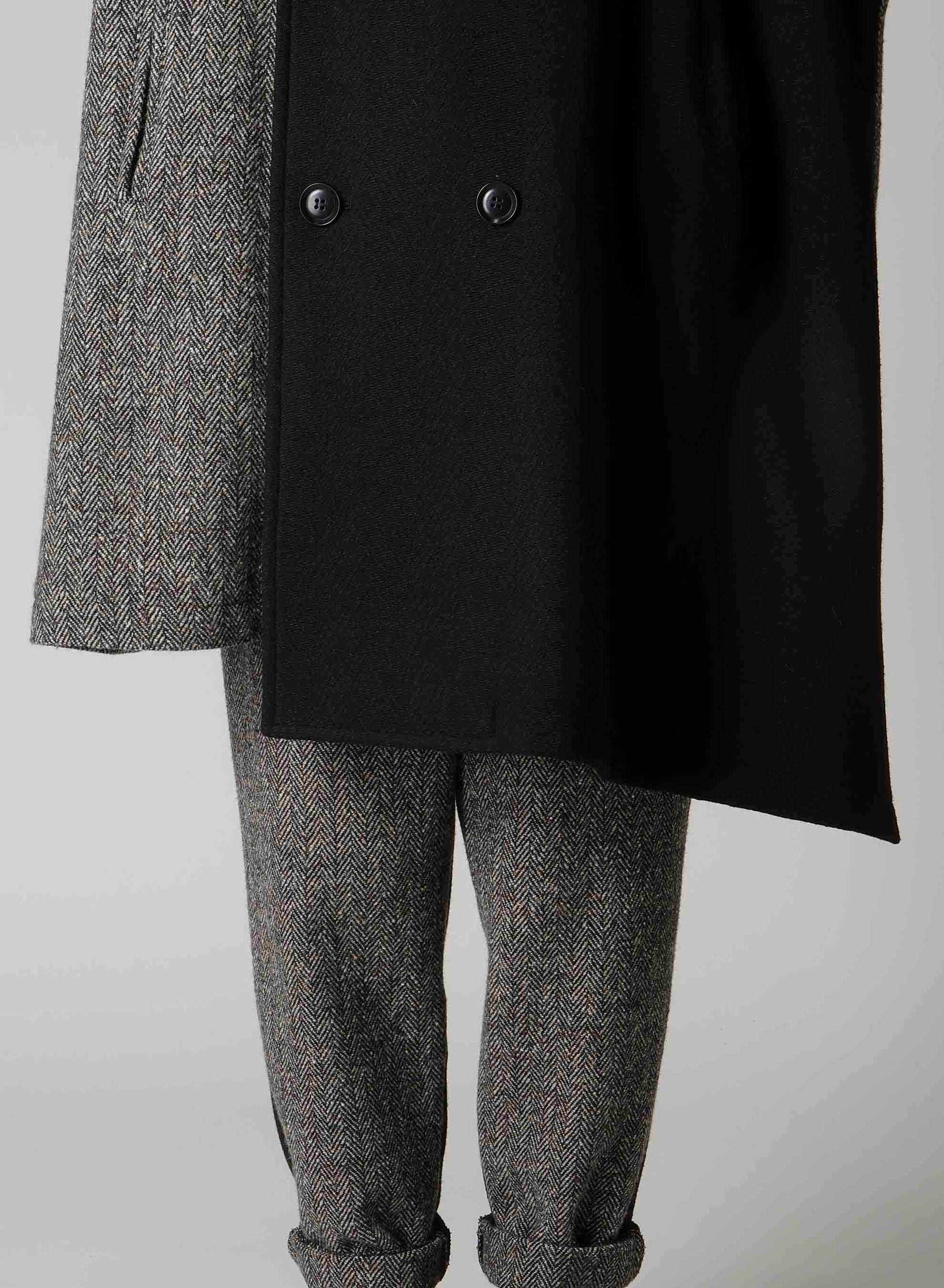 This is a herringbone fabric pea coat crafted with a tweed-like combination and a warm feel. It features an asymmetric design with a flare only on one side, creating a unique style. The coat is designed with a relaxed fit to allow for easy layering with inner wear.