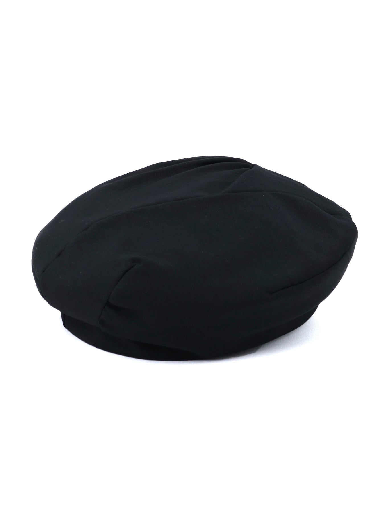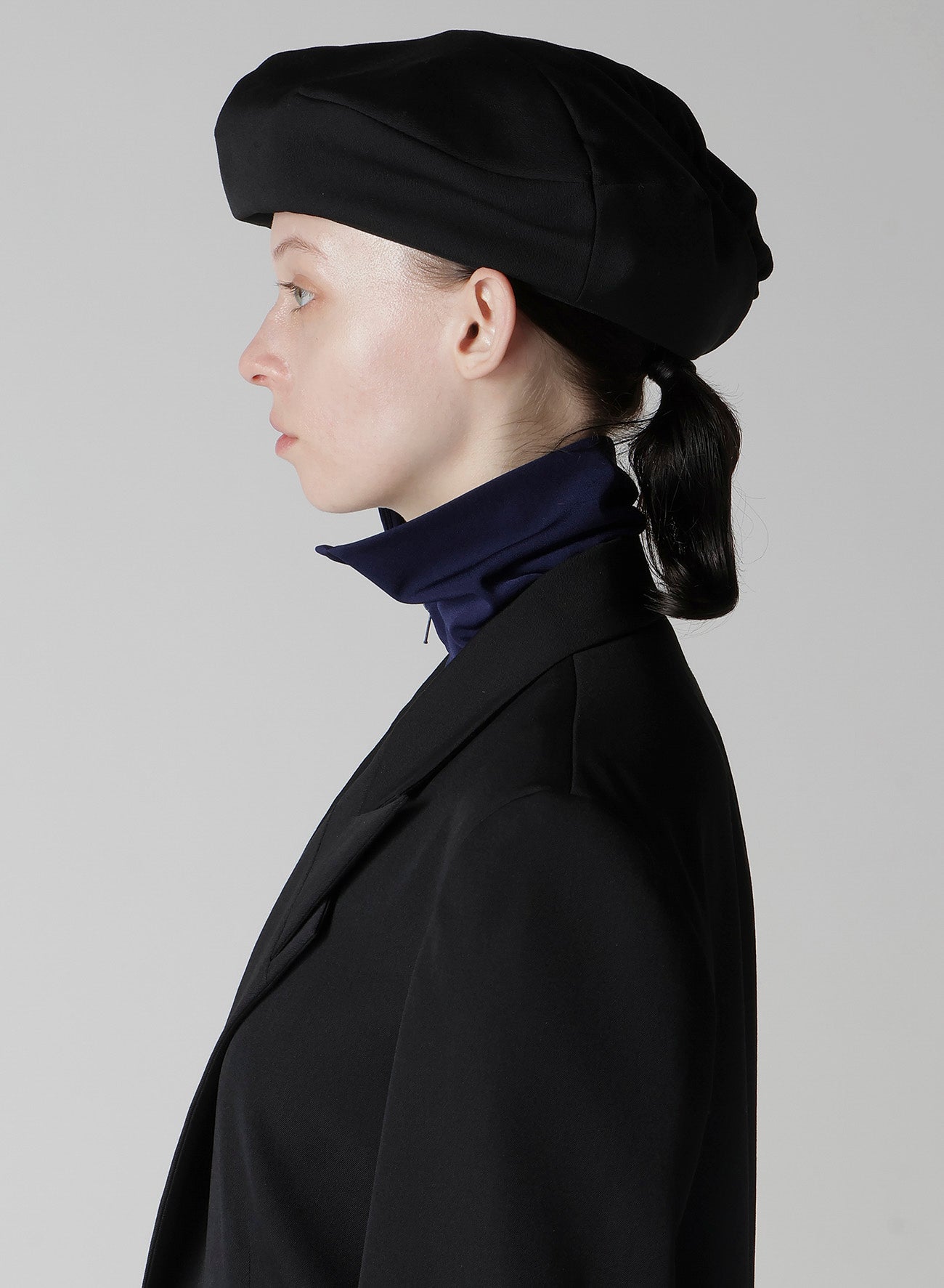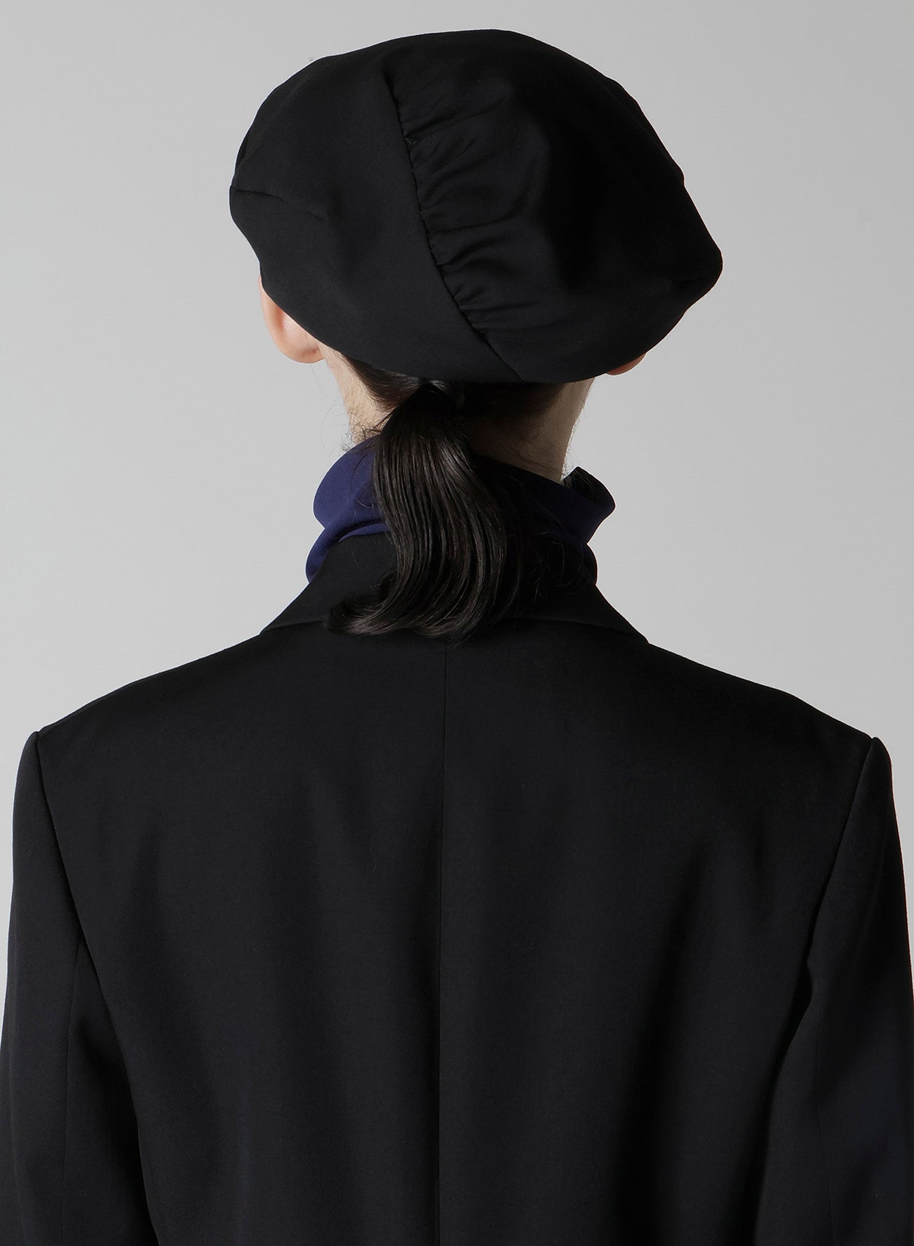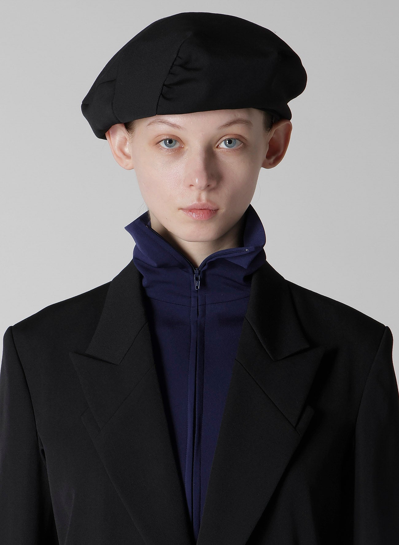 Un berretto realizzato in un materiale firmato Y's, gabardine di lana. Il tessuto presenta una finitura rugosa naturale, esaltando la trama della lana. Le cuciture asimmetriche e le arricciature parziali creano un aspetto tridimensionale e avanguardistico.
