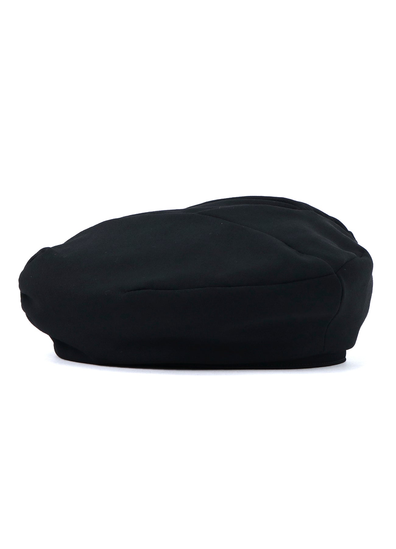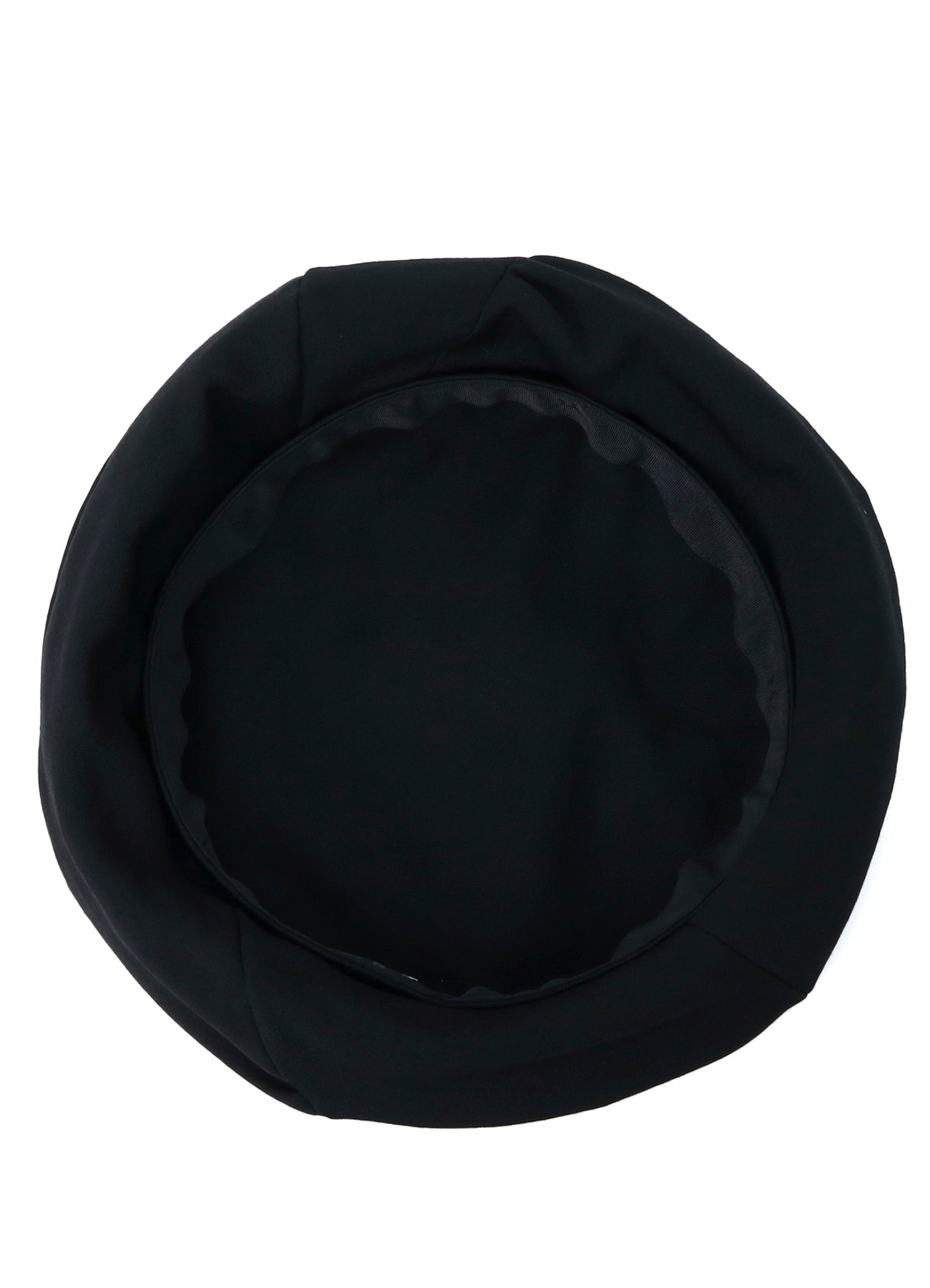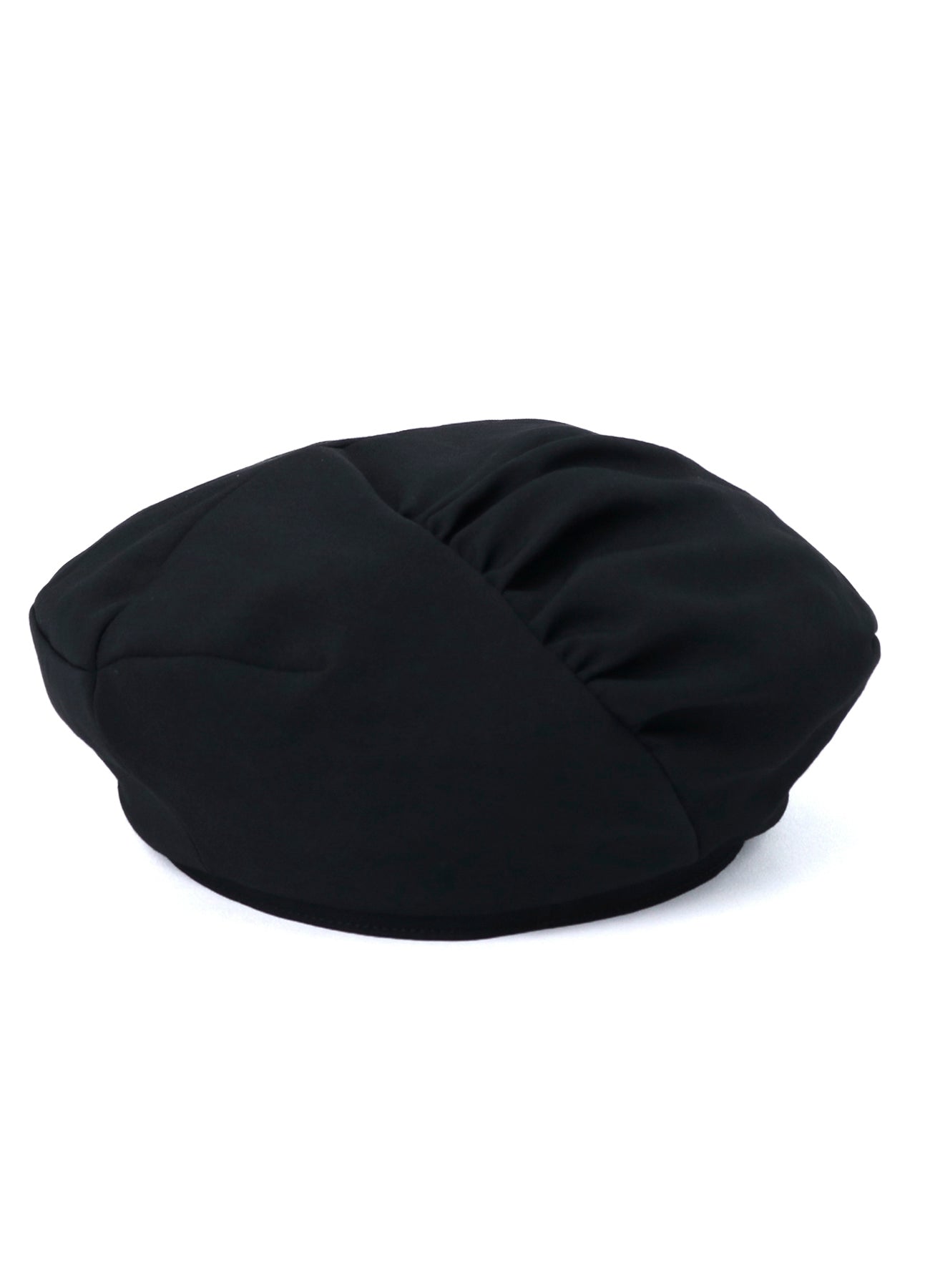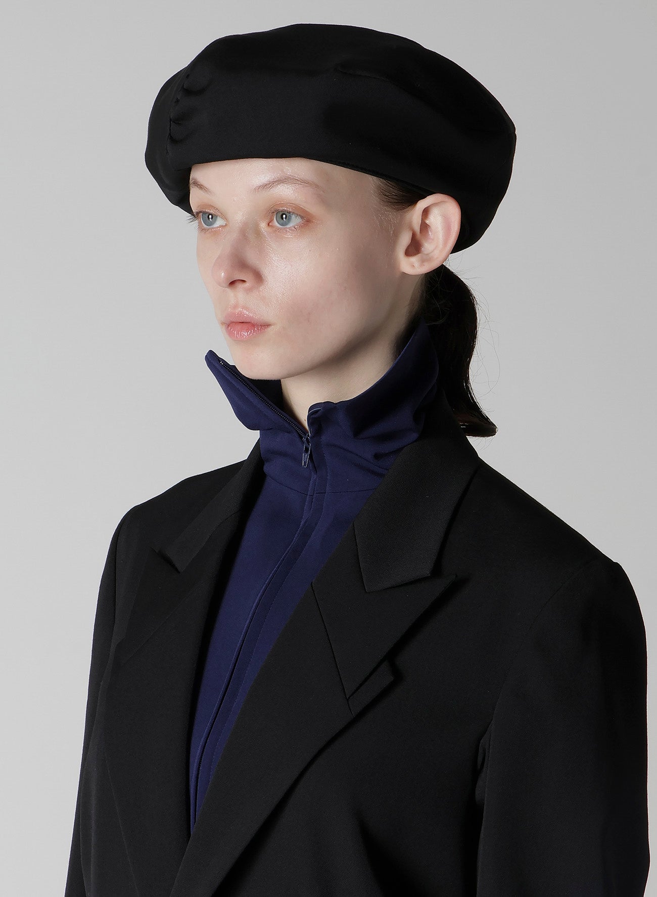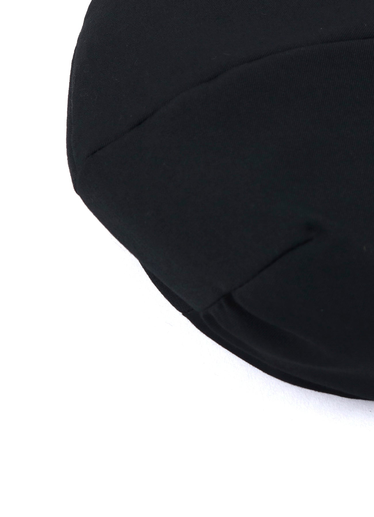 Un berretto realizzato in un materiale firmato Y's, gabardine di lana. Il tessuto presenta una finitura rugosa naturale, esaltando la trama della lana. Le cuciture asimmetriche e le arricciature parziali creano un aspetto tridimensionale e avanguardistico.