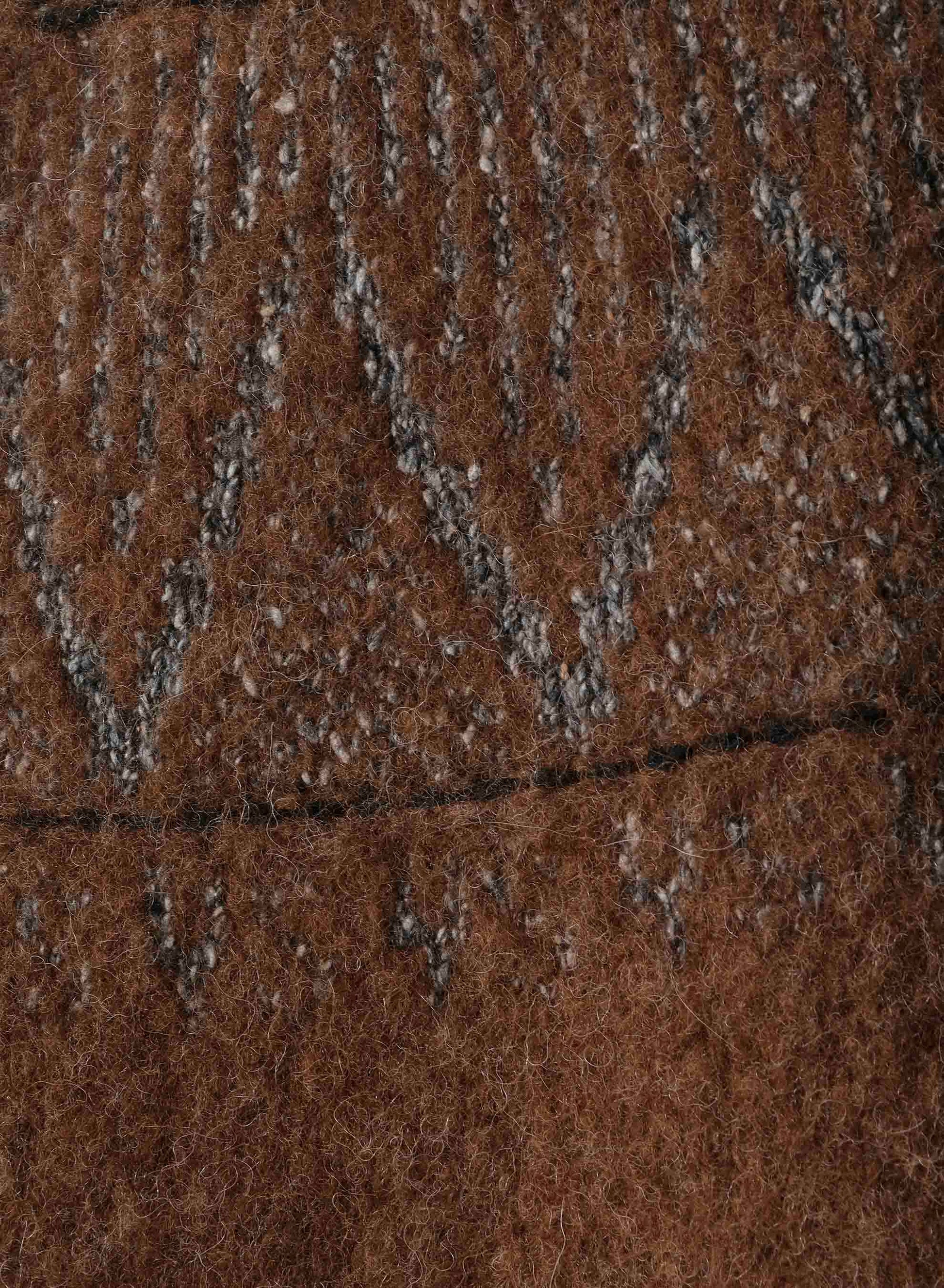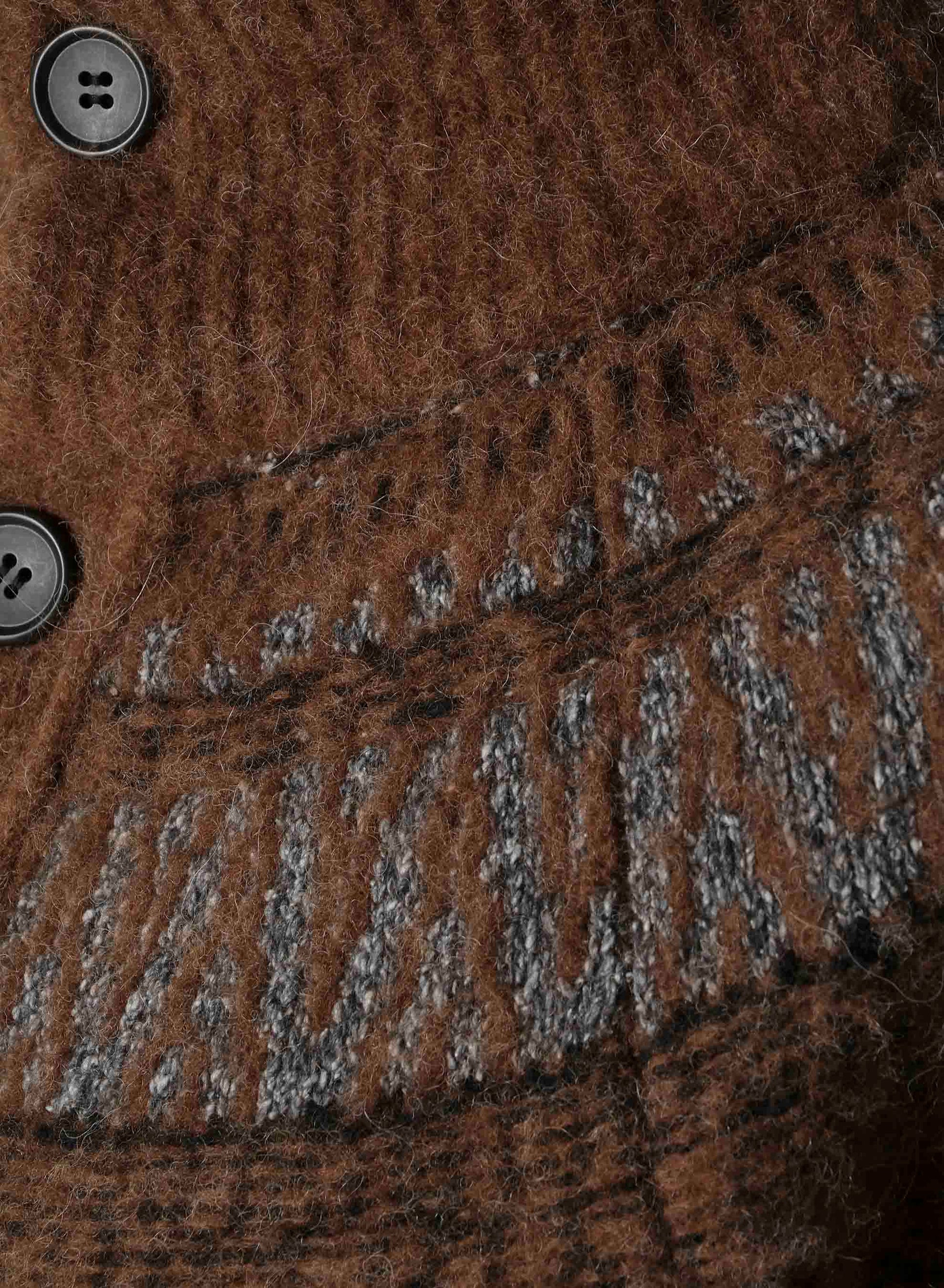 Un cardigan con motivo nordico combina un materiale alpaca ad alta isolazione e leggerezza con accenti di seta per creare una texture unica. Incorpora sottilmente il motivo "Y’s", rendendolo un capo distintivo.