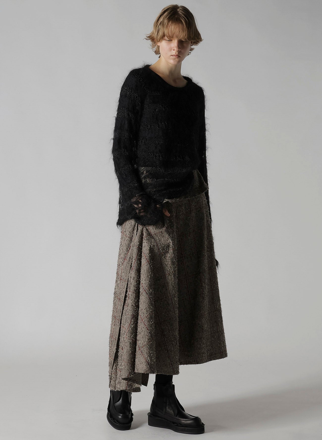 Una gonna avvolgente asimmetrica con un effetto drappeggiato unico, realizzata in tessuto feltro per offrire calore e texture. La combinazione di un motivo tradizionale con questa tecnica crea un'espressione distintiva di Y's. Il taglio della gonna genera movimento, conferendo un'impressione leggera a qualsiasi outfit.