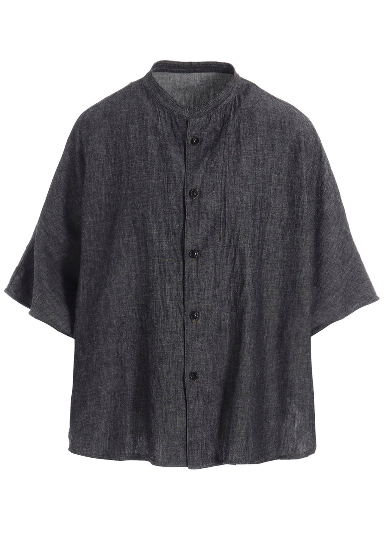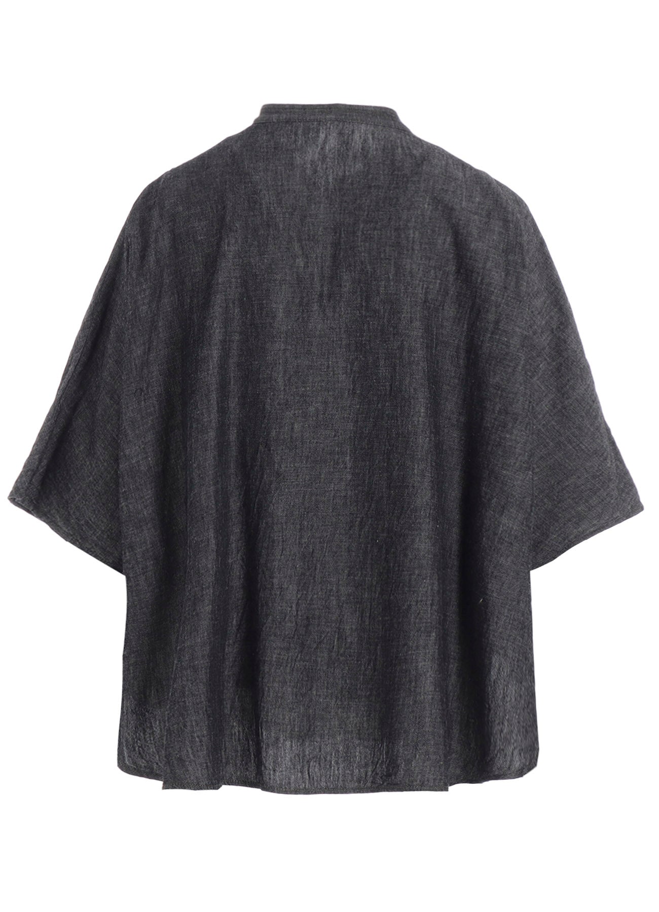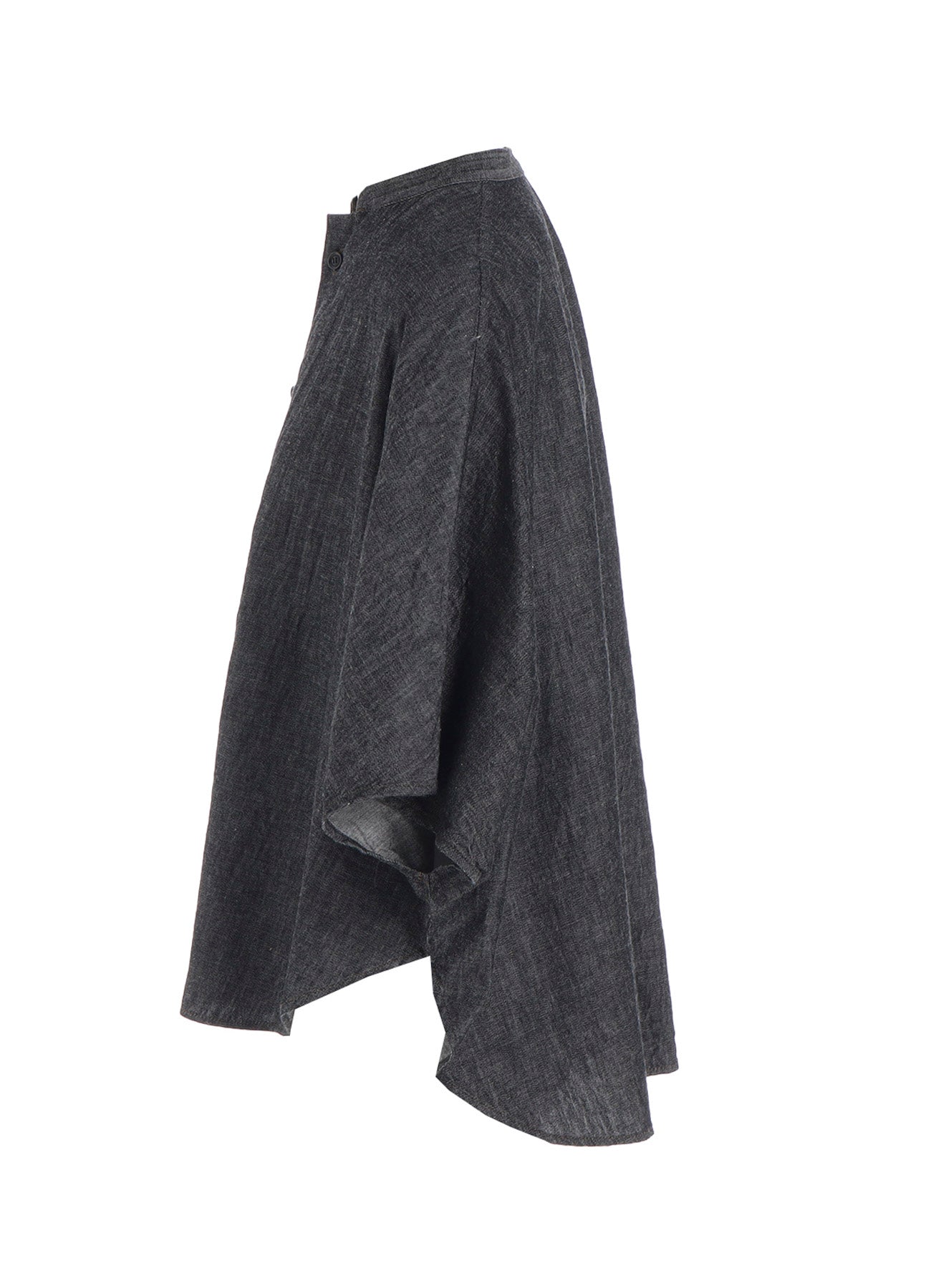 Questa blusa in denim con collo alto a mantella presenta una silhouette spaziosa con corpo e maniche integrate nel design a mantella. Realizzata in denim sottile con trama larga, vanta una texture delicata grazie al suo processo di tintura unico. La lavorazione a lavaggio morbido migliora la sensazione e il comfort del tessuto, con variazioni individuali attese.