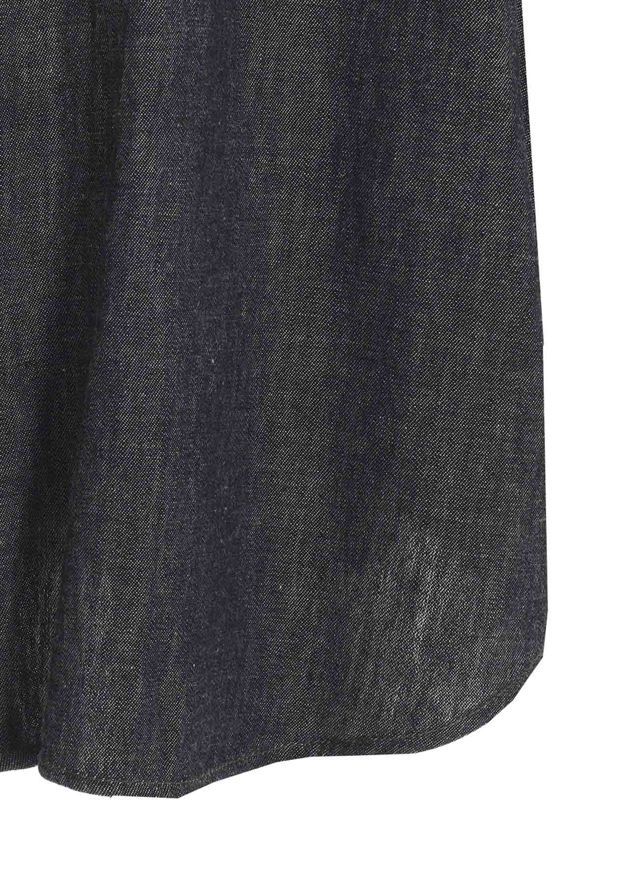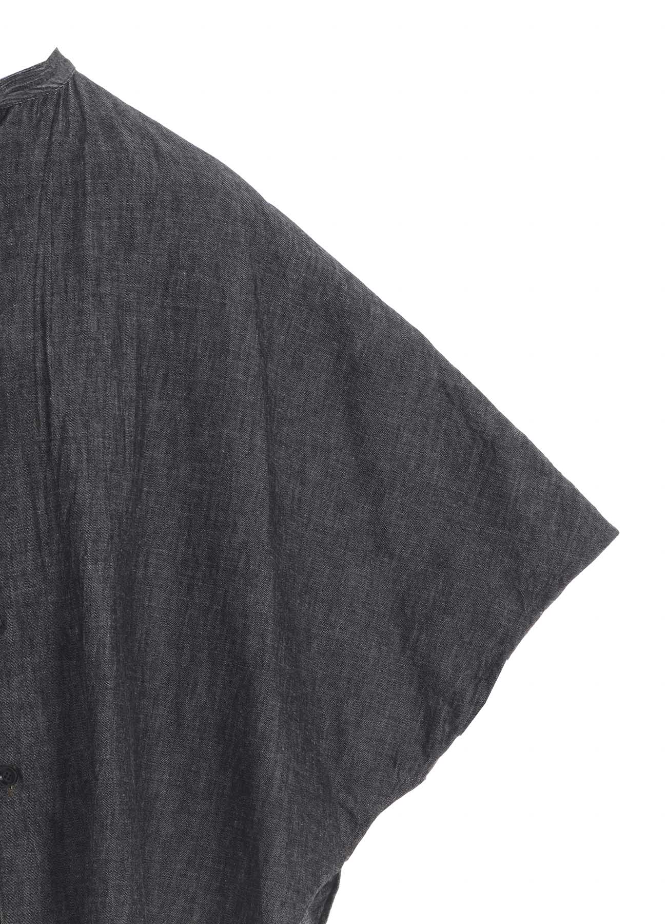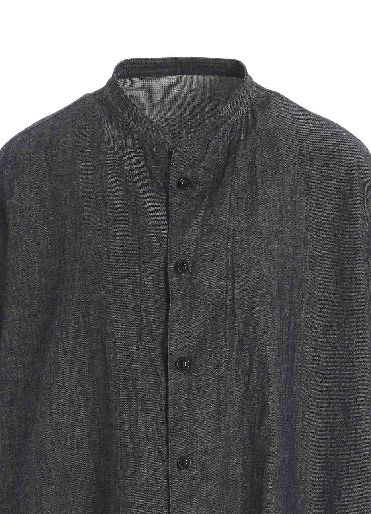 Questa blusa in denim con collo alto a mantella presenta una silhouette spaziosa con corpo e maniche integrate nel design a mantella. Realizzata in denim sottile con trama larga, vanta una texture delicata grazie al suo processo di tintura unico. La lavorazione a lavaggio morbido migliora la sensazione e il comfort del tessuto, con variazioni individuali attese.