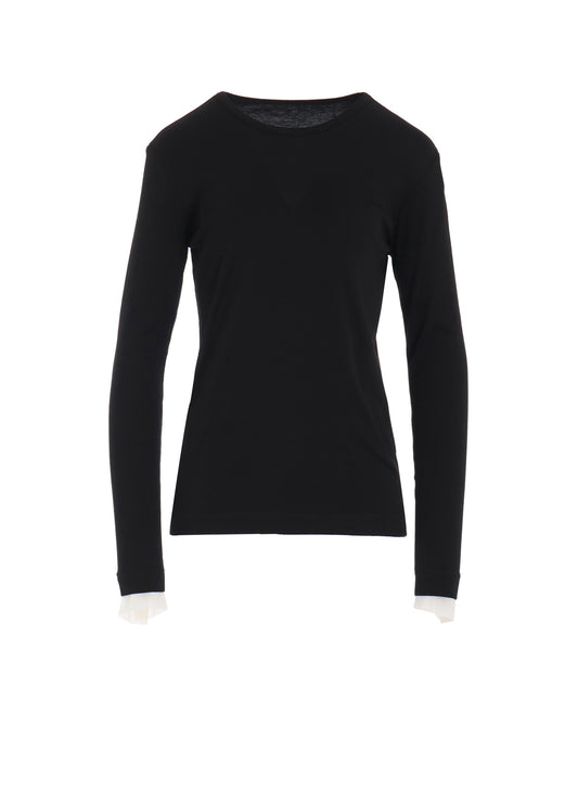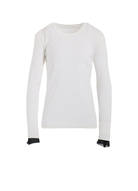 COTTON FRAISE/POLYESTER GAUZE DOUBLED CUFF ROUND NECK T