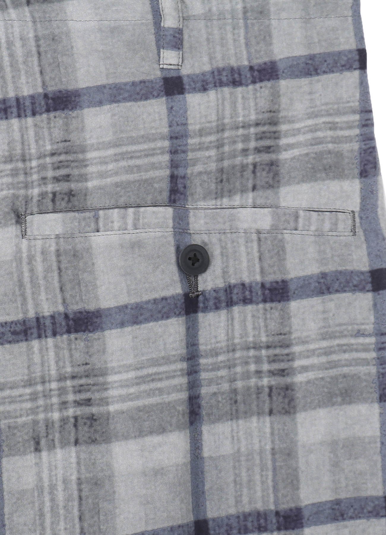 이 허리 주름 팬츠는 우아한 광택과 부드러운 질감이 특징인 habutae 소재로 만들어졌으며, 체크 패턴은 교토 공장에서 잉크젯 프린트되었습니다. 패턴을 오프셋하여 조합 디자인을 의도적으로 포함하였습니다.