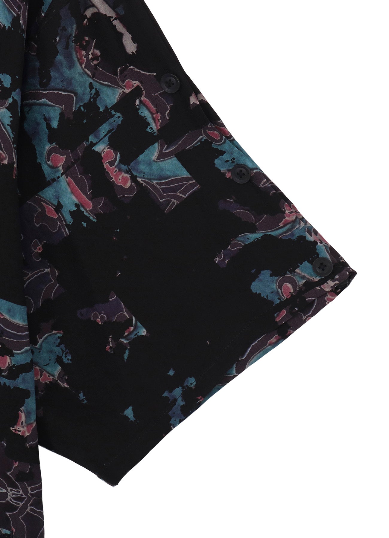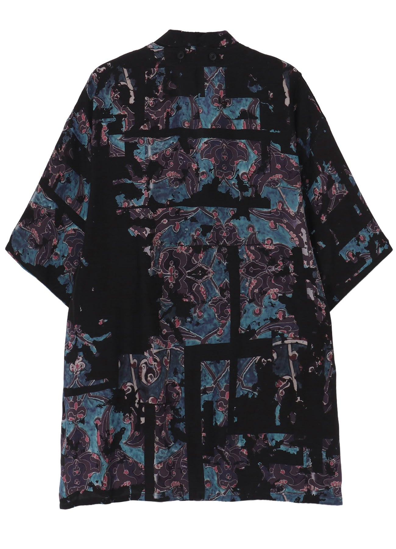 요지 야마모토 POUR HOMME S/S 2026 컬렉션의 반소매 버튼 자켓입니다. 12 momme 크레이프 드 신 실크로 제작되어 가벼움과 우아한 드레이프를 제공합니다. 오래된 천에서 영감을 받은 패브릭이 교토에서 잉크젯 프린팅되어 숙련된 기술을 통해 풍부한 색감을 선보입니다.