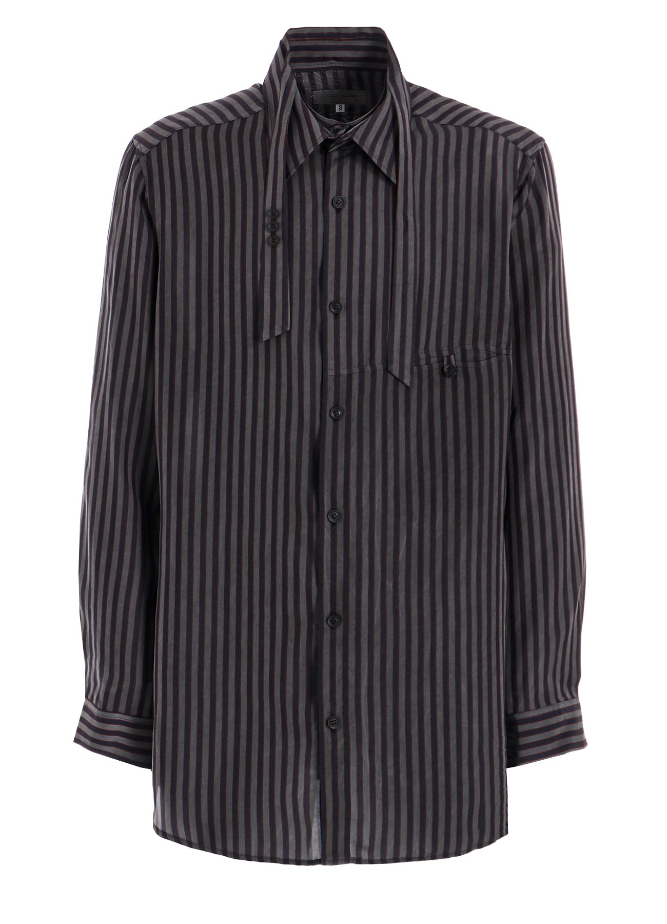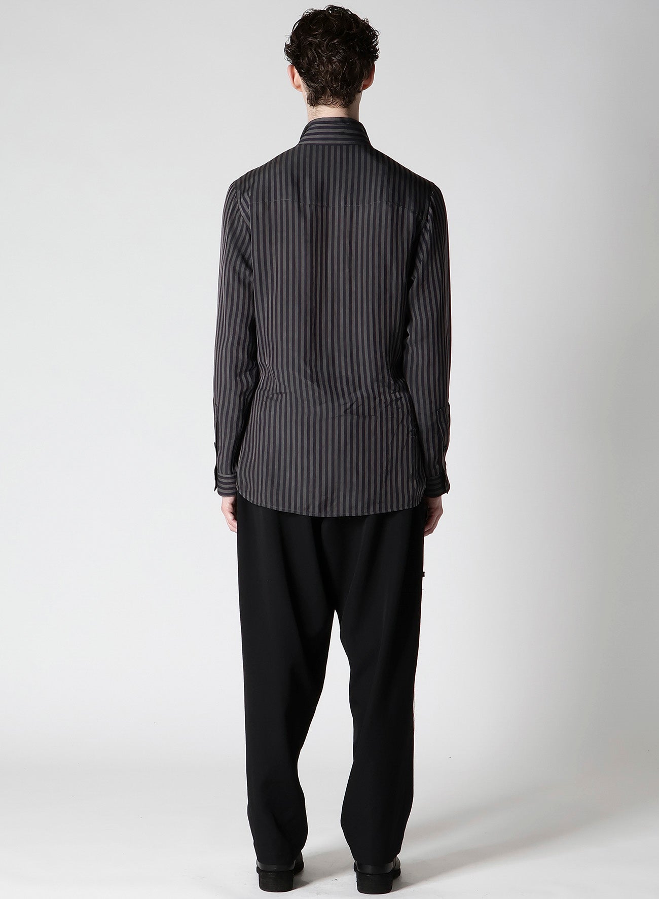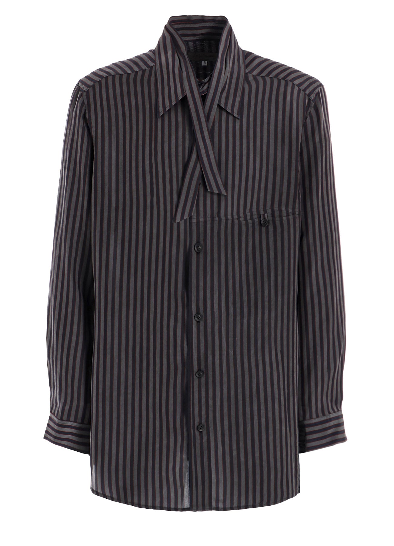 LOOK25의 리본 스페어 칼라 블라우스는 드럼 염색기로 공정된 피그먼트 염색이 적용된 컵로 원단으로 제작되었습니다. 독특한 특징으로는 피그먼트 염색의 특성상 나타나는 색상 퇴색과 컵로 소재의 헤진 질감이 있습니다.
