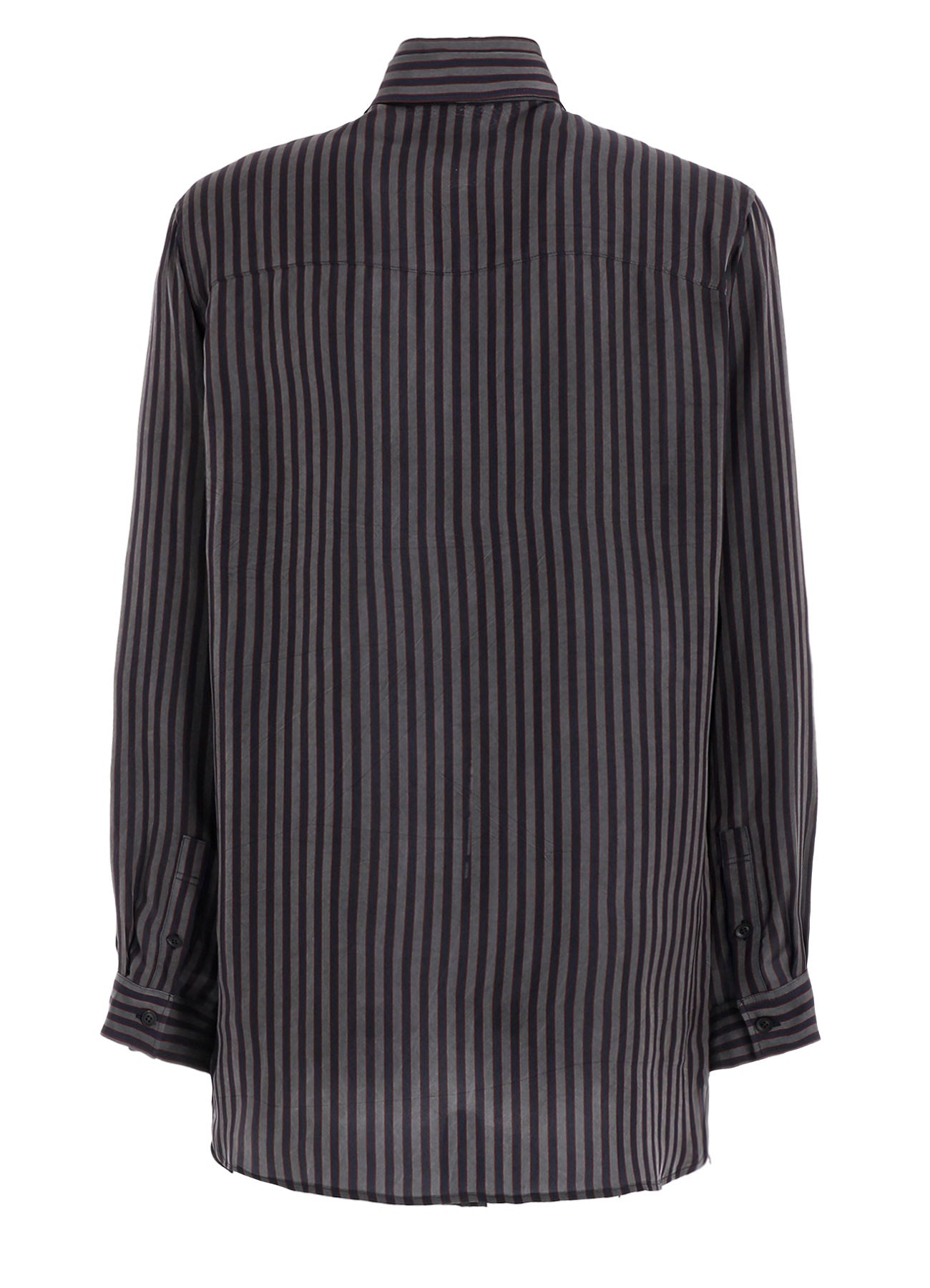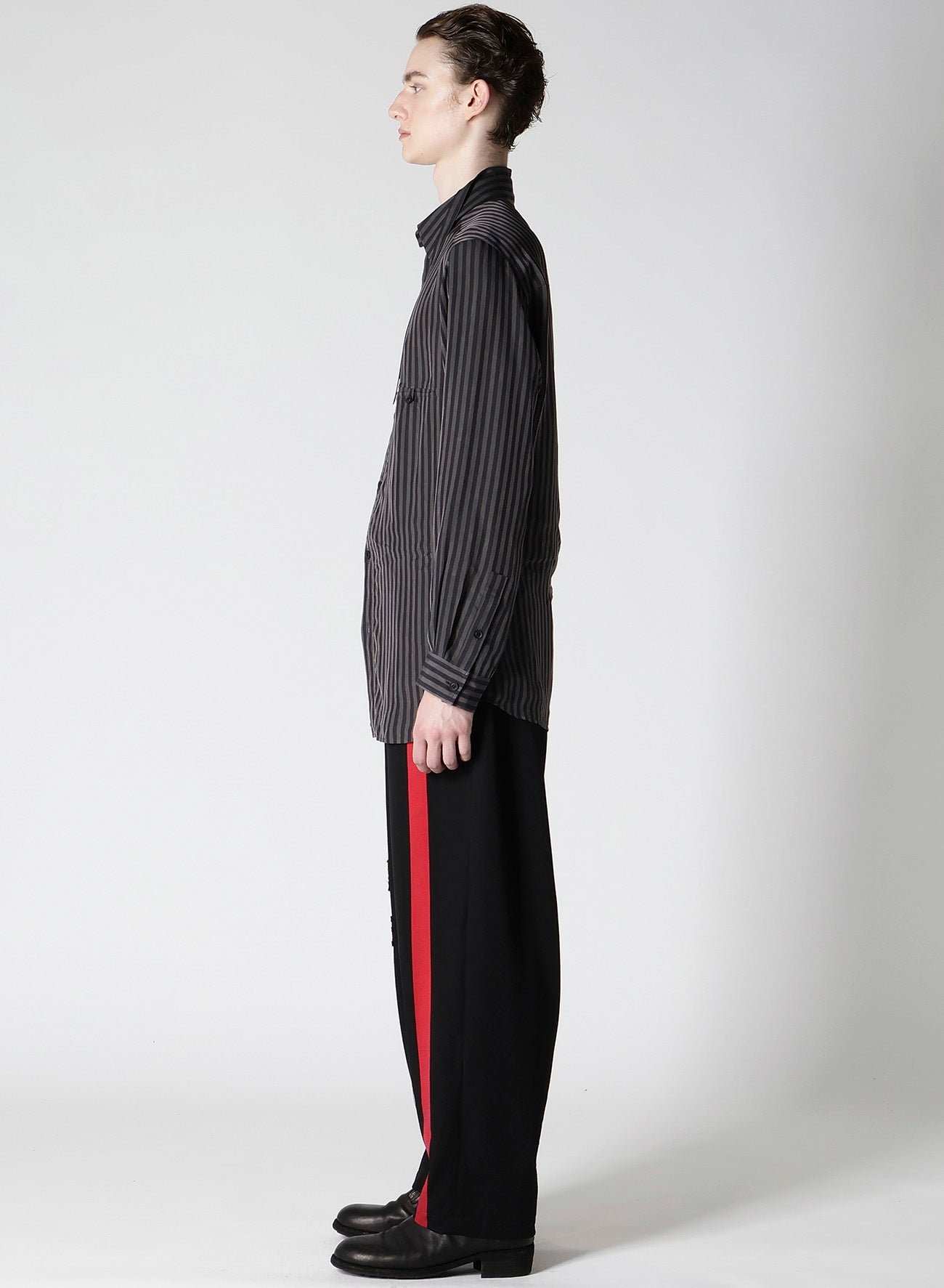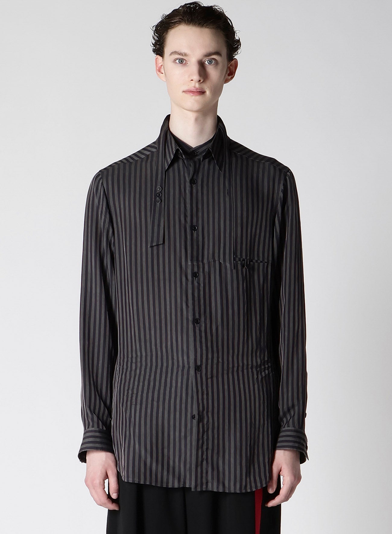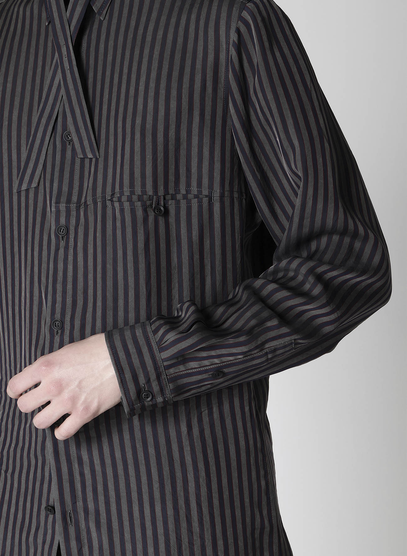 LOOK25의 리본 스페어 칼라 블라우스는 드럼 염색기로 공정된 피그먼트 염색이 적용된 컵로 원단으로 제작되었습니다. 독특한 특징으로는 피그먼트 염색의 특성상 나타나는 색상 퇴색과 컵로 소재의 헤진 질감이 있습니다.