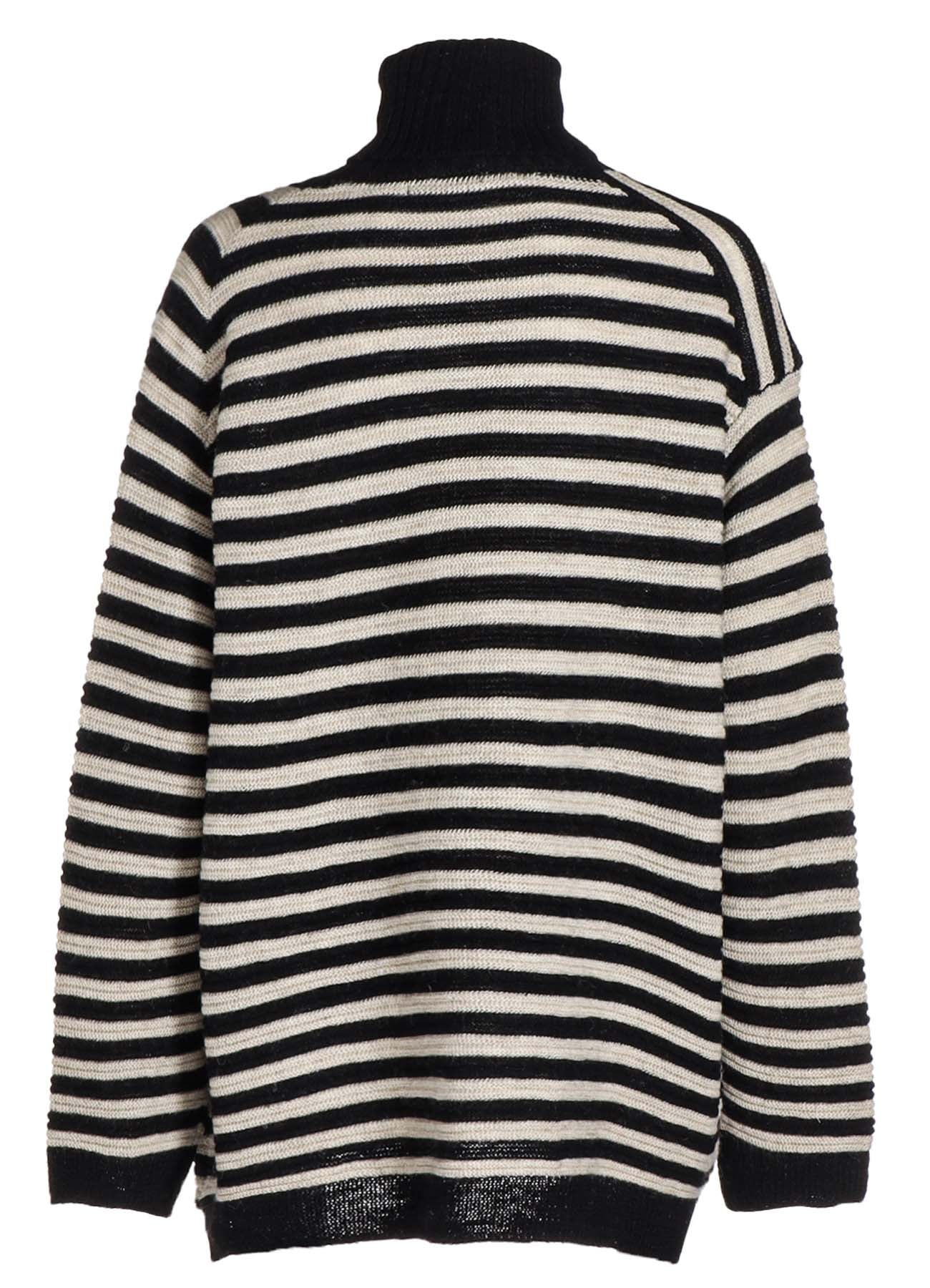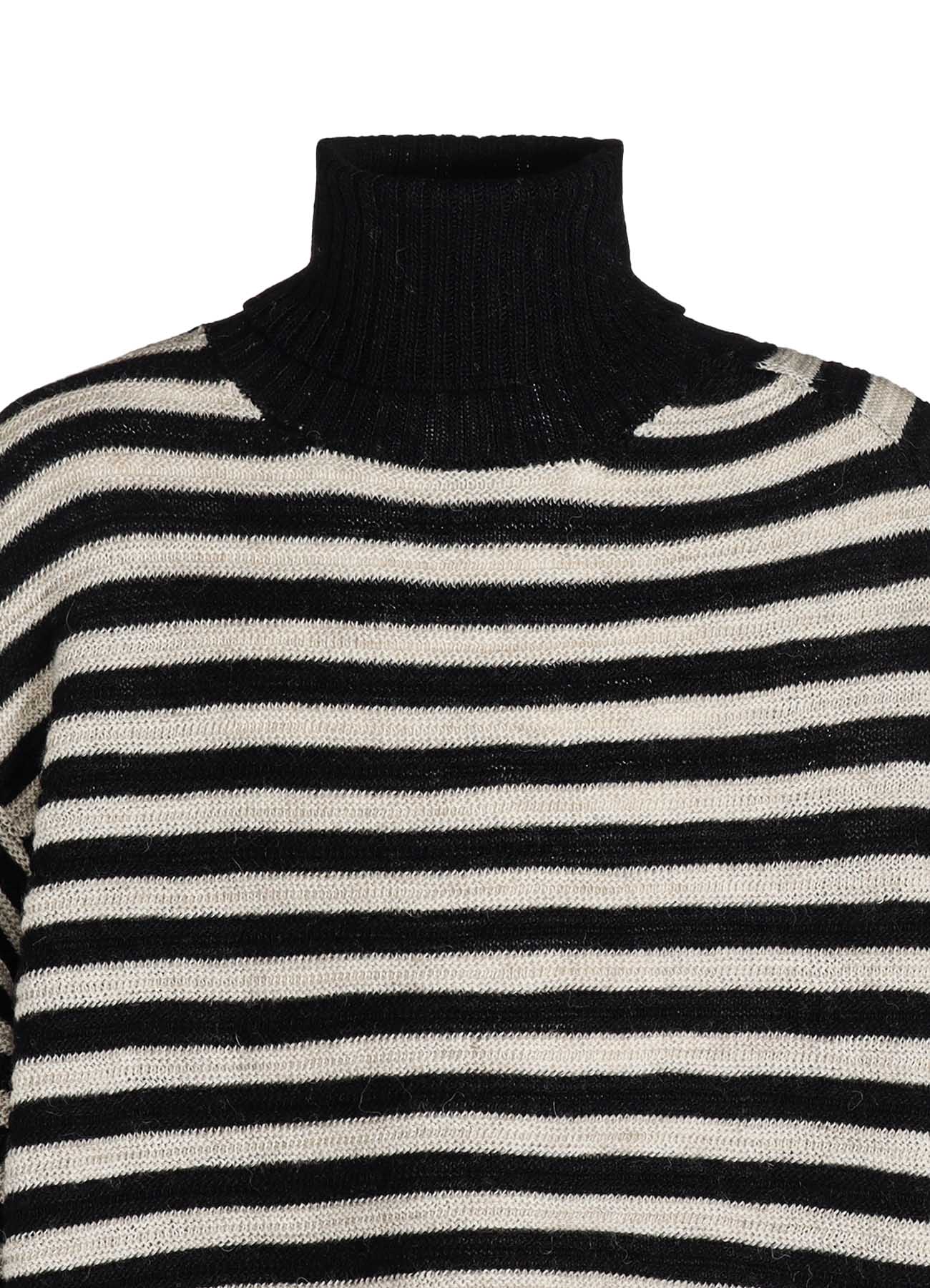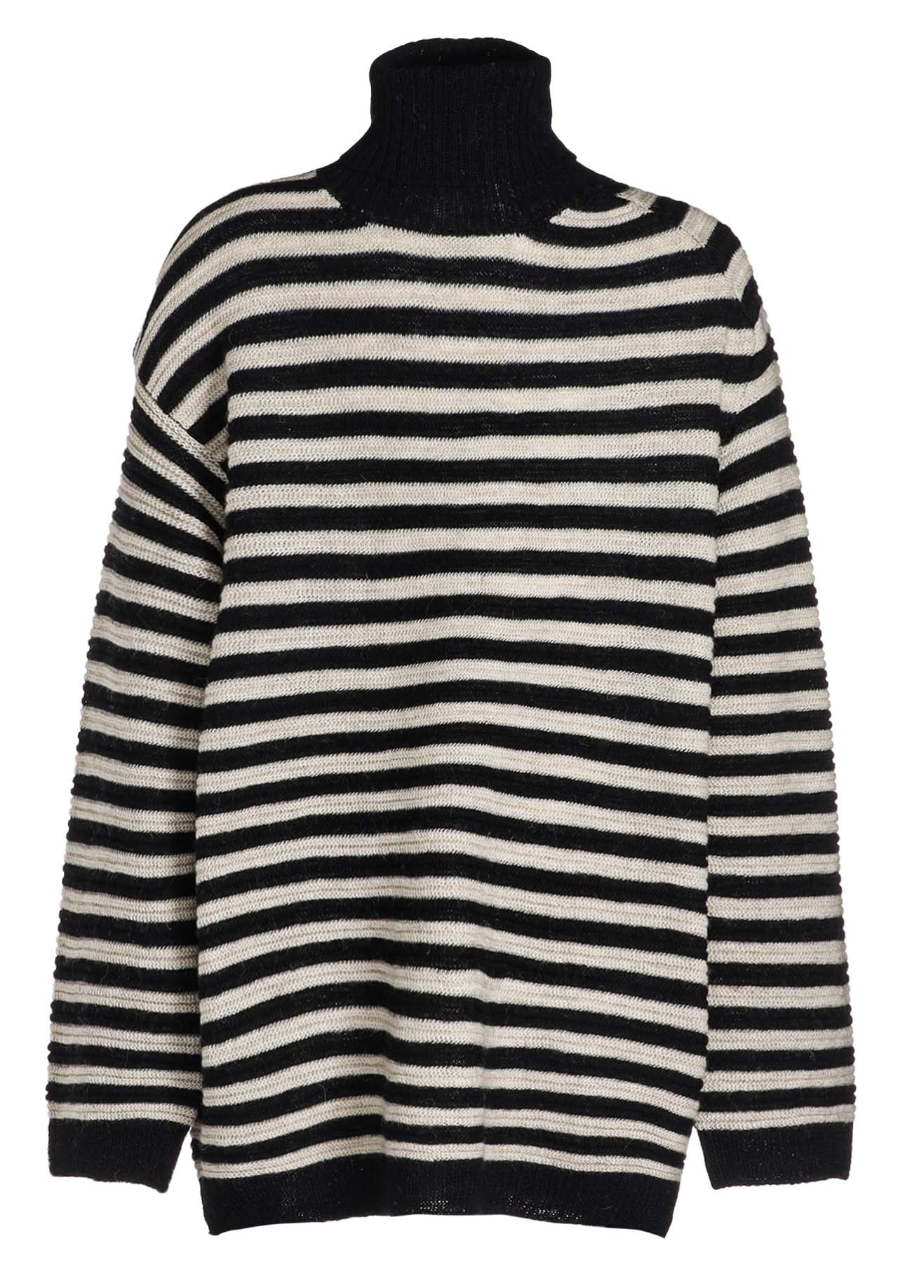 이 터틀넥 스트라이프 니트는 영국 양모로 제작되었으며, 특히 셰틀랜드 제도에 자생하는 양의 털을 사용하여 탄력성과 내구성이 뛰어납니다. 독특한 질감의 소재는 스트라이프 디자인으로 강조됩니다.