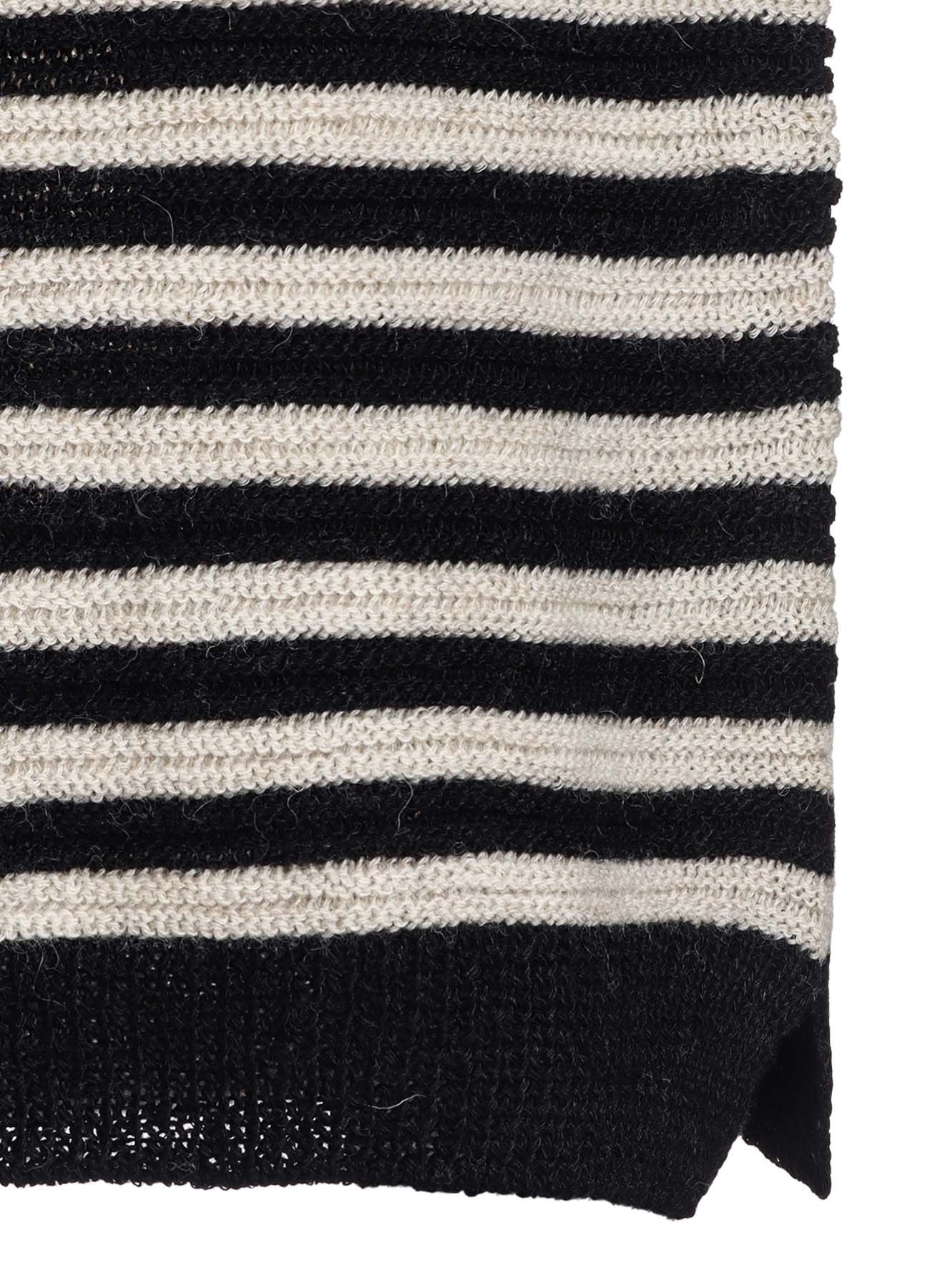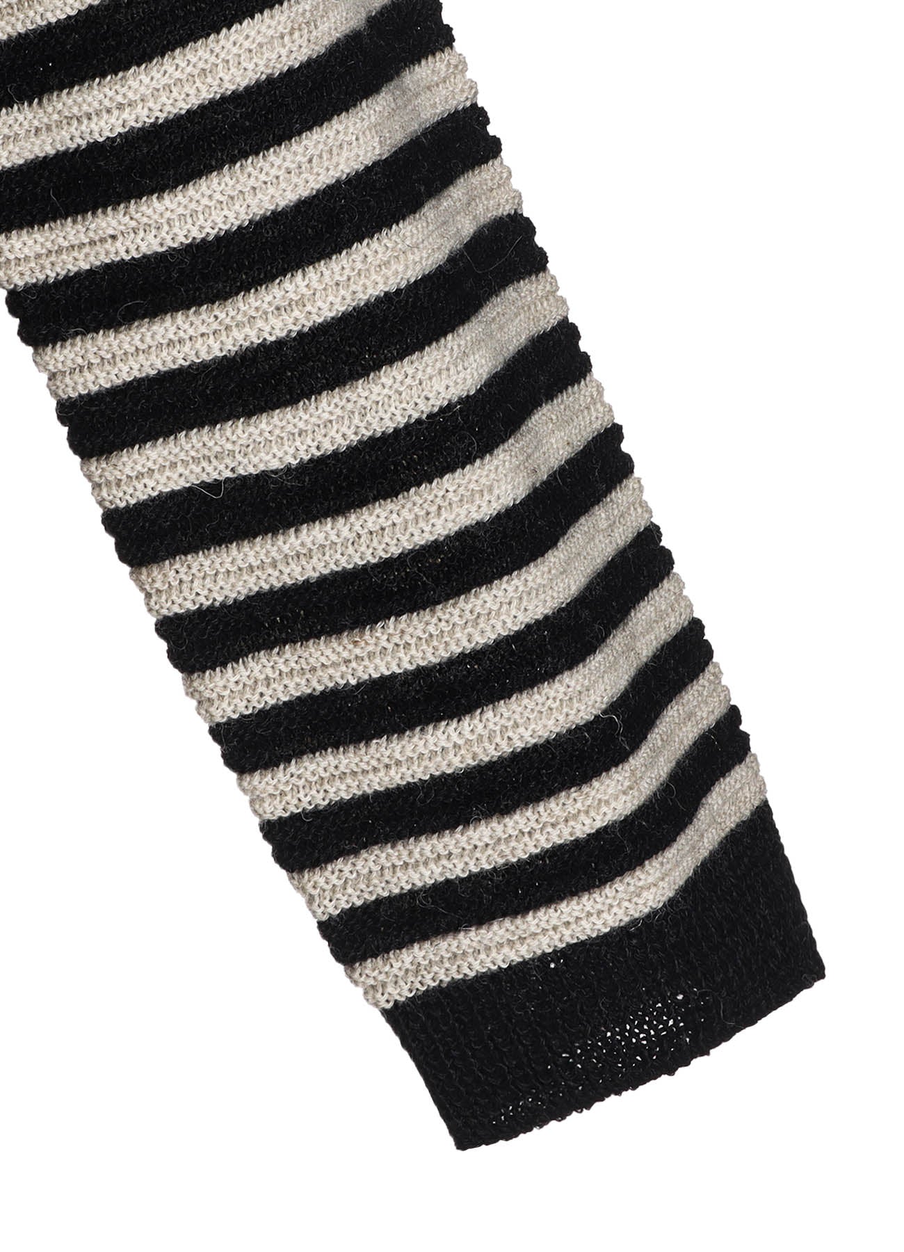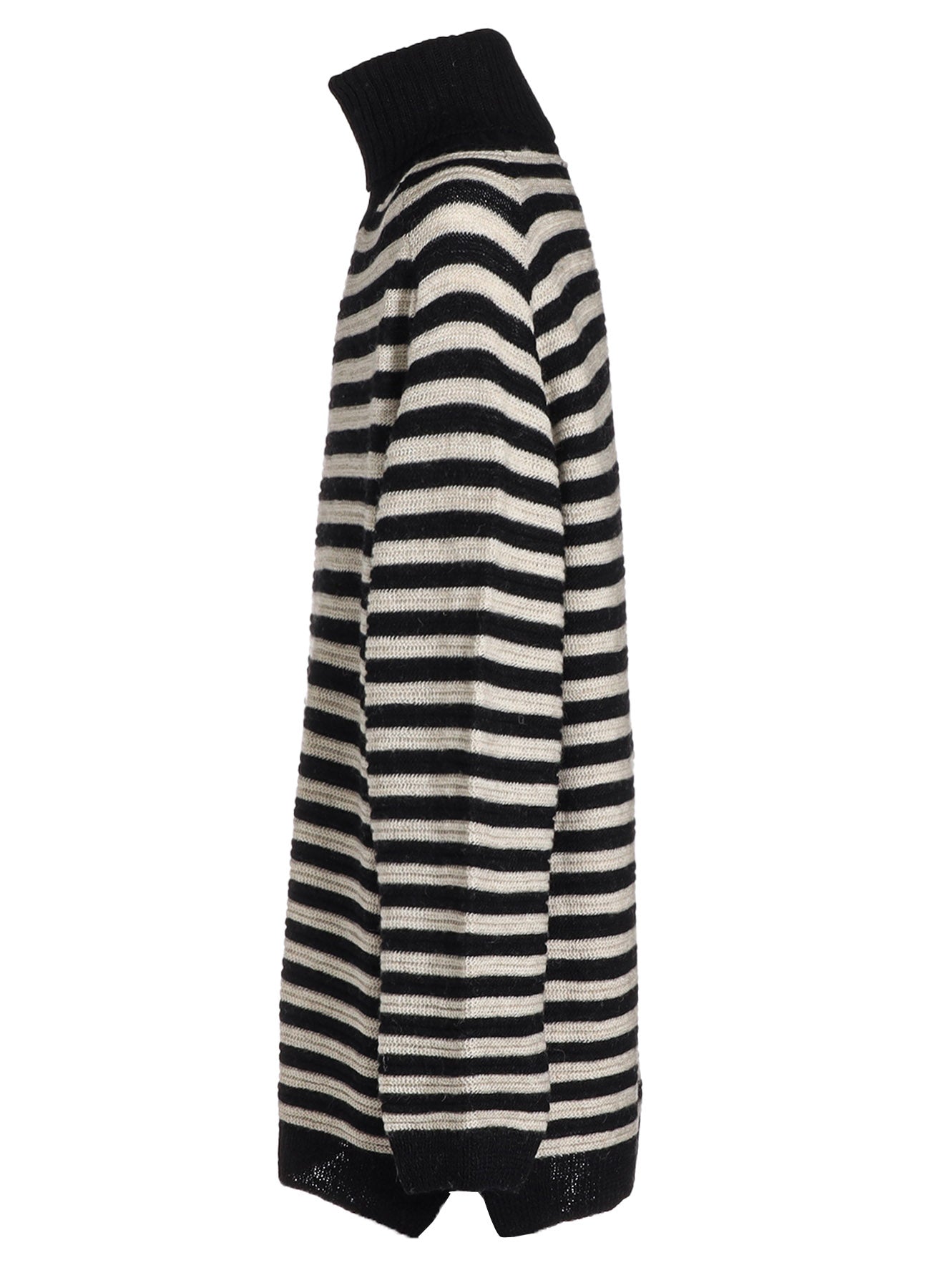 이 터틀넥 스트라이프 니트는 영국 양모로 제작되었으며, 특히 셰틀랜드 제도에 자생하는 양의 털을 사용하여 탄력성과 내구성이 뛰어납니다. 독특한 질감의 소재는 스트라이프 디자인으로 강조됩니다.