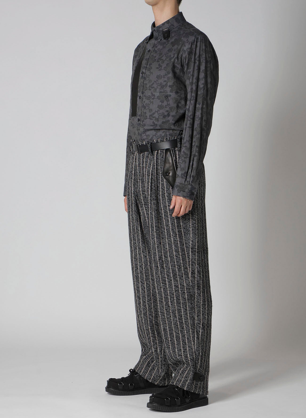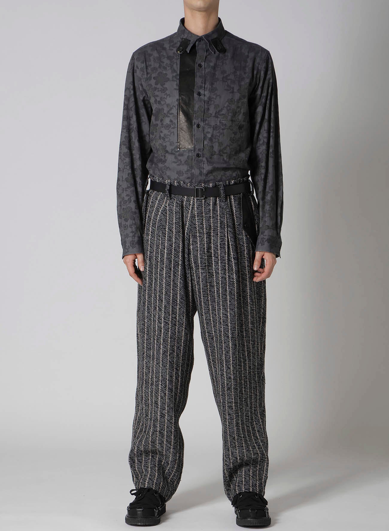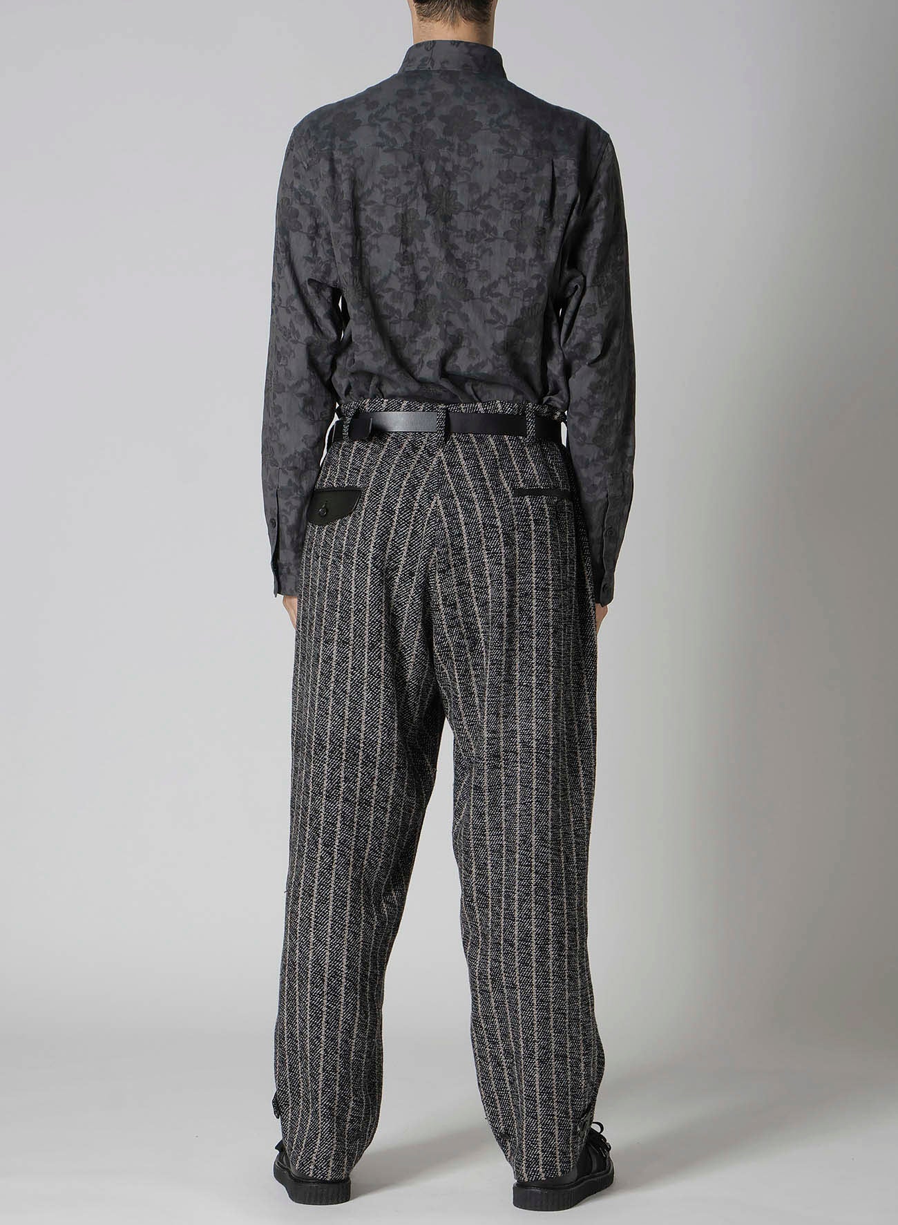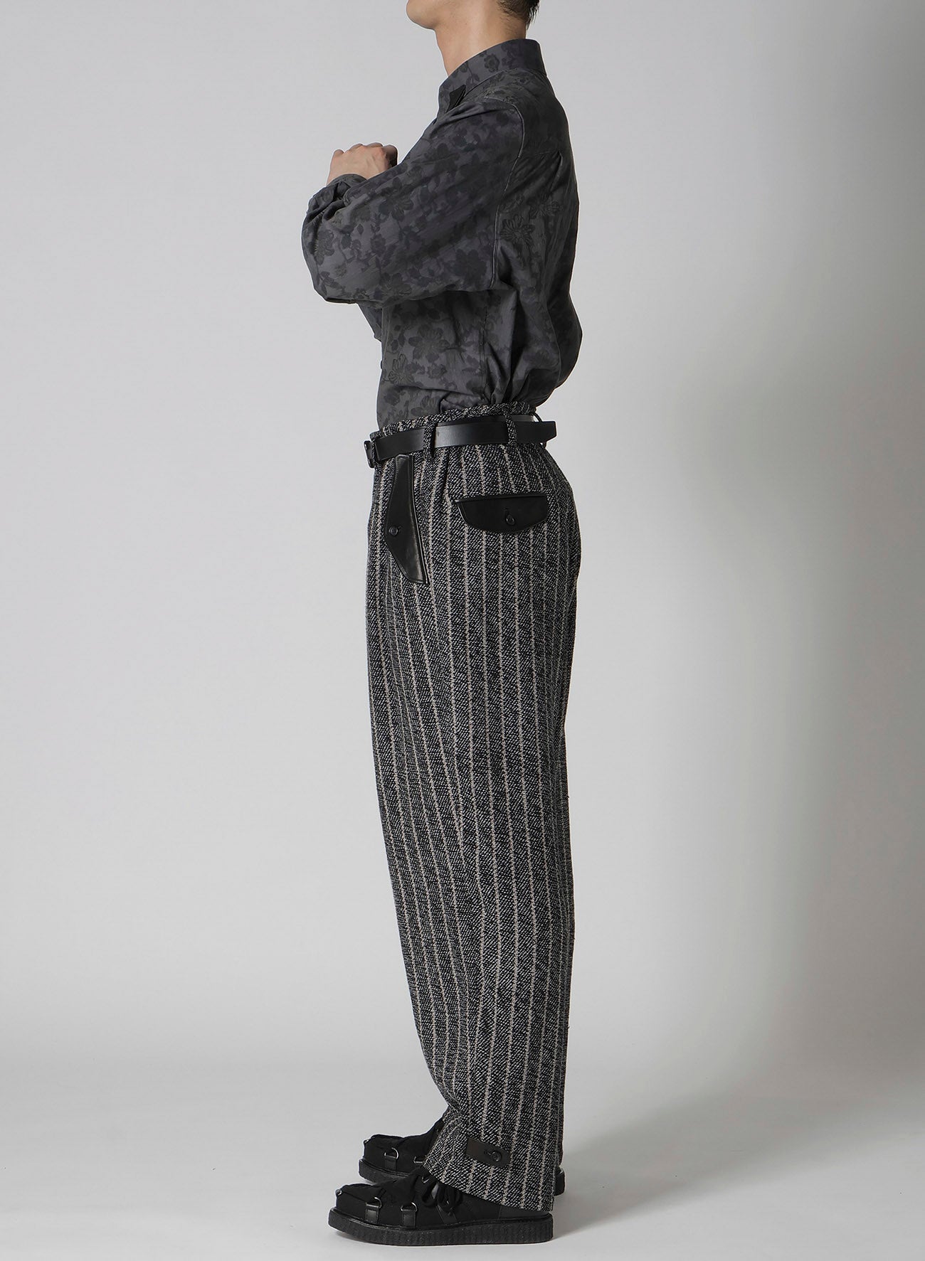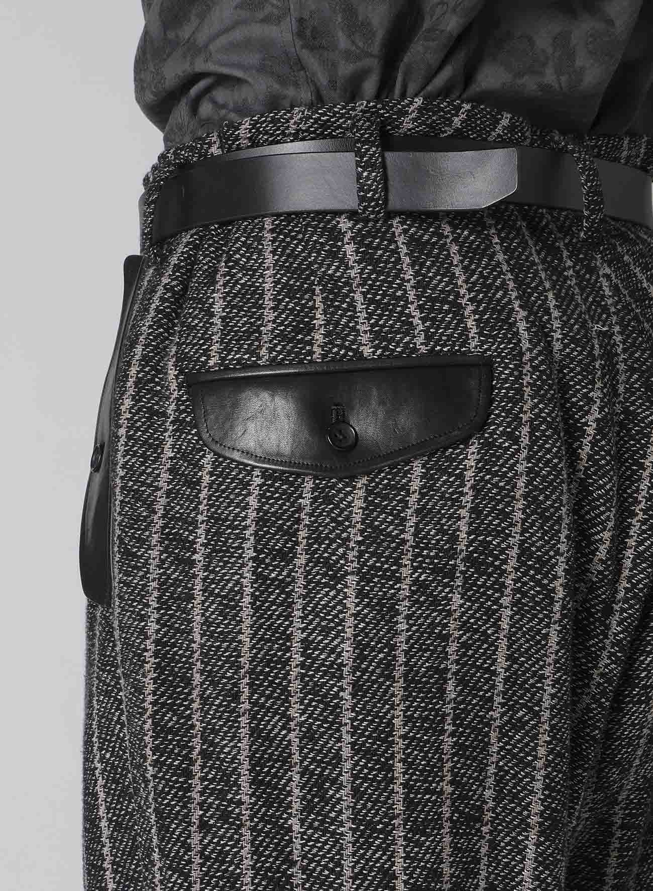 LOOK15의 단일 플리츠 팬츠는 독특한 스트라이프 트위드 패브릭을 특징으로 합니다. 수직 실은 손으로 짠 카디 면이며, 수평의 흰색 린넨과 검은색 실크 실과 결합하여 세 가지 색상의 혼합을 만듭니다. 말 가죽은 옆면 플랩, 뒷부분 오른쪽 플랩, 뒷주머니 가장자리 및 밑단 탭에 사용됩니다.