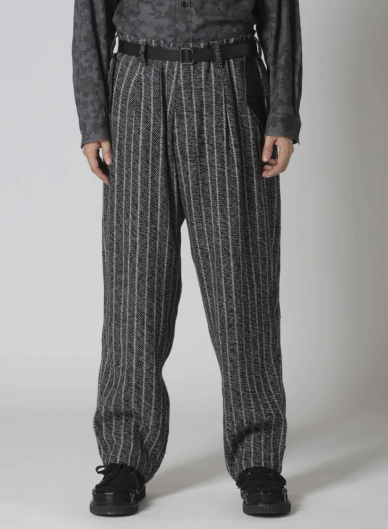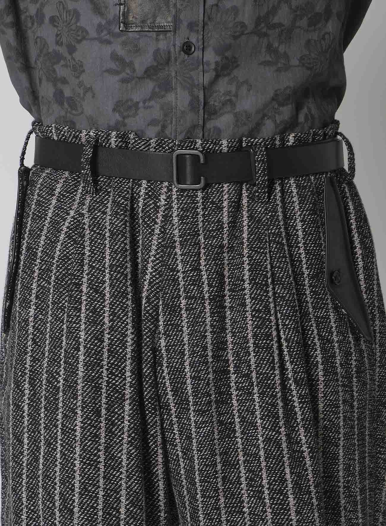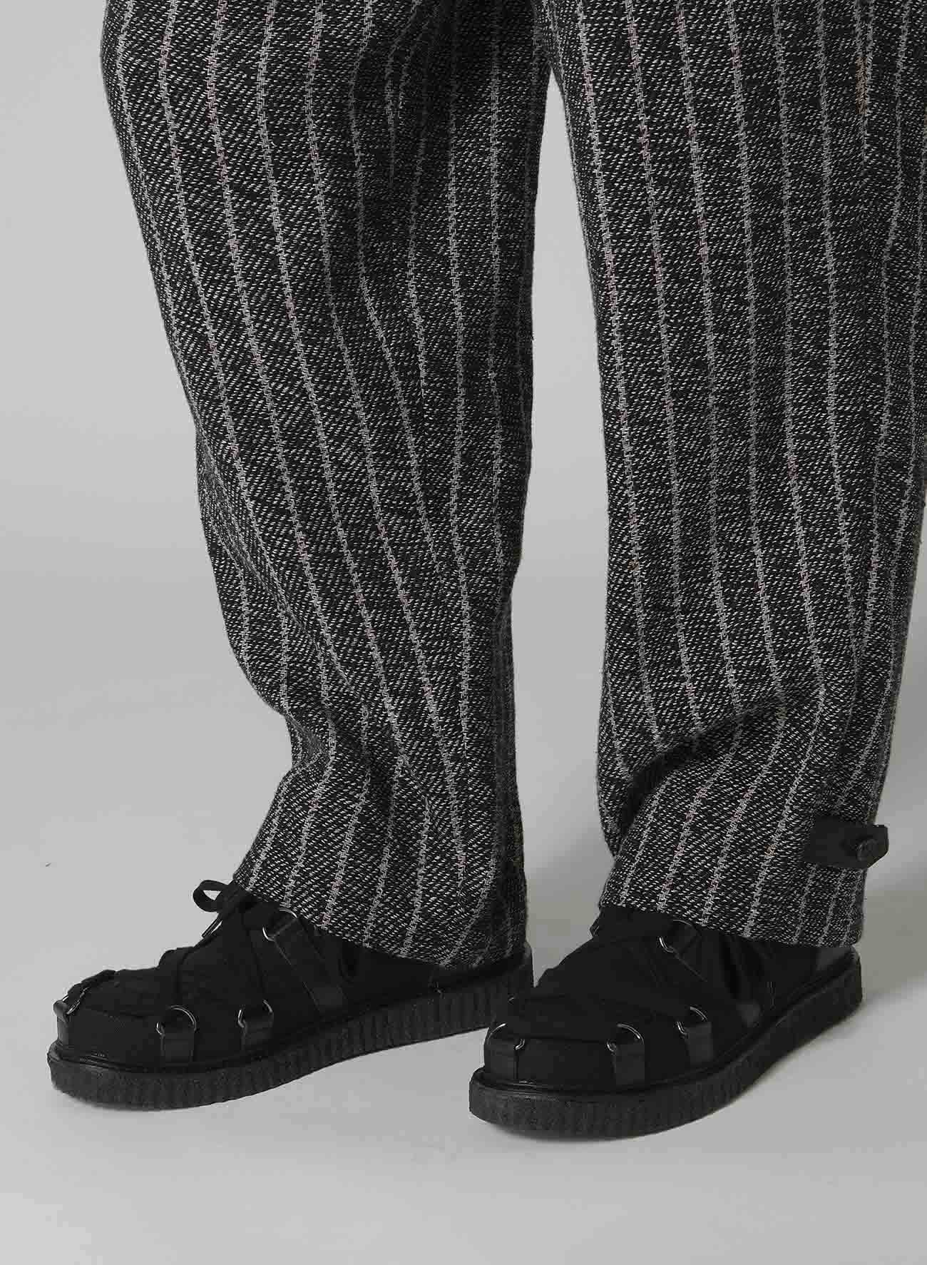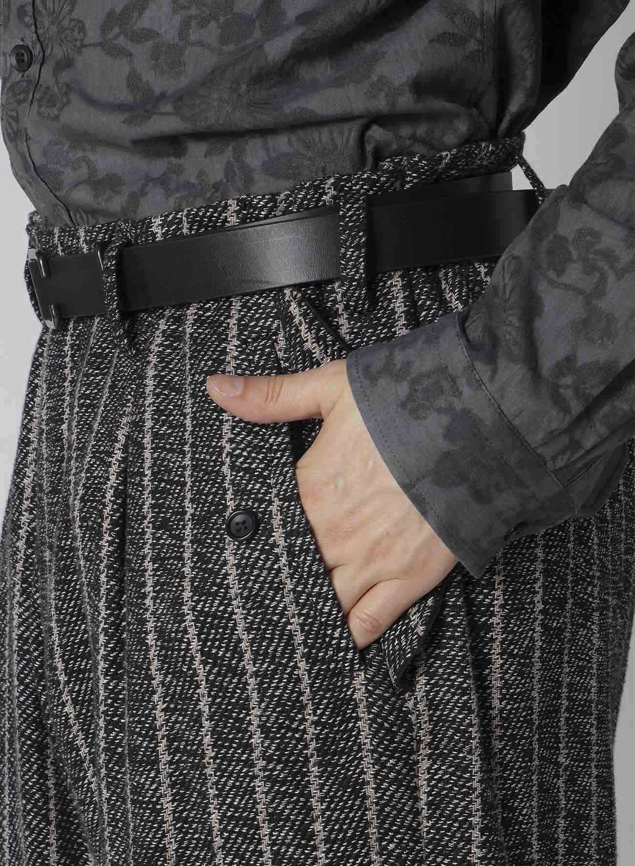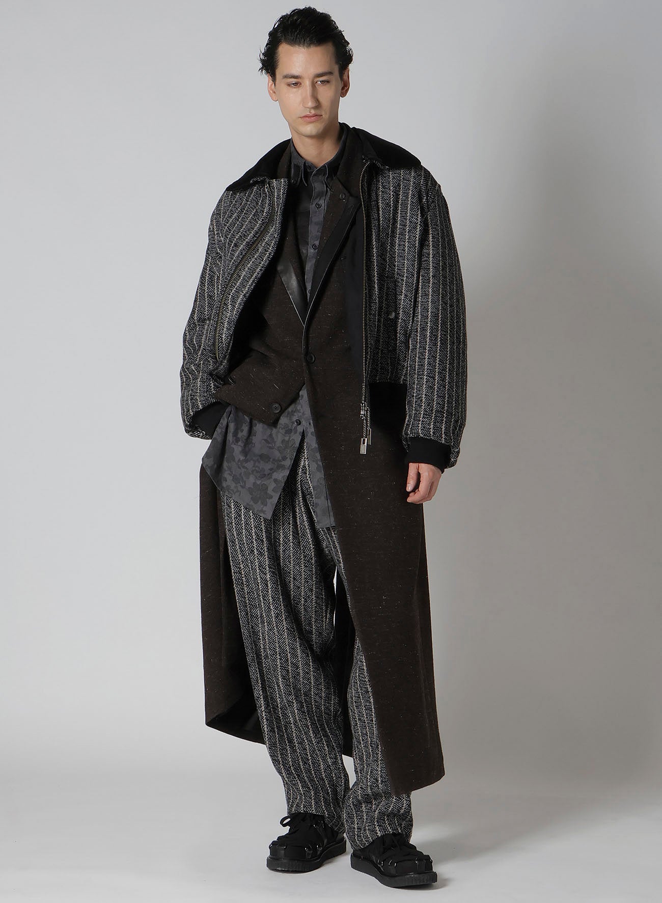 LOOK15의 단일 플리츠 팬츠는 독특한 스트라이프 트위드 패브릭을 특징으로 합니다. 수직 실은 손으로 짠 카디 면이며, 수평의 흰색 린넨과 검은색 실크 실과 결합하여 세 가지 색상의 혼합을 만듭니다. 말 가죽은 옆면 플랩, 뒷부분 오른쪽 플랩, 뒷주머니 가장자리 및 밑단 탭에 사용됩니다.