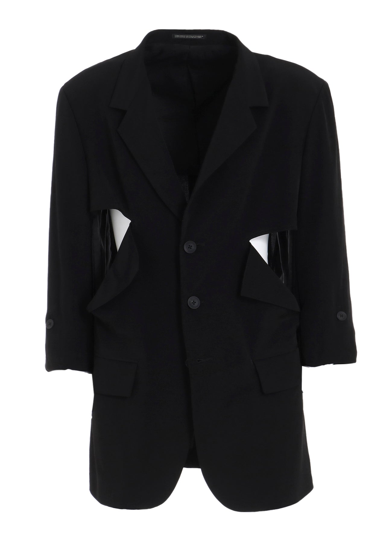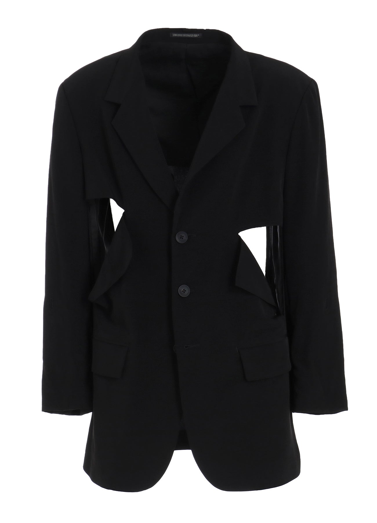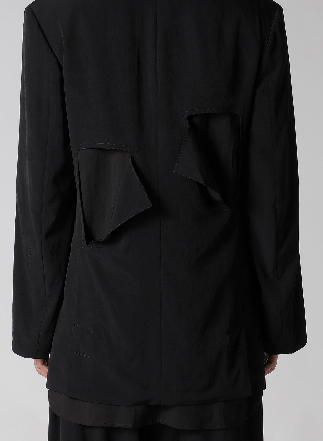 Yohji Yamamoto의 혁신적인 재킷은 상징적인 triacetate와 polyester 소재로 만들어져 은은한 광택과 고급스러운 느낌을 제공합니다. 독특한 앞뒤 슬릿이 매력을 더해 이너웨어와 함께 창의적인 스타일링이 가능하며, 은은한 피부 노출이 가능합니다.