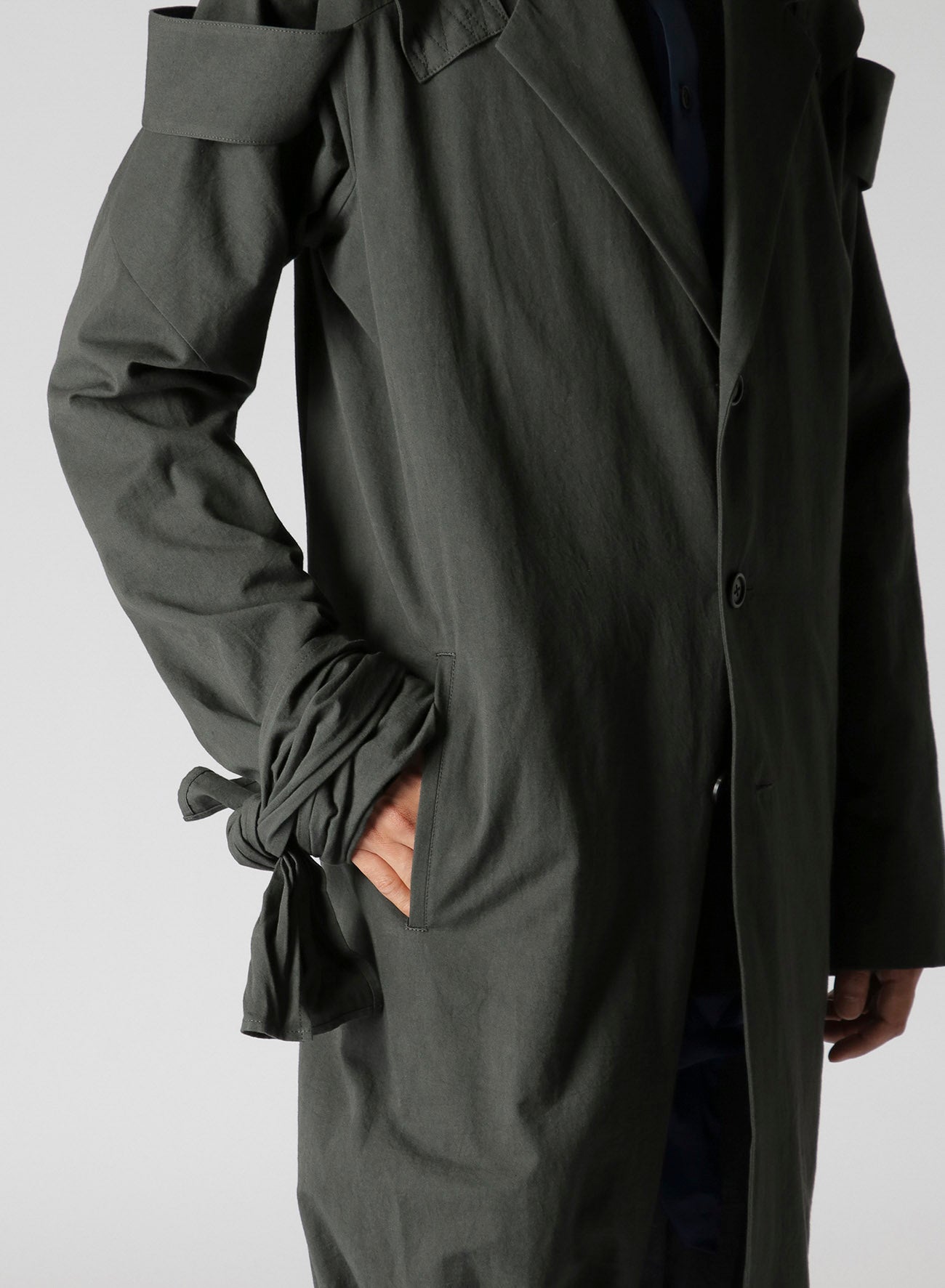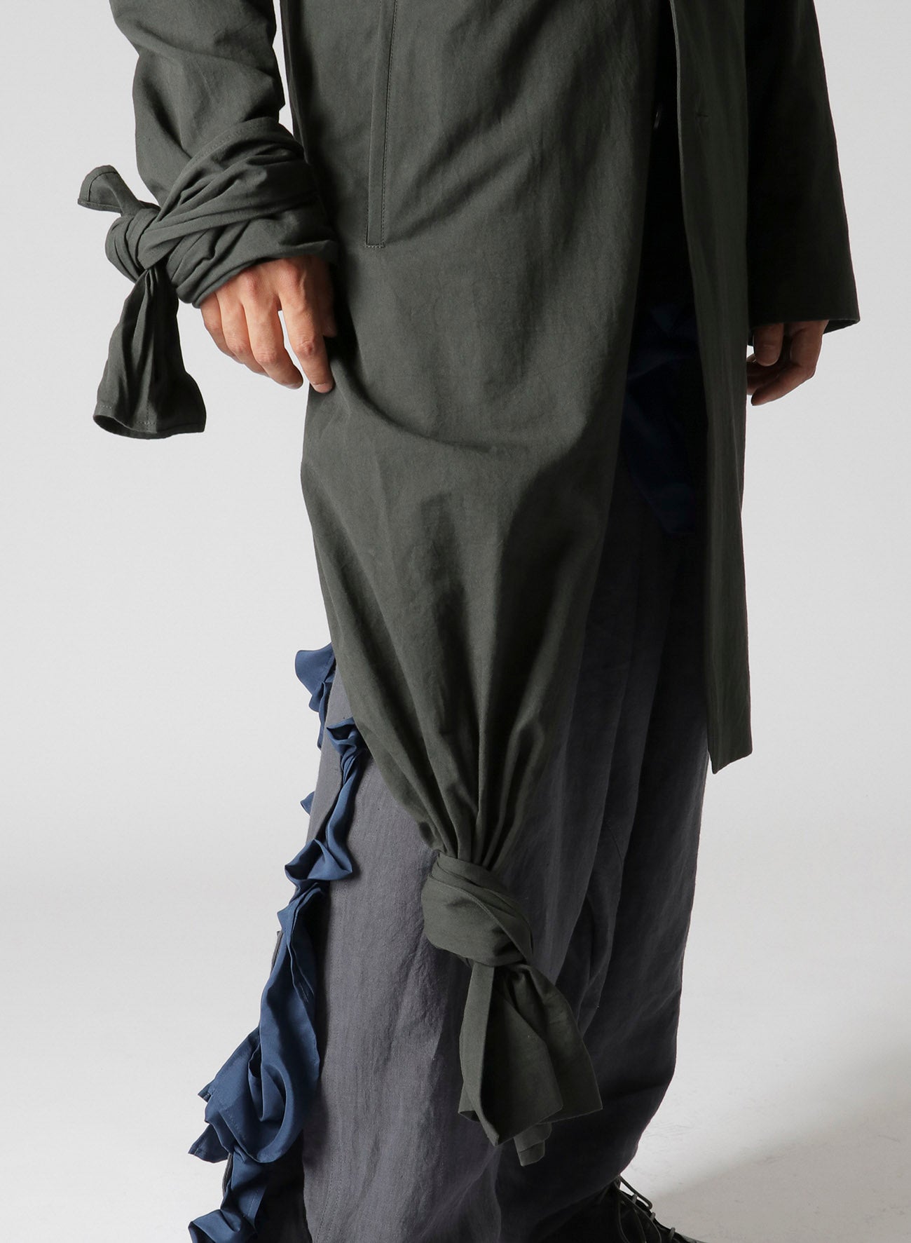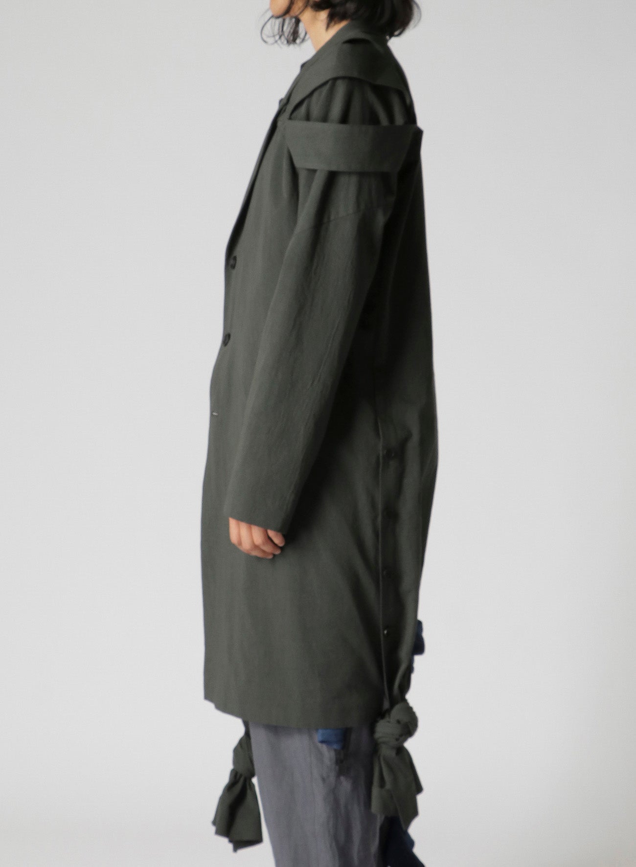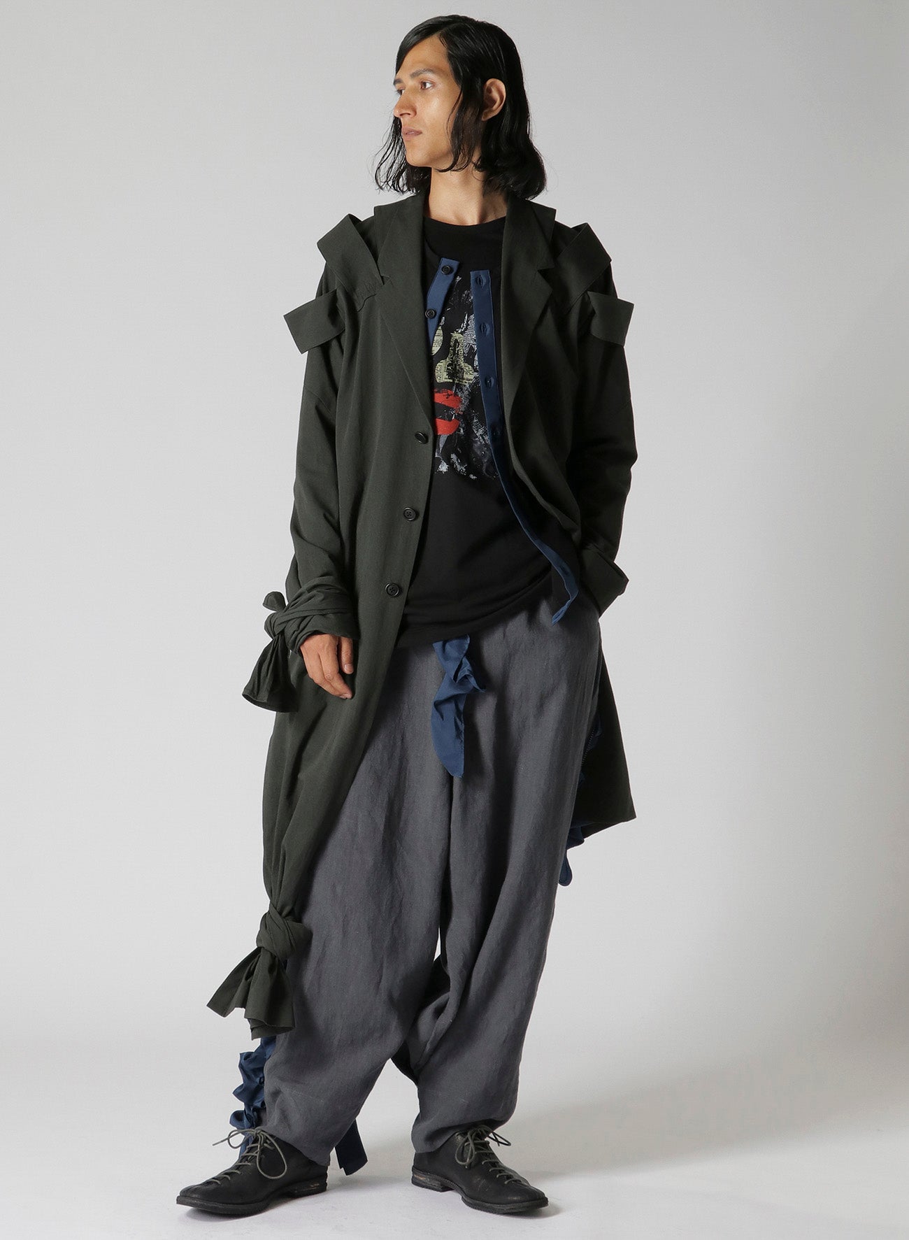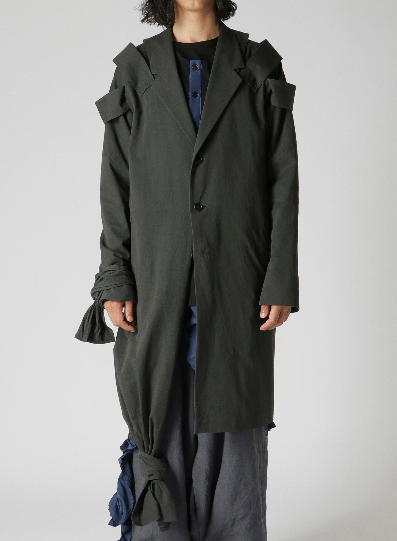 LOOK14의 긴 재킷은 트윌 원단으로 제작되었으며, 어깨 에폴렛이 특징입니다. 밑단을 묶어 착용하도록 디자인되어 조절 가능한 길이를 자랑합니다. 단일 세탁으로 소재가 부드러워져 독특하게 편안한 느낌을 줍니다.
