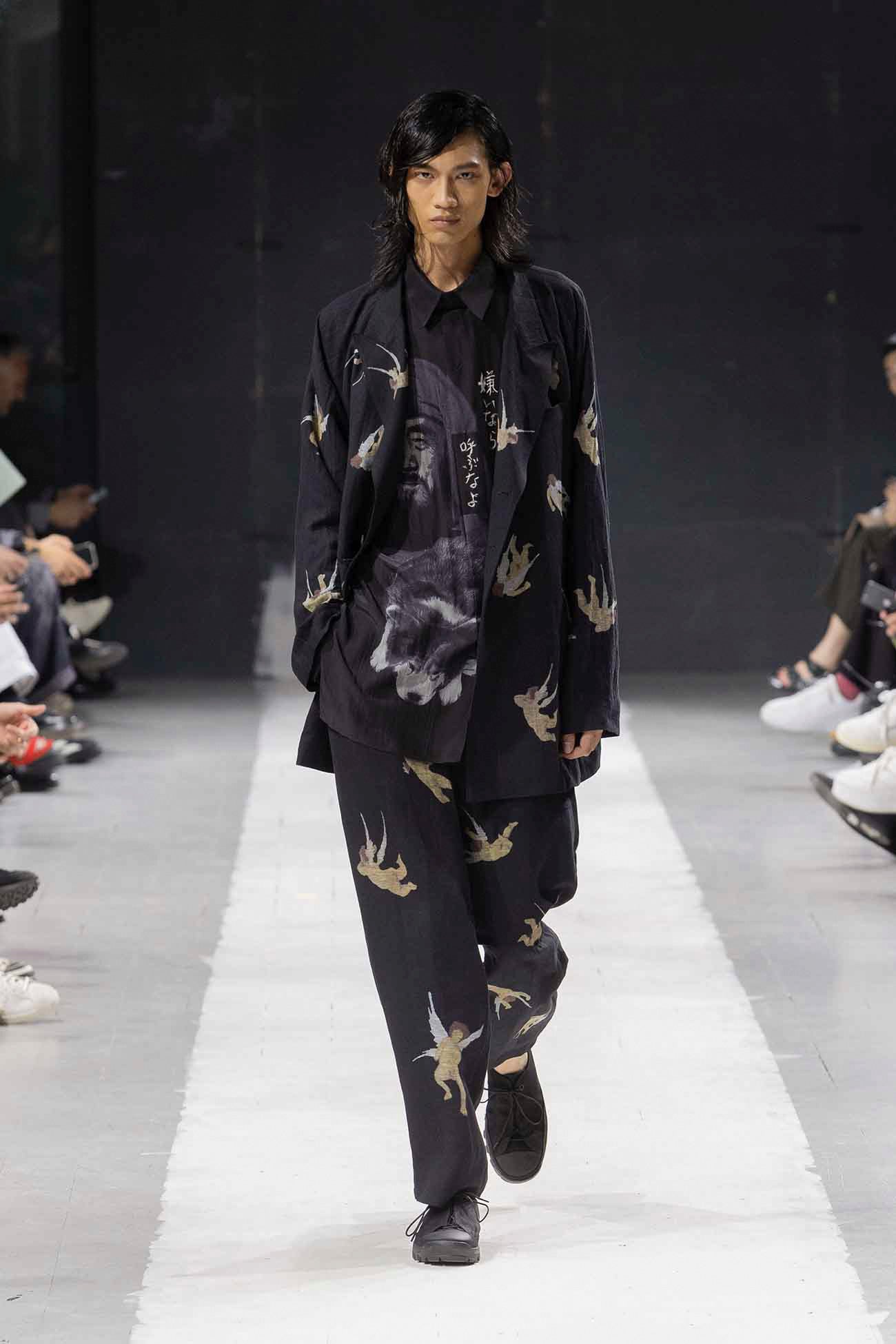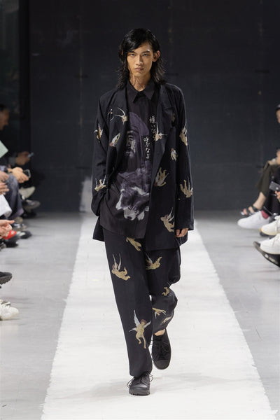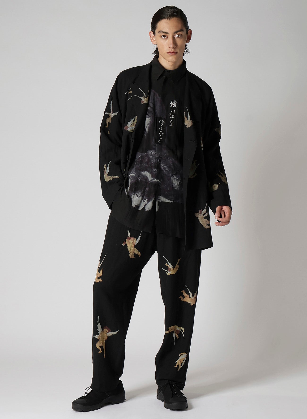 이 래글런 소매 재킷은 레이온과 리넨으로 만들어진 캔버스 원단에 천사 모티프가 특징입니다. 펠리시앵 롭스의 작품 "포르노크라테스"를 바탕으로 디자인이 수정되어 교토 공장에서 잉크젯으로 인쇄되었습니다. 숙련된 장인들이 깊은 색조를 위해 고급 색상 기법을 사용합니다.