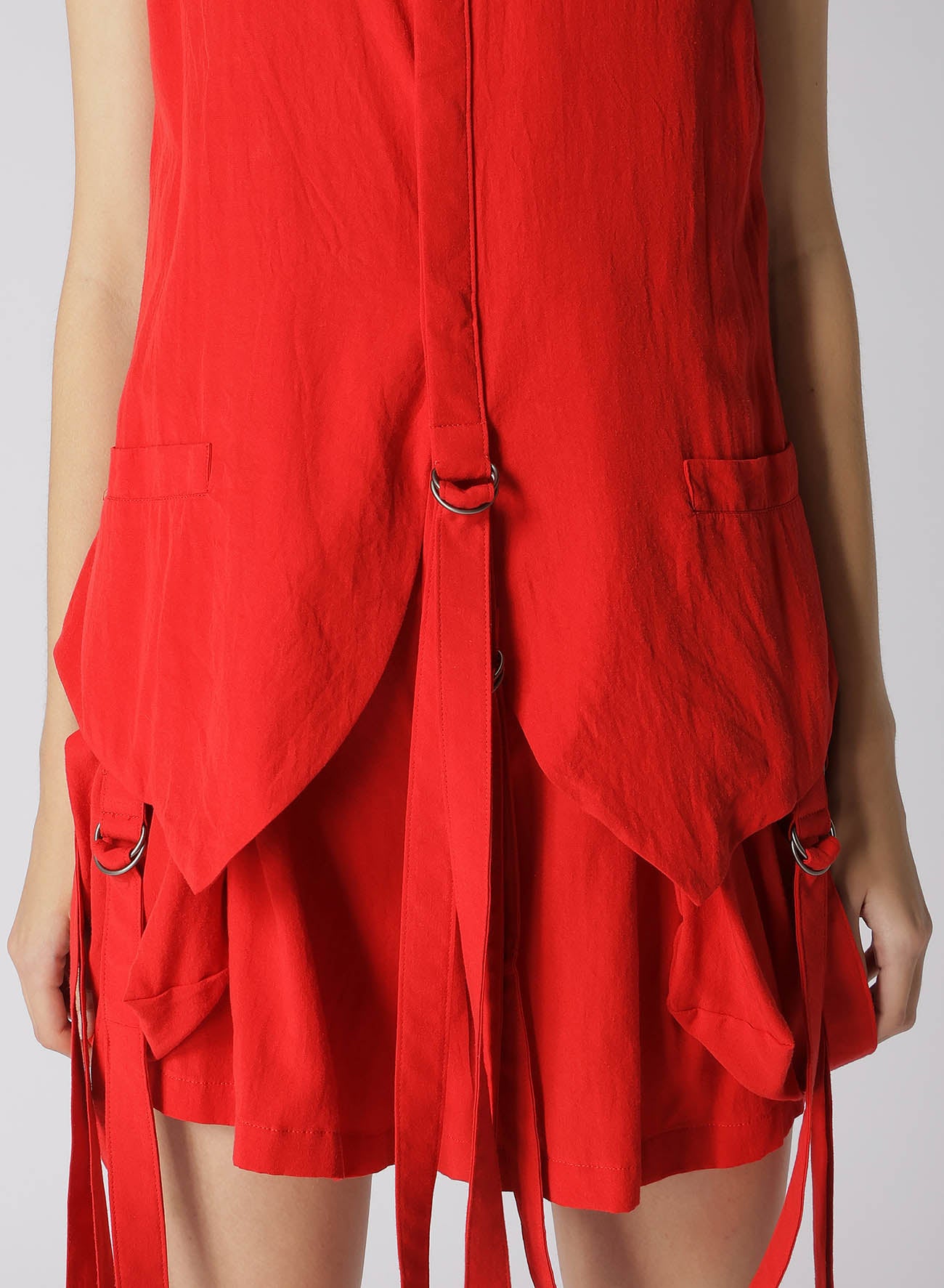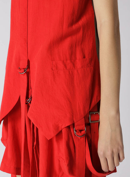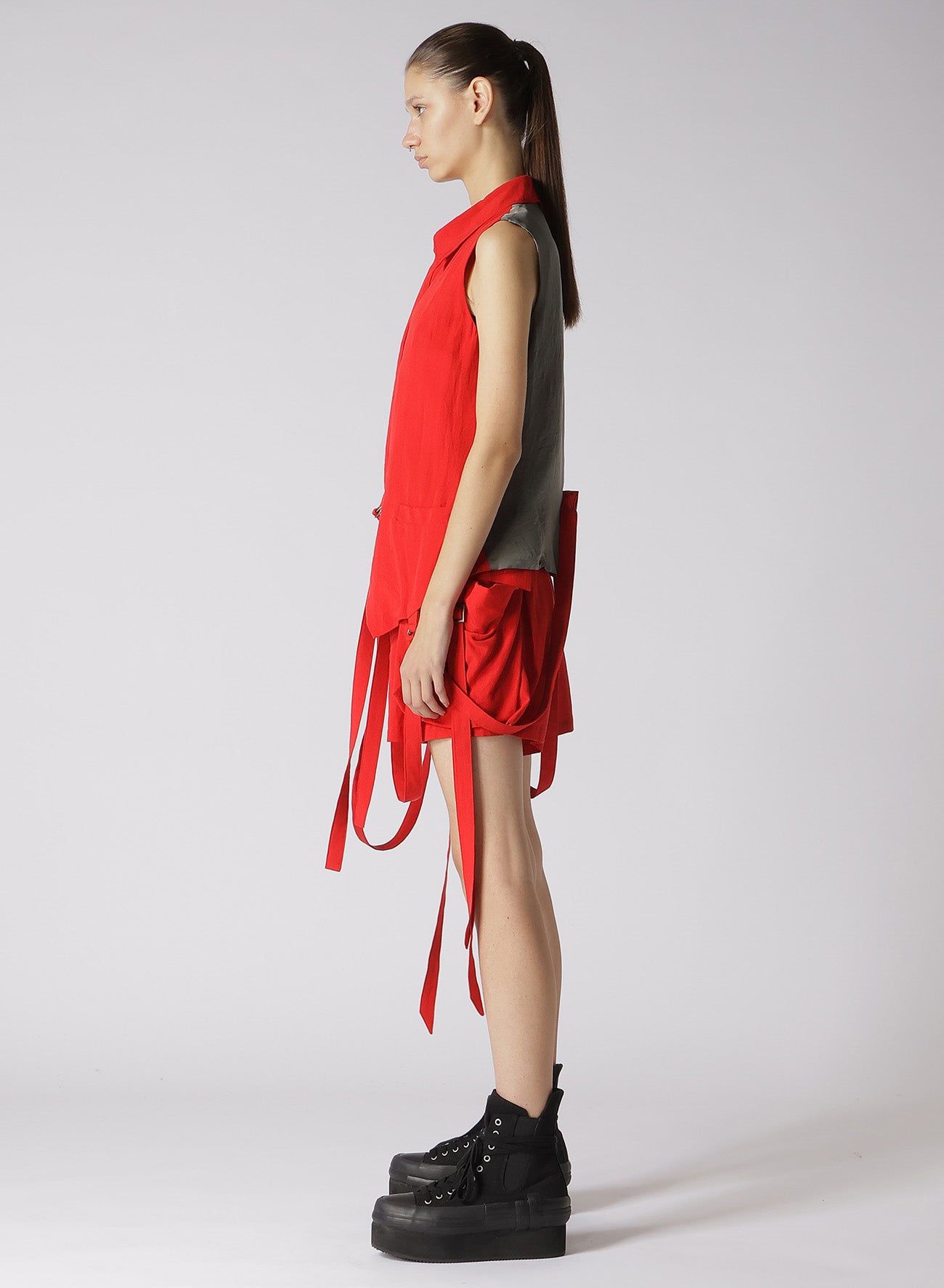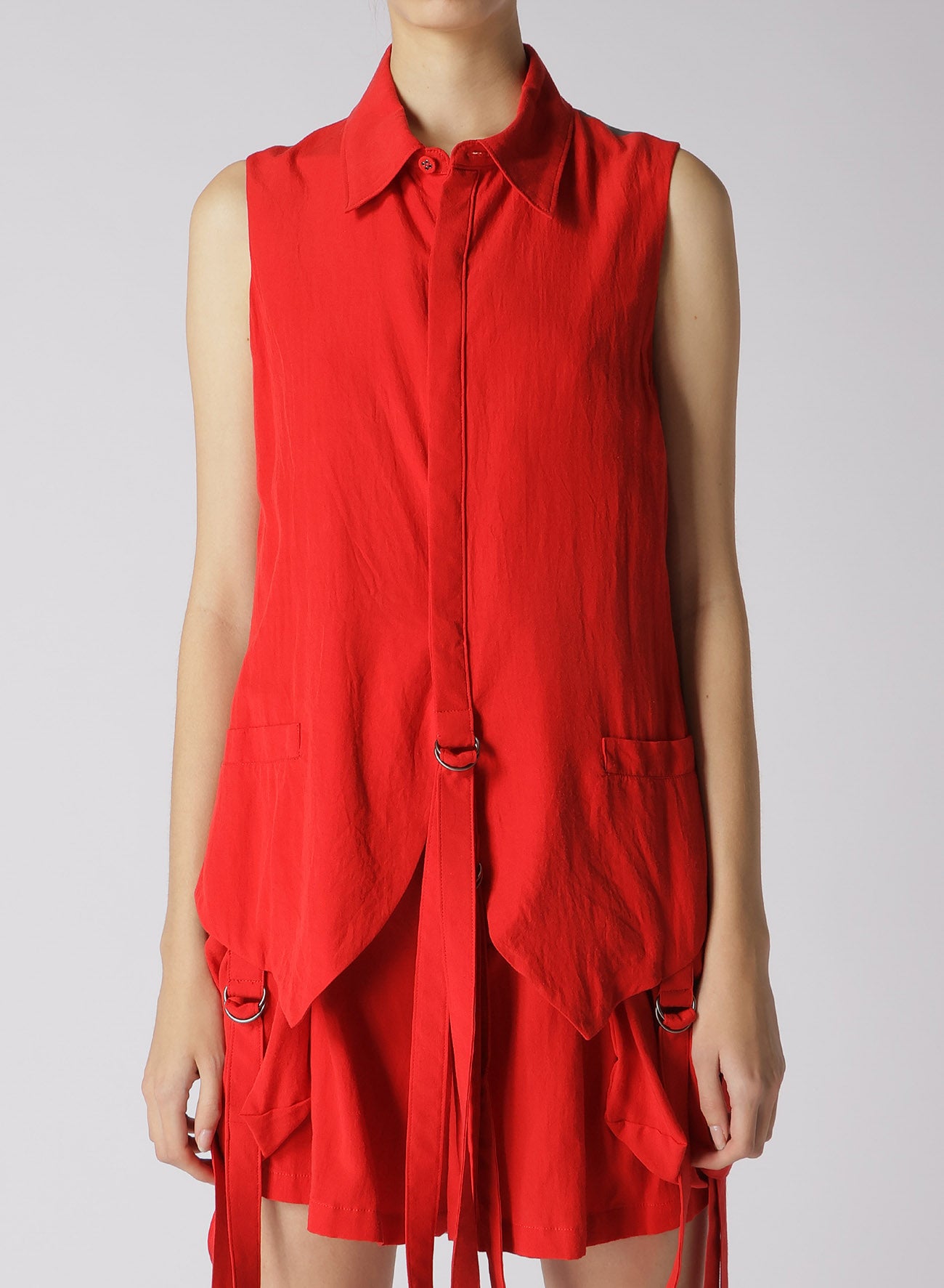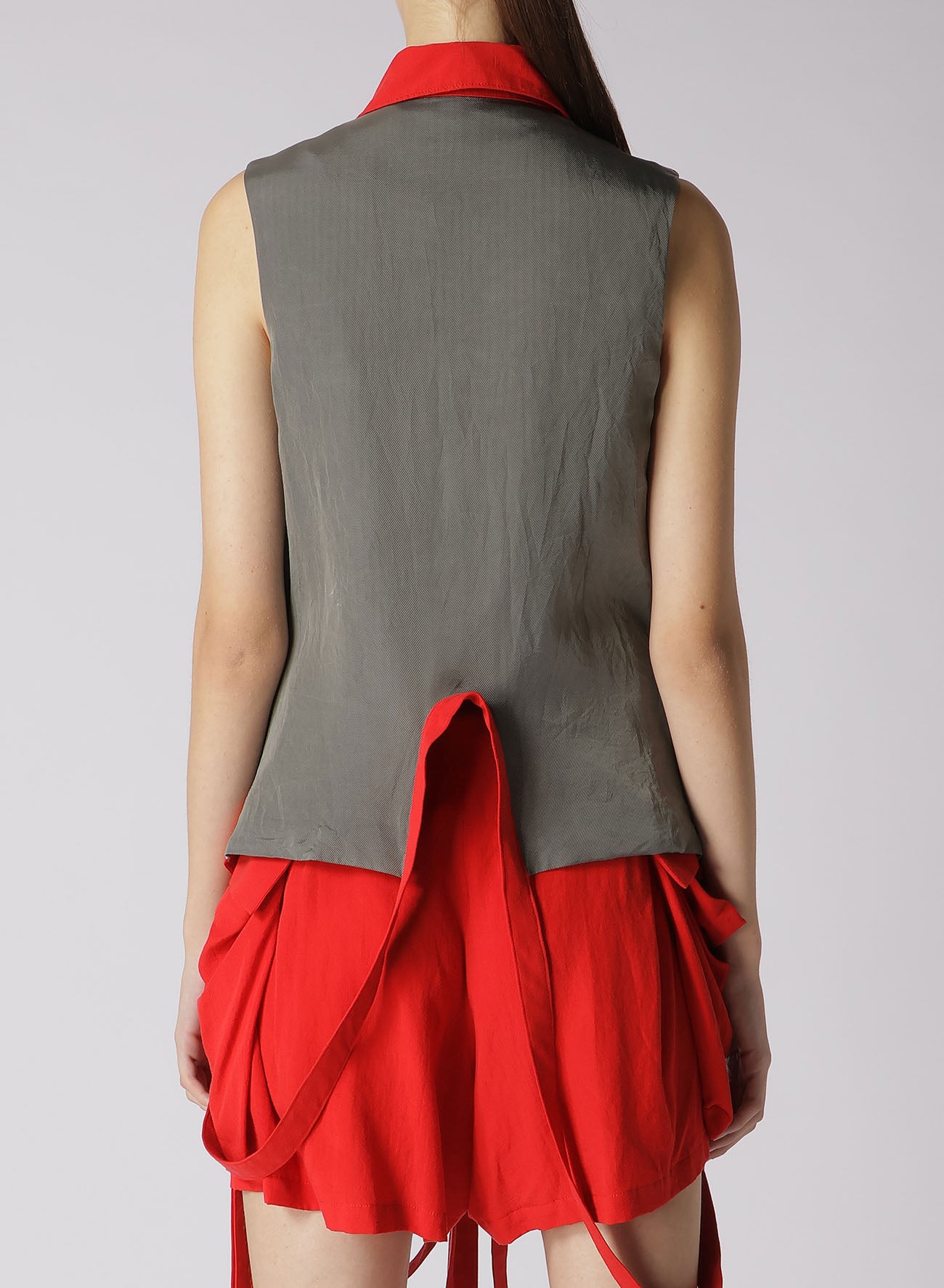 이 조끼는 부드럽고 드레이프감 있는 원단에 약간의 광택이 있어 블라우스 같은 느낌을 줍니다. 몸체에 숨겨진 버튼이 독특한 외관을 더해 다양한 용도로 활용할 수 있습니다.