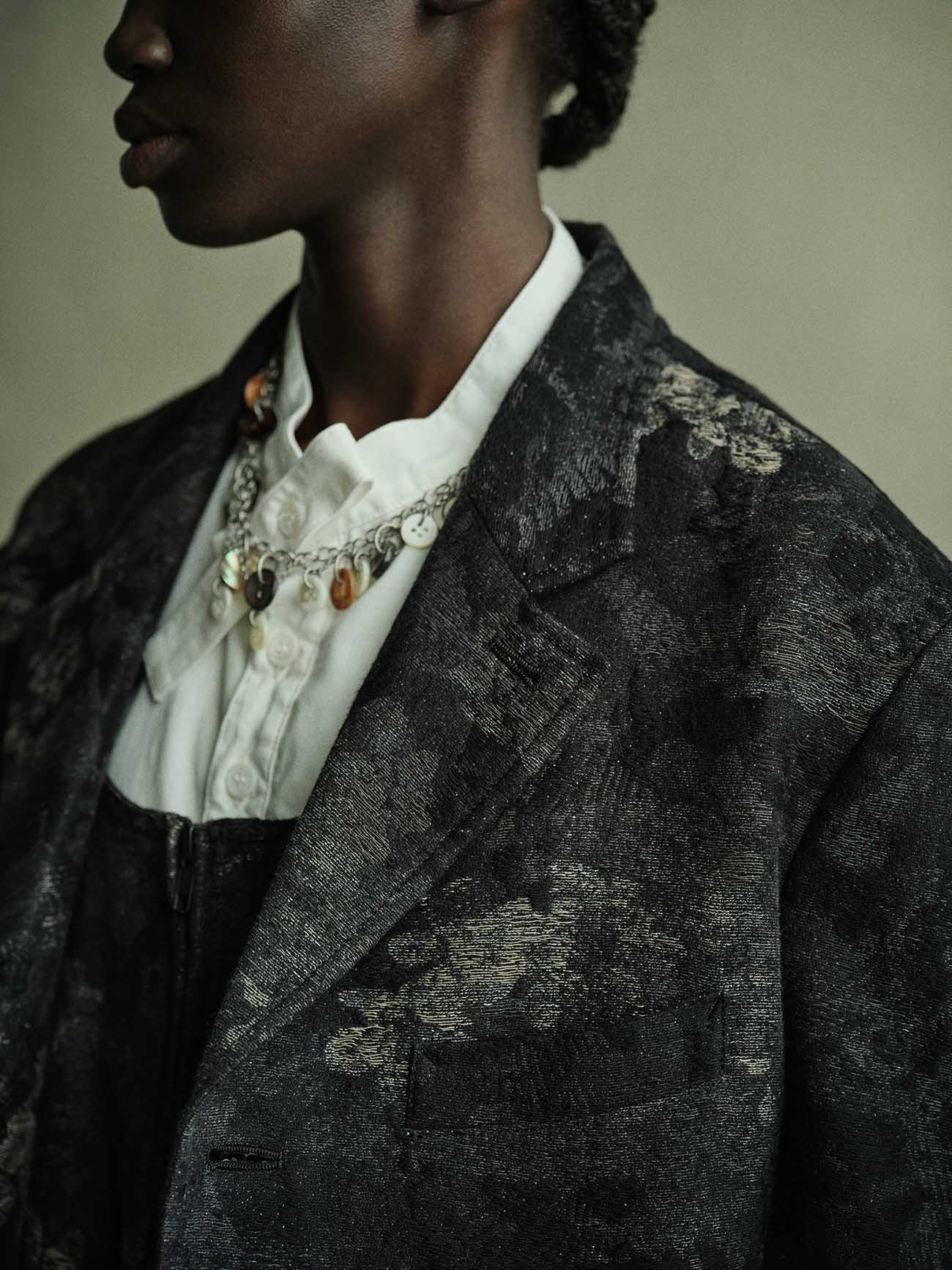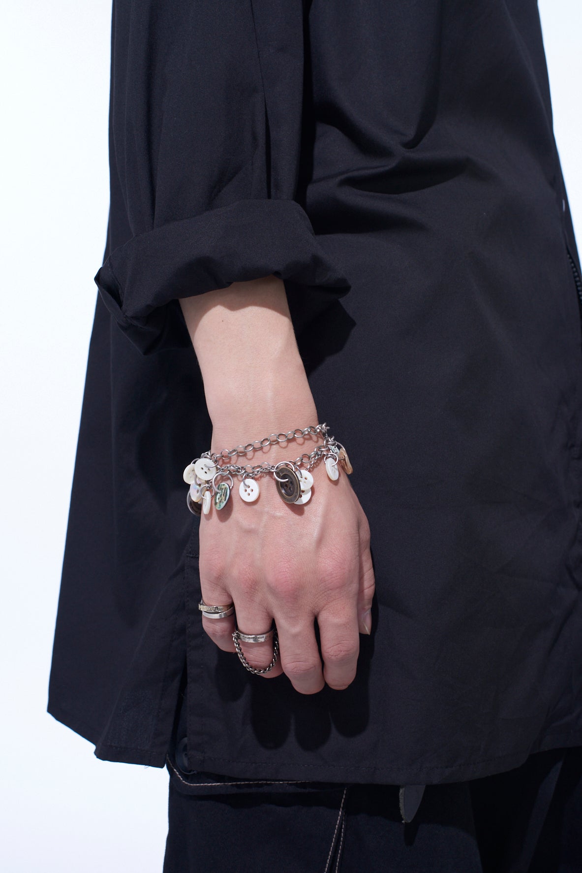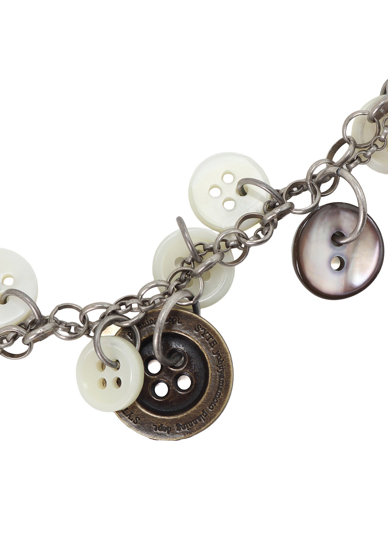 이 목걸이는 버튼 디자인과 골드, 실버, 블랙 마감의 황동 및 조개로 만들어졌으며, 앤티크 스타일의 로고가 특징입니다. 텍스처와 패턴이 돋보이며 손목에 착용할 수 있어 다양하게 사용 가능합니다. 체인의 길이는 투-웨이 스타일을 돋보이게 합니다.