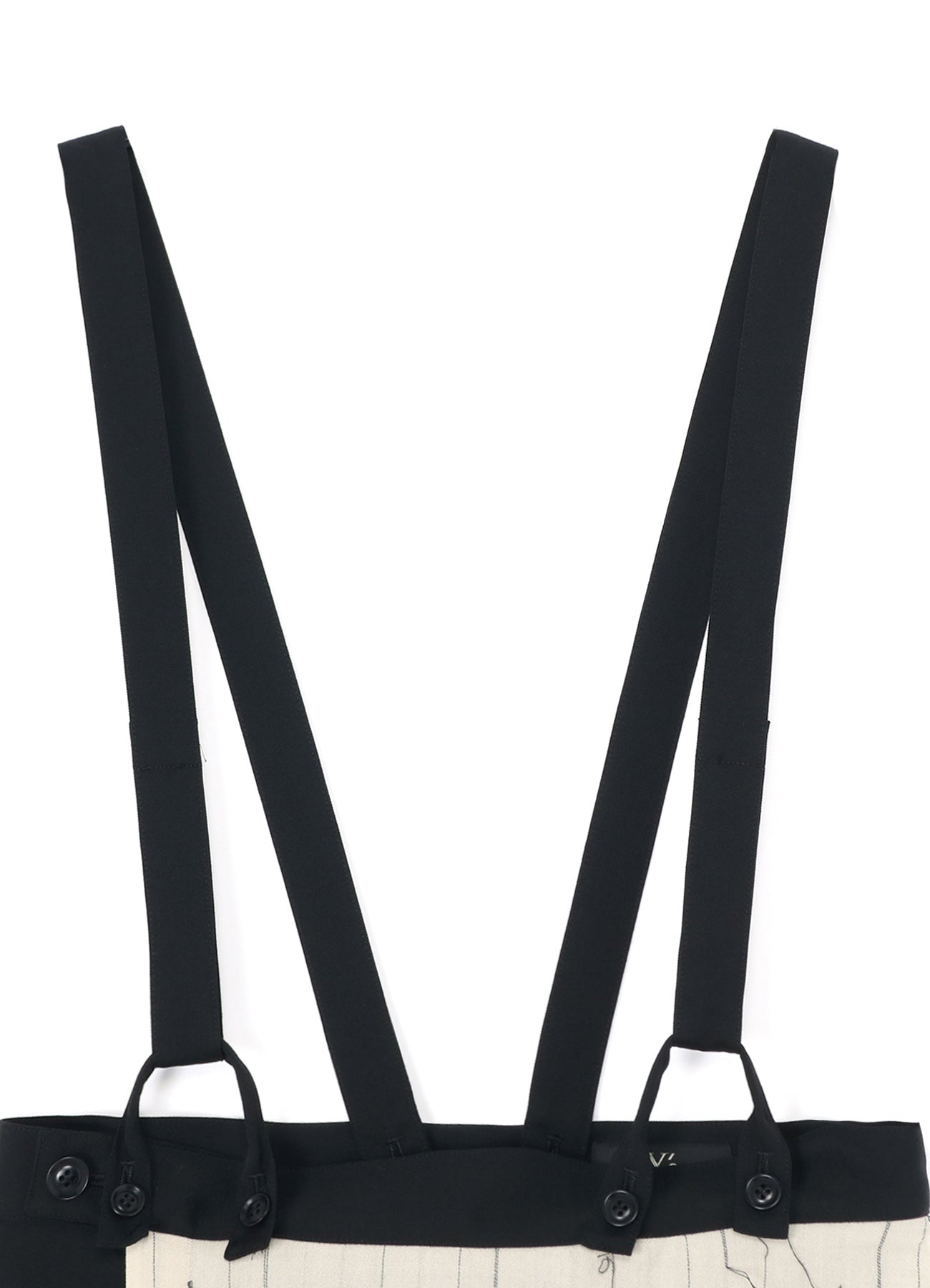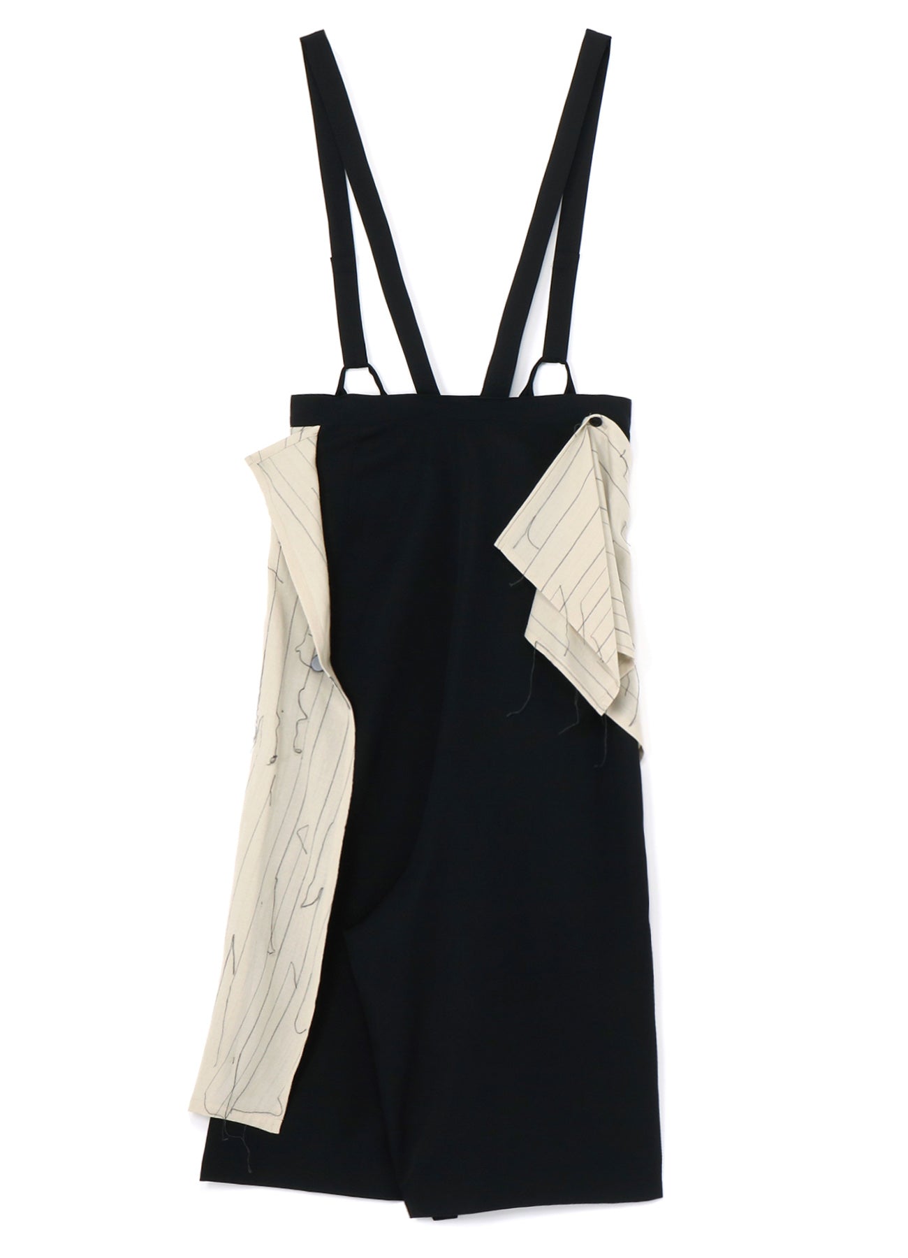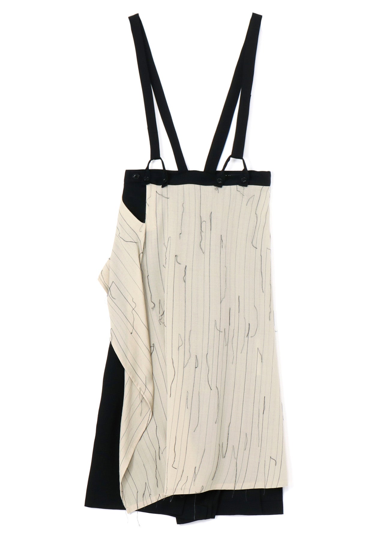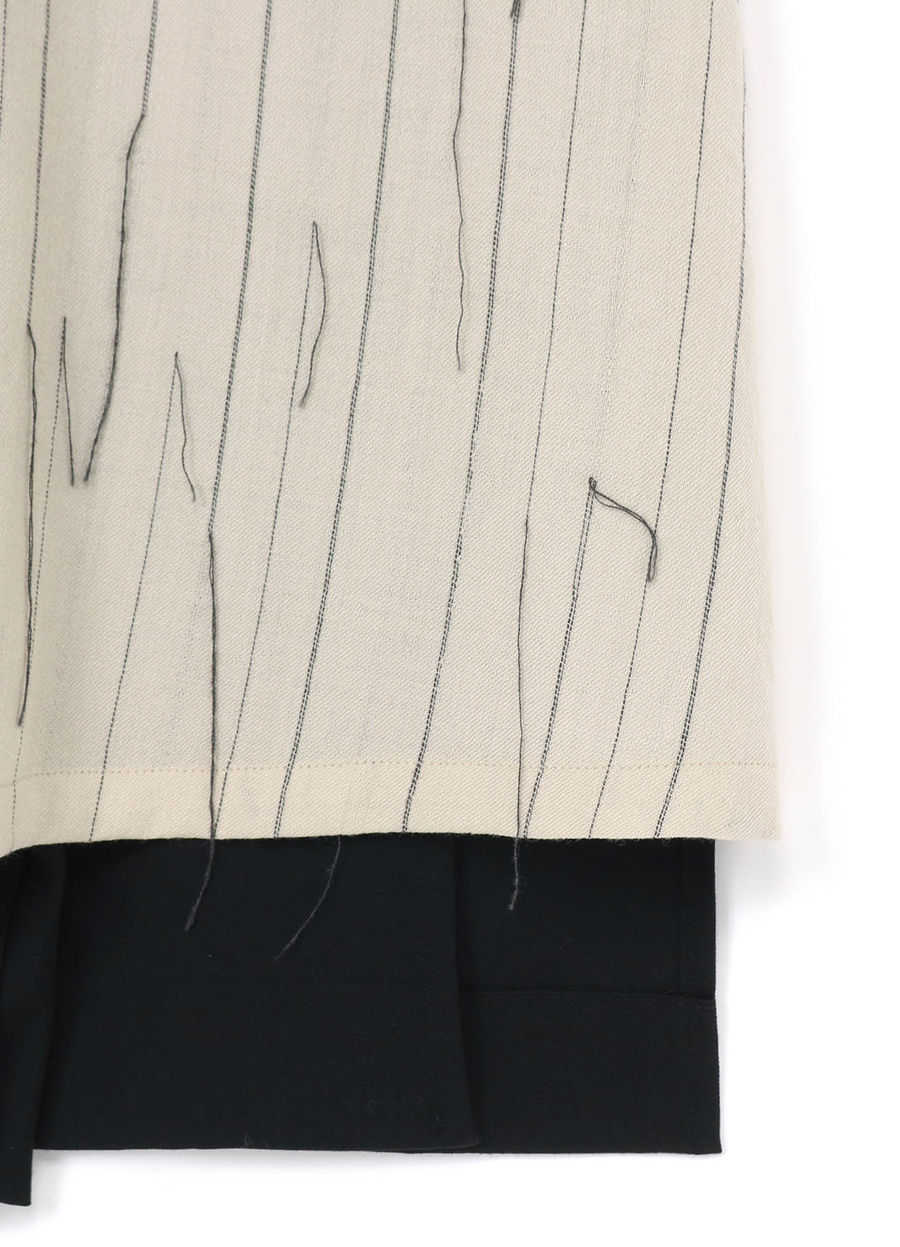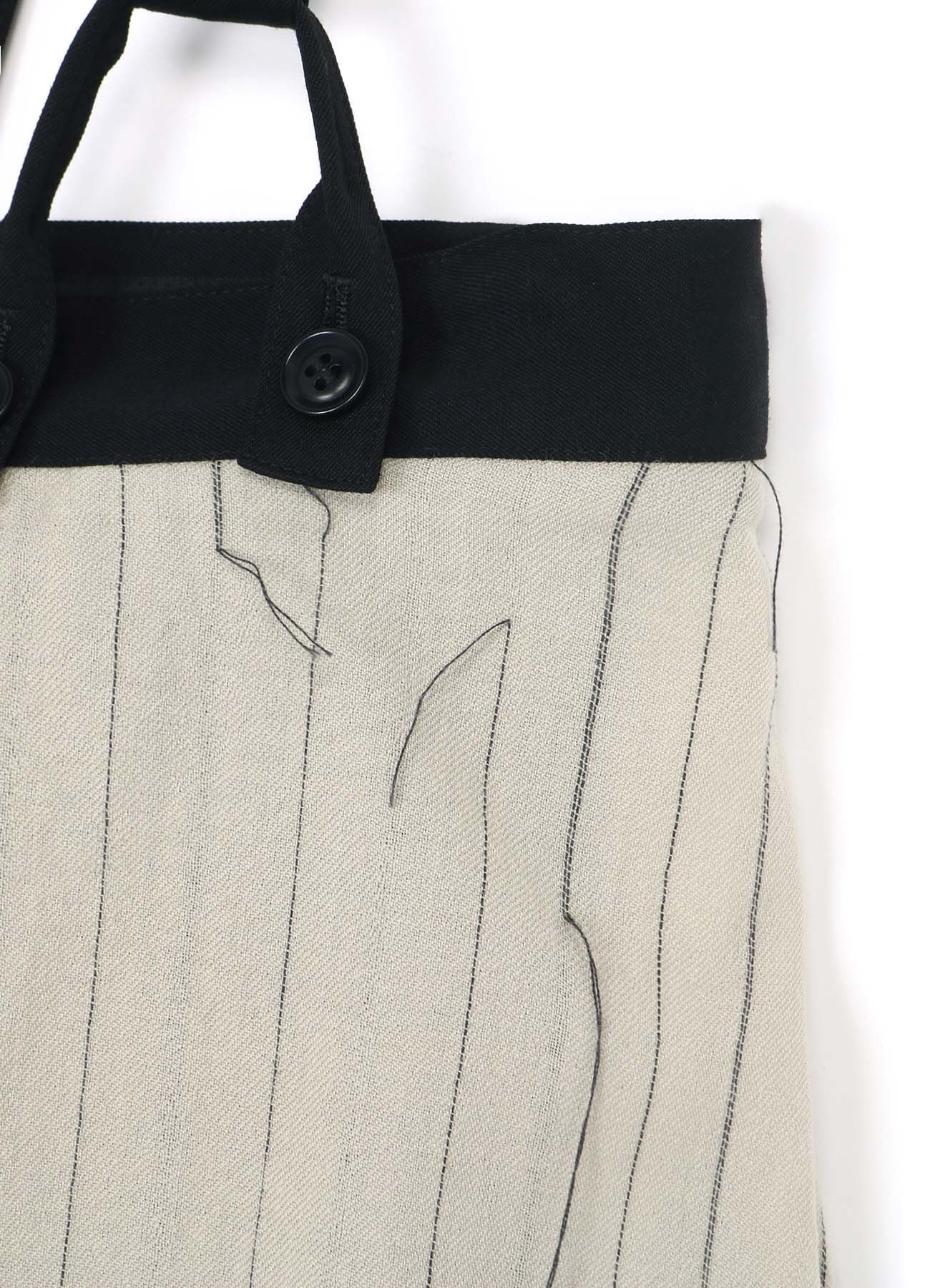 드레이프 룩의 독특한 팬츠 스커트로, 헤진 듯한 스트라이프 패턴 원단과 융합된 울 가바딘으로 제작되었습니다. 면 실은 간헐적으로 пропущены и 손으로 잘라내어 헝겊 같은 외관을 제공합니다. 앞쪽 원단이 아래의 편안한 팬츠를 덮어 스커트 같은 모양을 만듭니다.