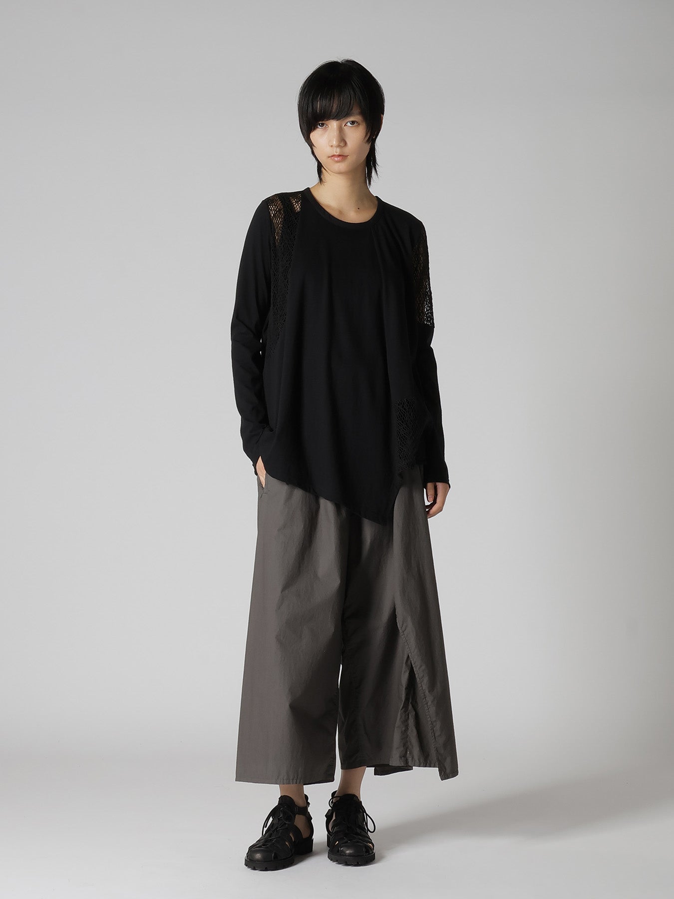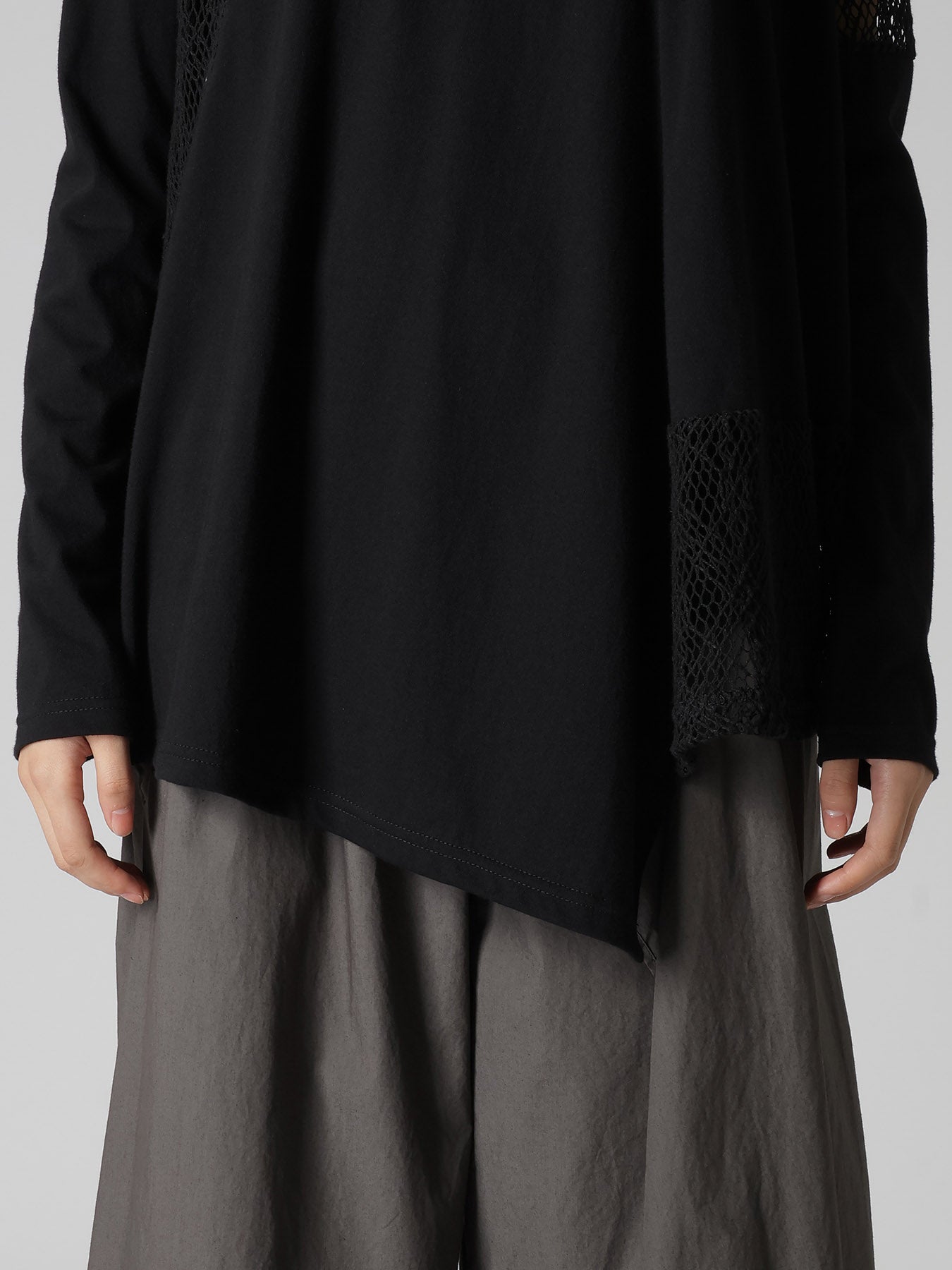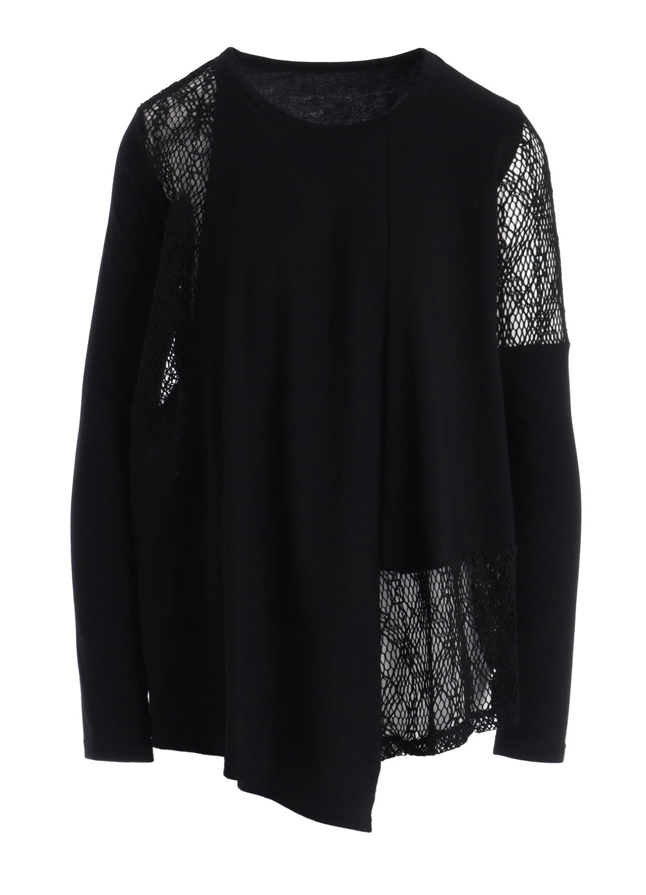 This long-sleeve top features a combination of random Russell knit lace, giving it an intricate look akin to patchwork. The semi-sheer design allows inner wear to be visible, creating a layered appearance. Perfect for adding a unique touch to your outfit, it can be worn all throughout the season.