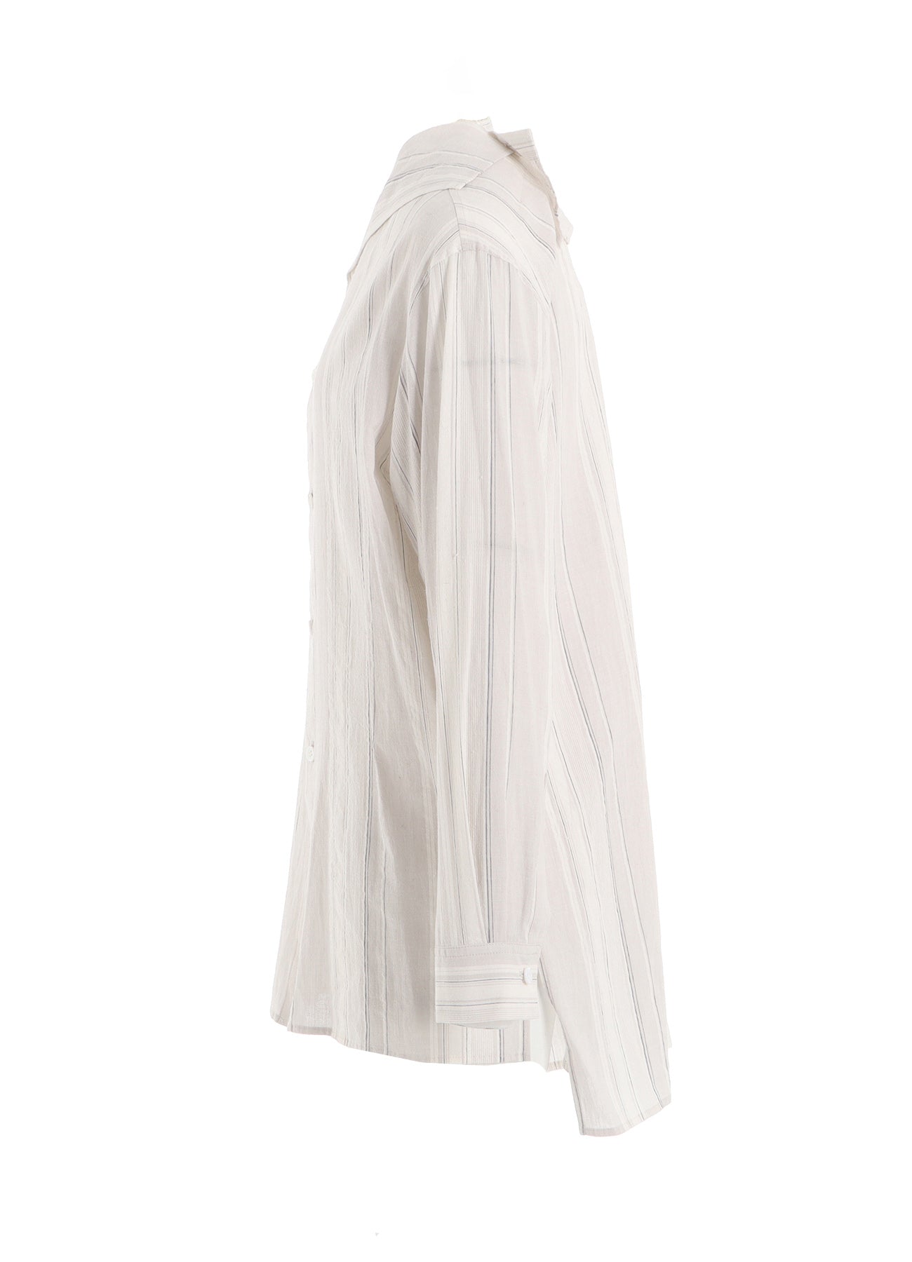 이 블라우스는 앞에서 후드처럼 보이는 라이트 스트라이프 세일러 칼라 스타일로, 뒤에서는 세일러 느낌이 돋보입니다. 스파게티 스트랩 점퍼 드레스와 함께 입으면, 칼라가 스타일리시한 액센트 역할을 합니다.