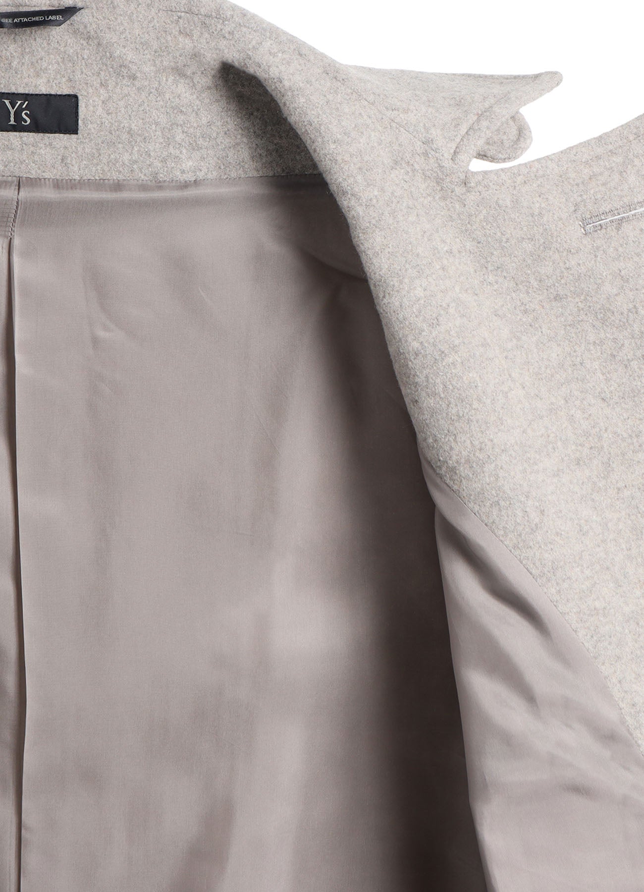 This Y's short coat uses their signature Airy Mosser, known for its lightweight and soft texture resembling moss. The coat features a chin strap for styling versatility, allowing the collar to be worn up. Its loose sleeves showcase longer inner wear, making it ideal for layered looks.