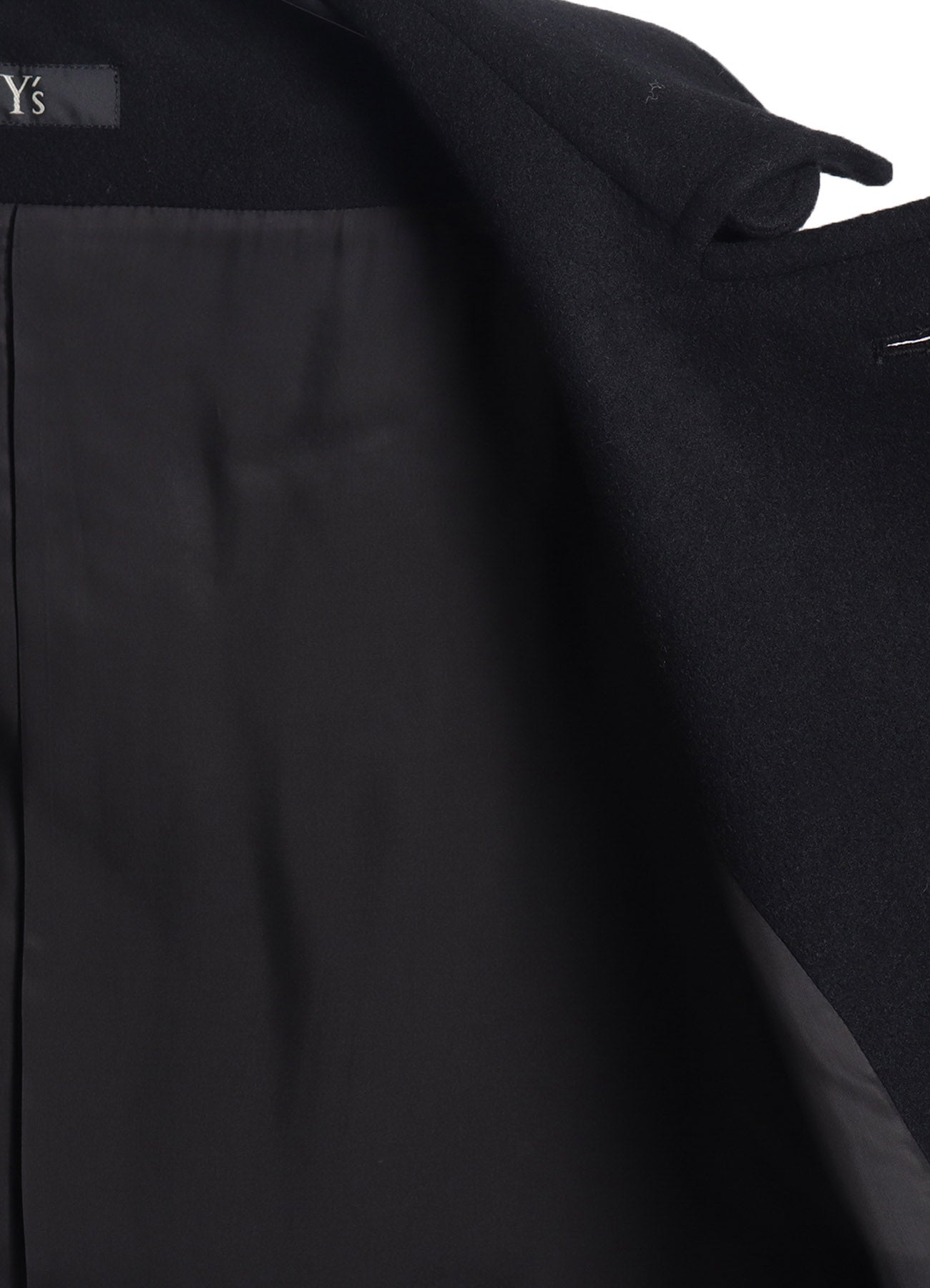 This Y's short coat uses their signature Airy Mosser, known for its lightweight and soft texture resembling moss. The coat features a chin strap for styling versatility, allowing the collar to be worn up. Its loose sleeves showcase longer inner wear, making it ideal for layered looks.