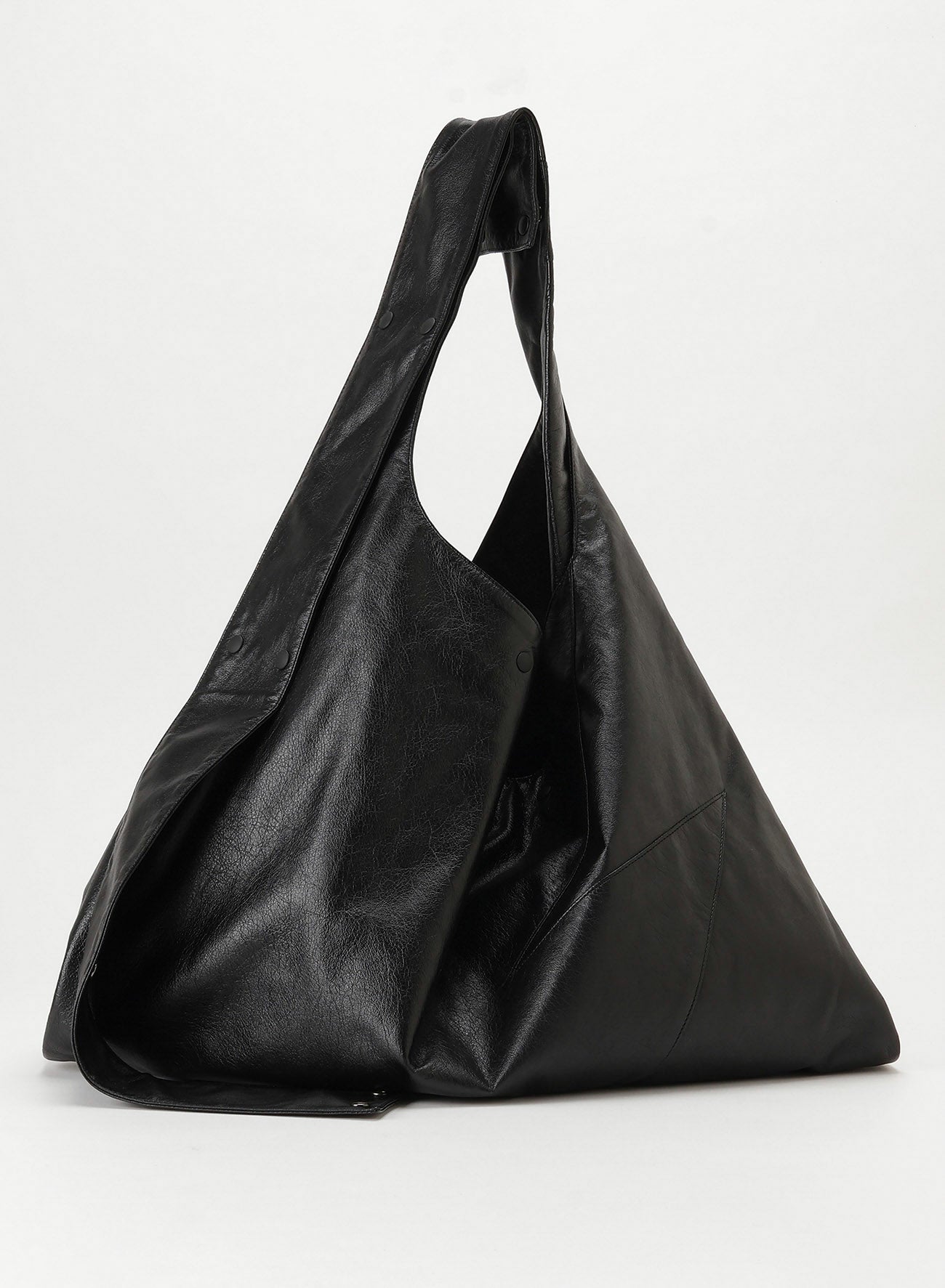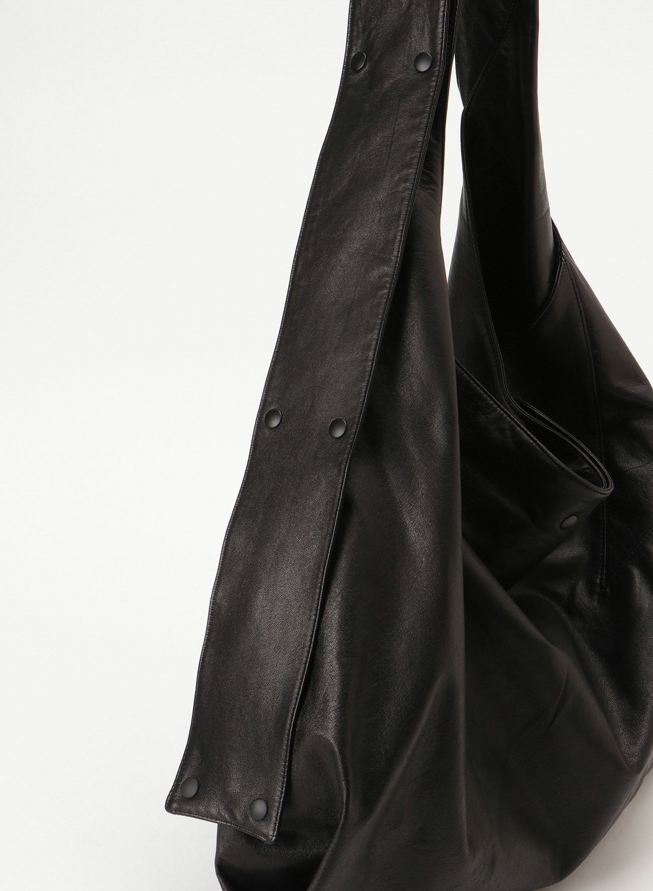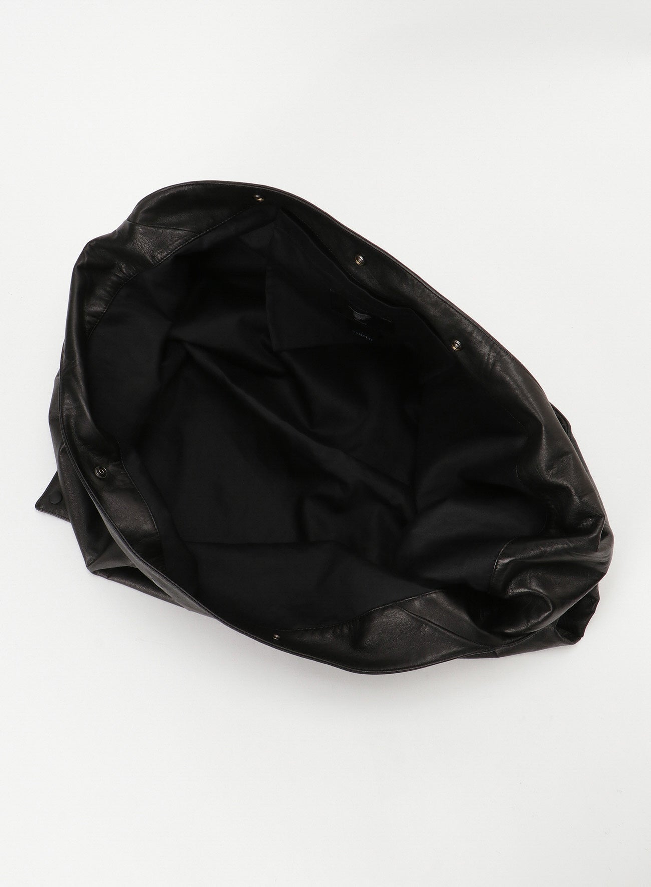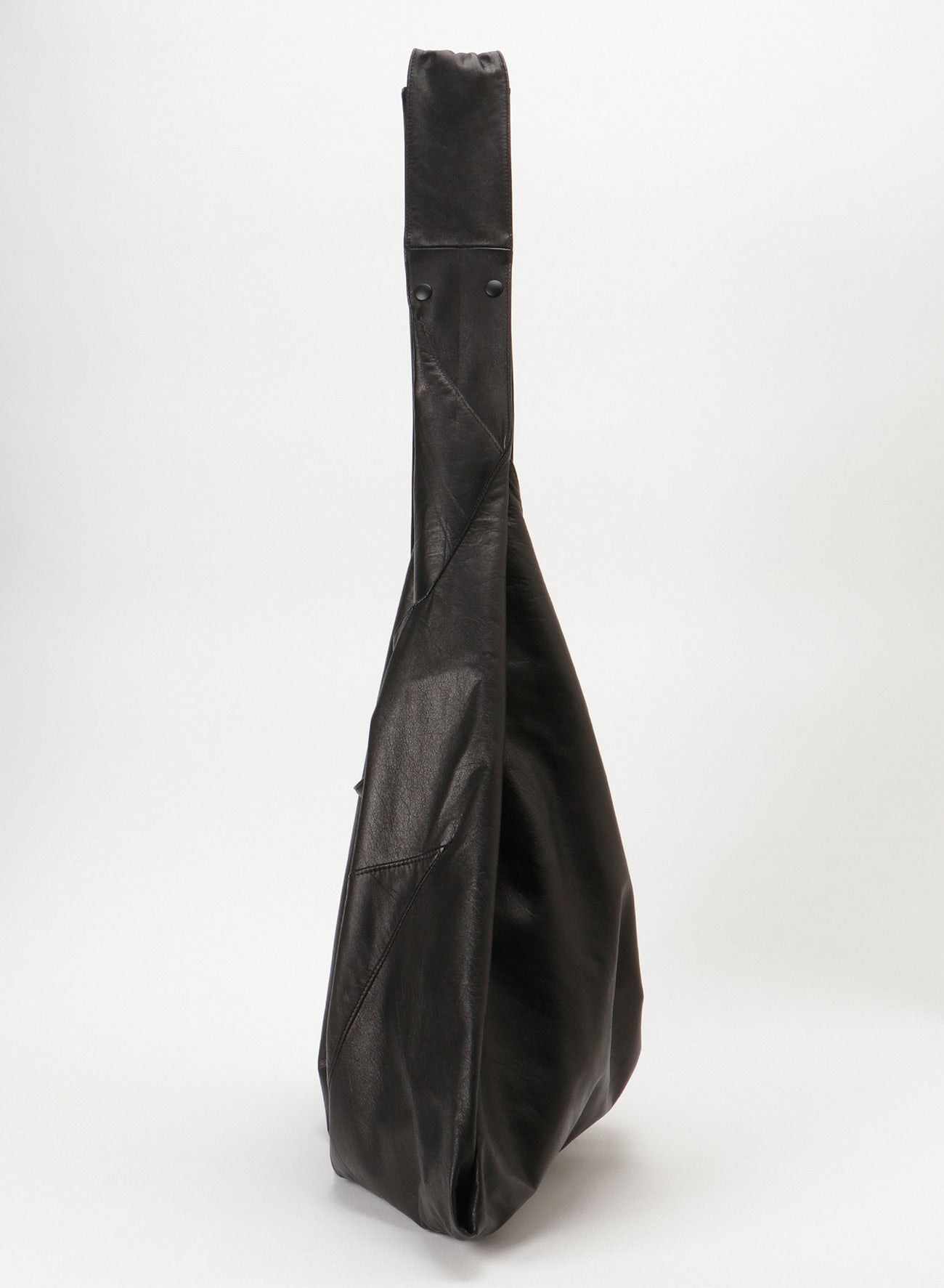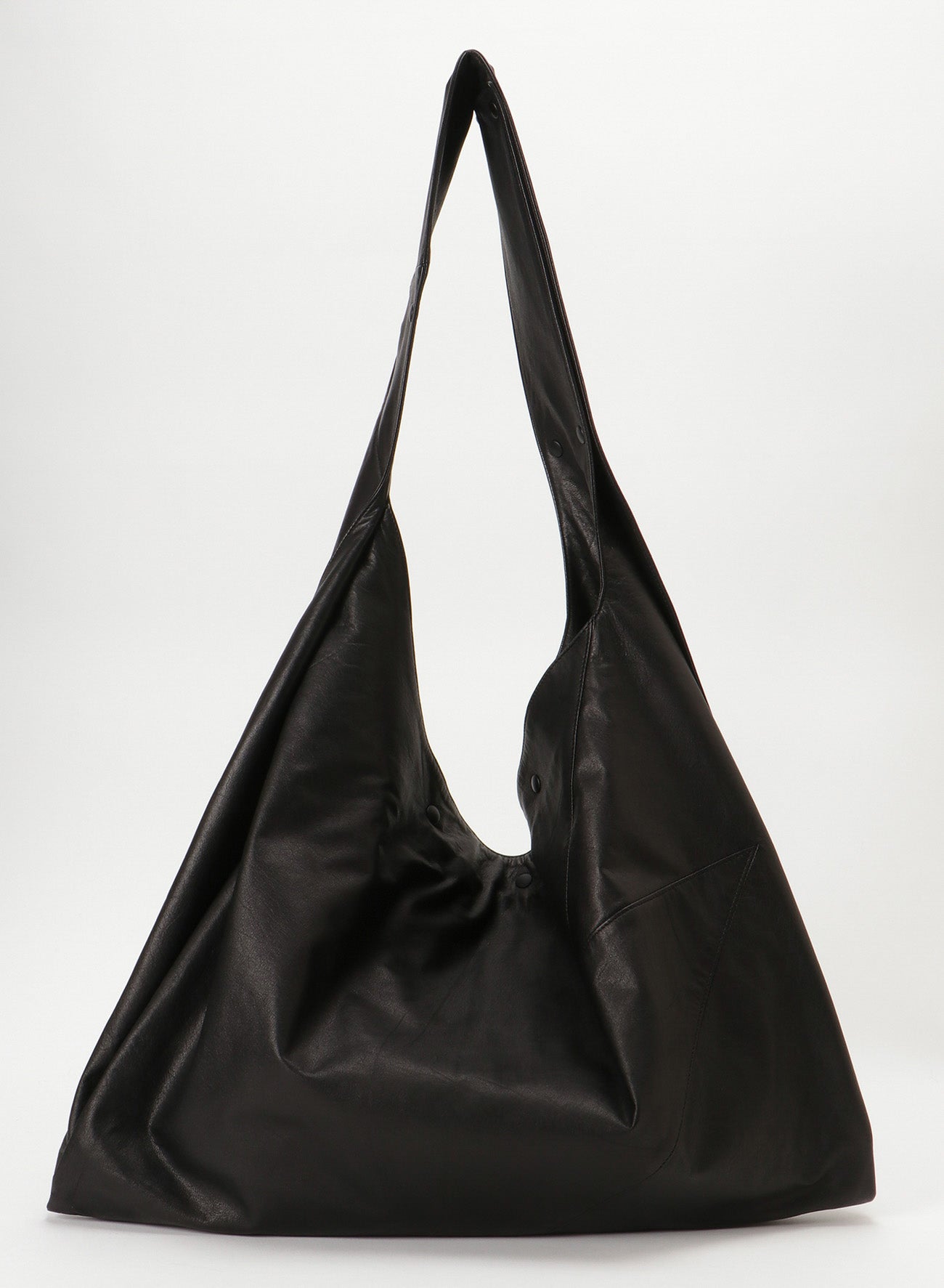 This discord Yohji Yamamoto bag is a transformed version of the iconic "INFINITY" bag, offering versatility as a shoulder or hand bag. It features an expanded width and asymmetric design with adjustable shoulder length via dot buttons.