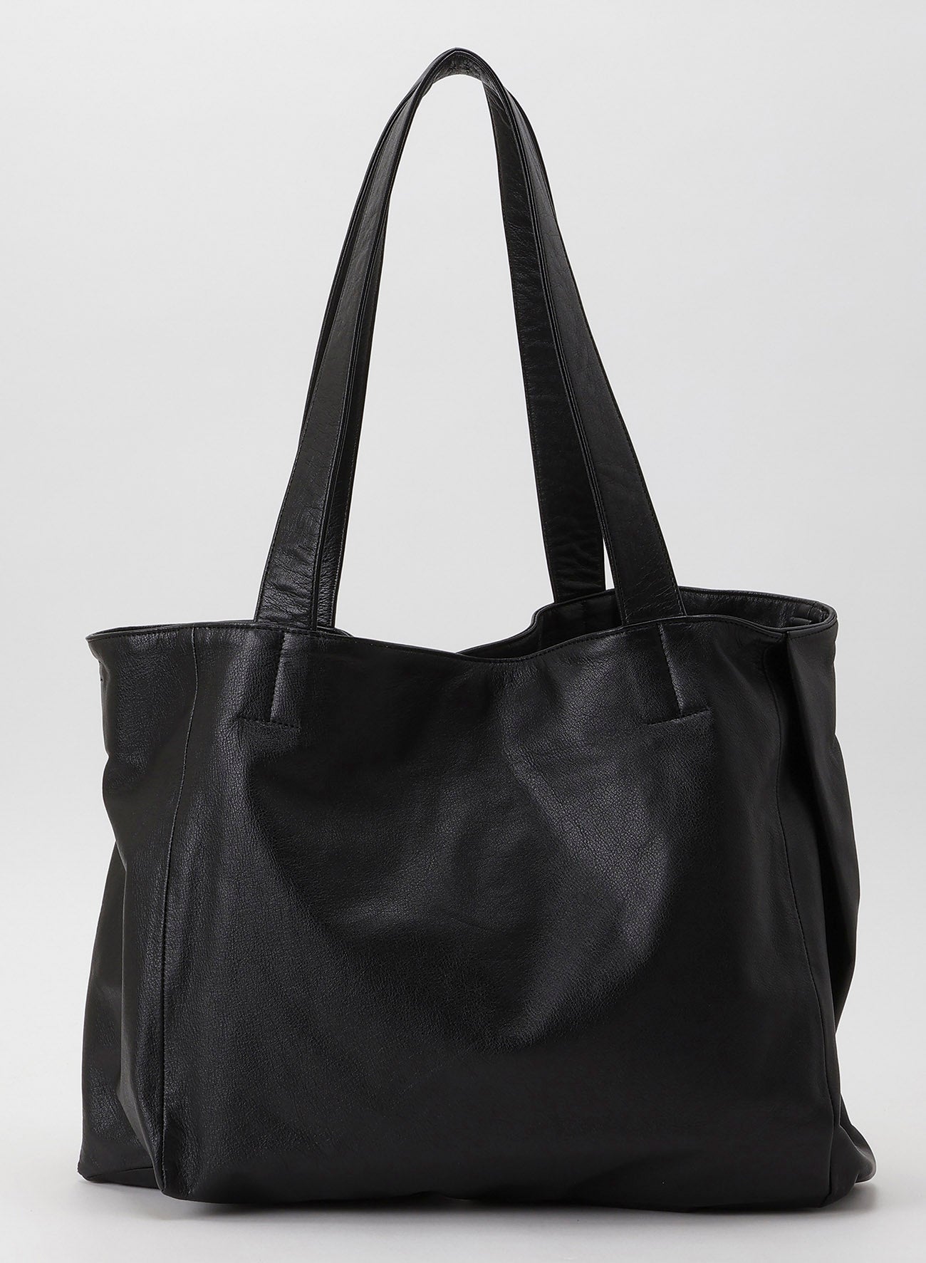 The tote bag features a single pleat in the front for a subtle three-dimensional effect. Despite its voluminous appearance, the bag is delicately adjusted using combination and pleats for practicality. It can hold A4 items and has a removable shoulder strap. Made from garment leather, it may have natural leather imperfections.