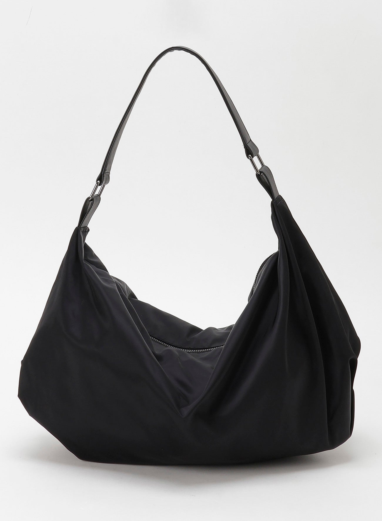 This minimalist nylon bag series features a rectangular pattern for a seamless look. The design highlights the drapery of soft nylon, enhanced by the weight of carried items. It uses military-inspired high-density nylon twill and embossed leather known as Keshibo, which is resistant to scratches.