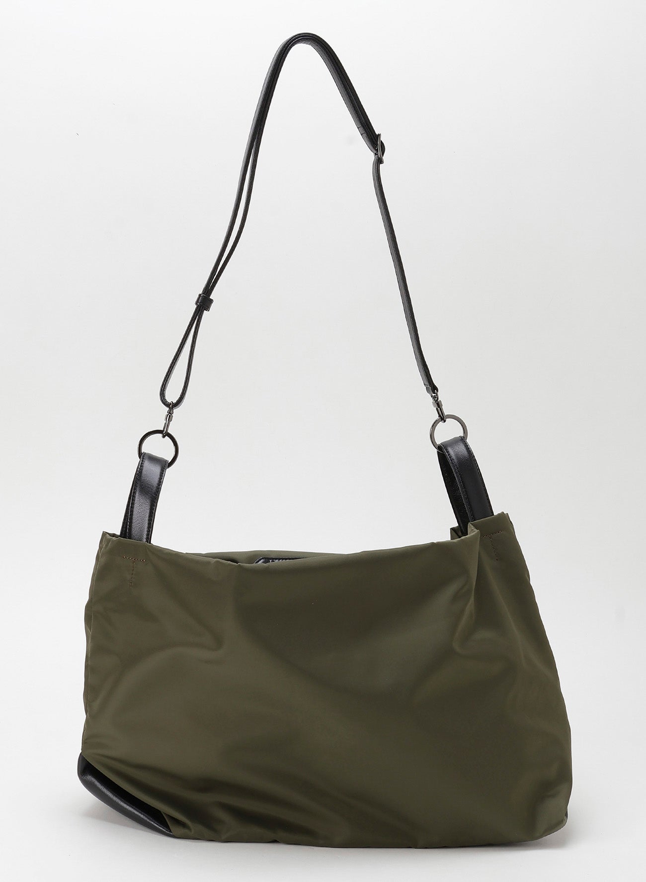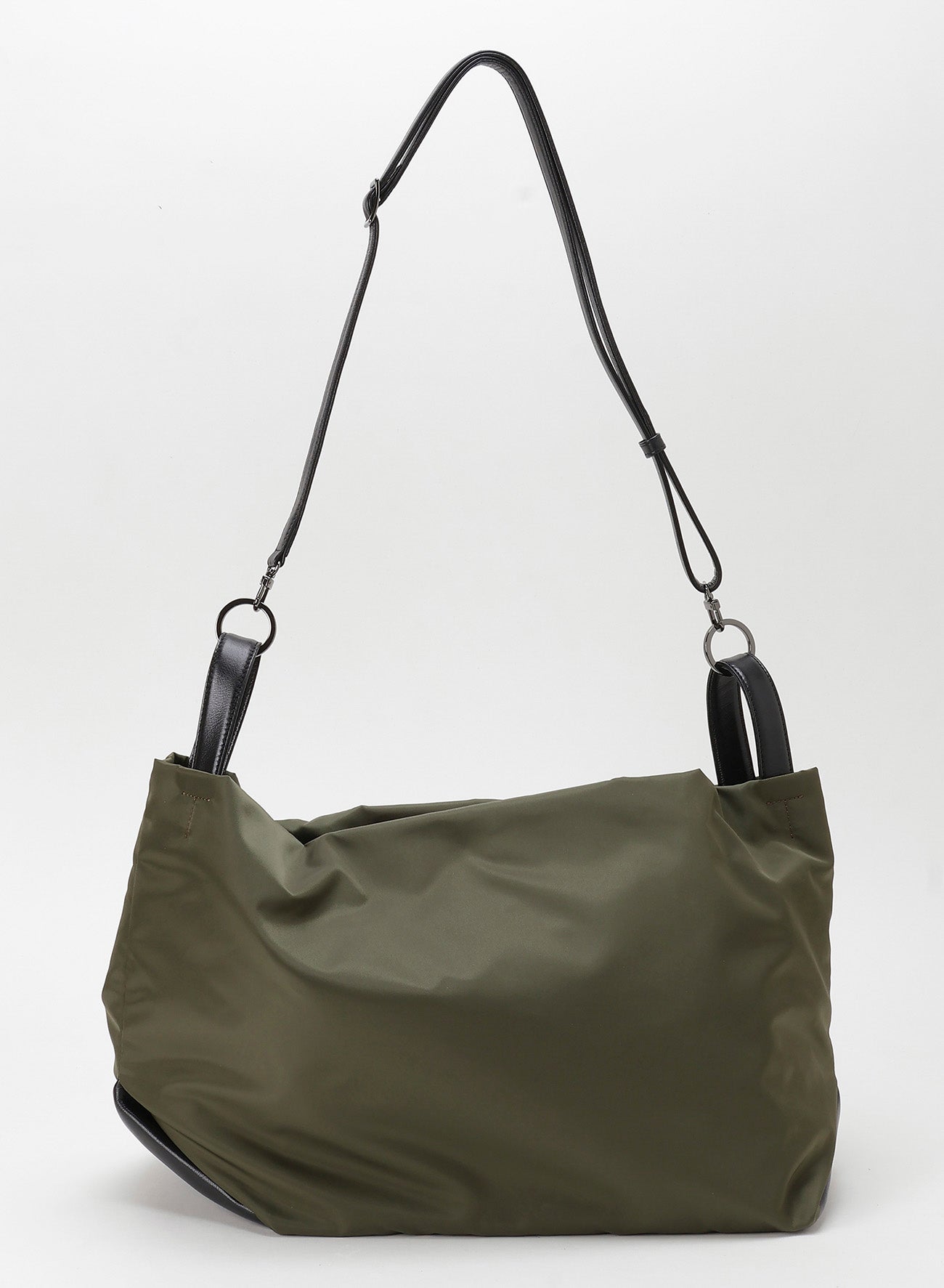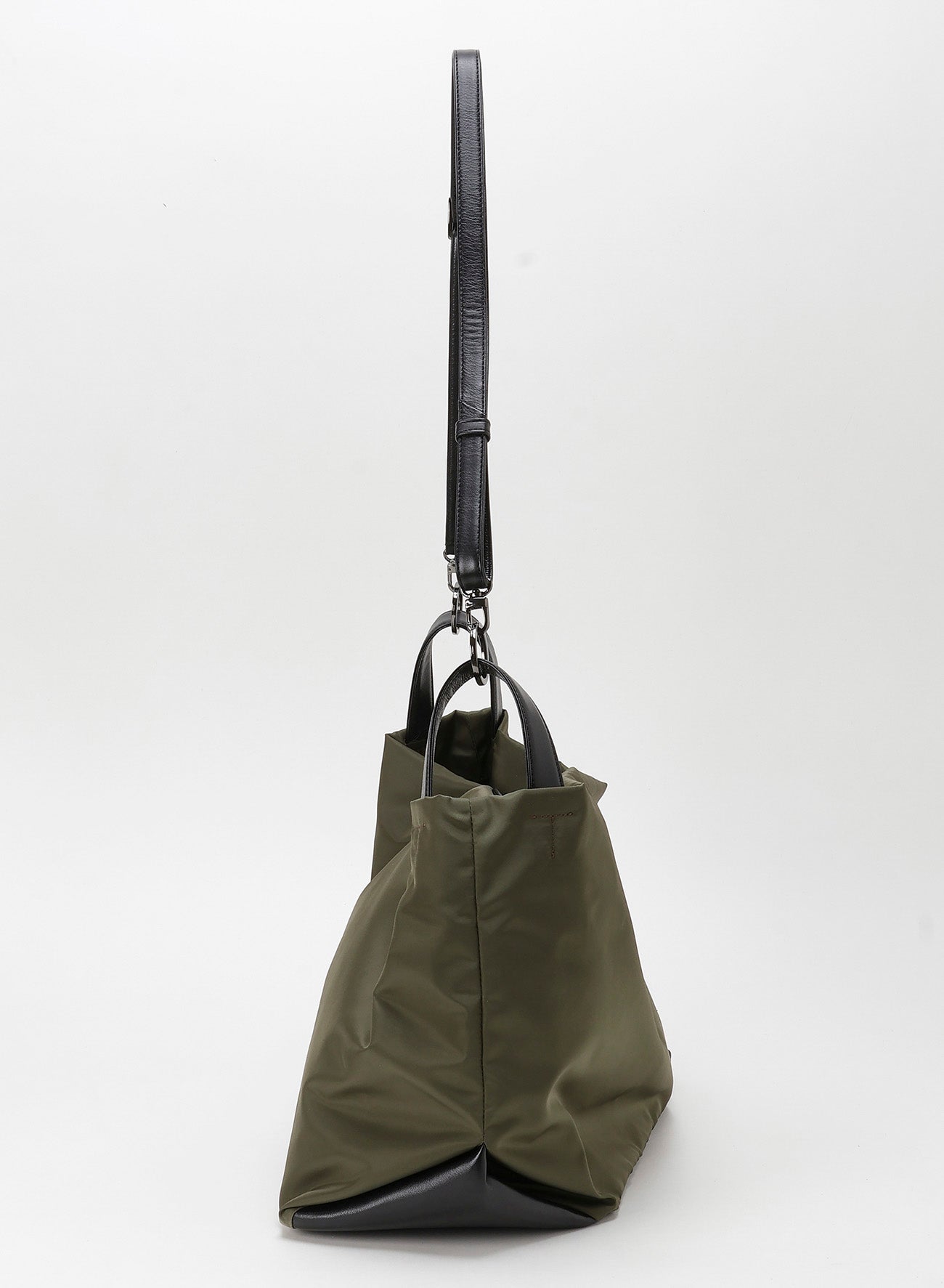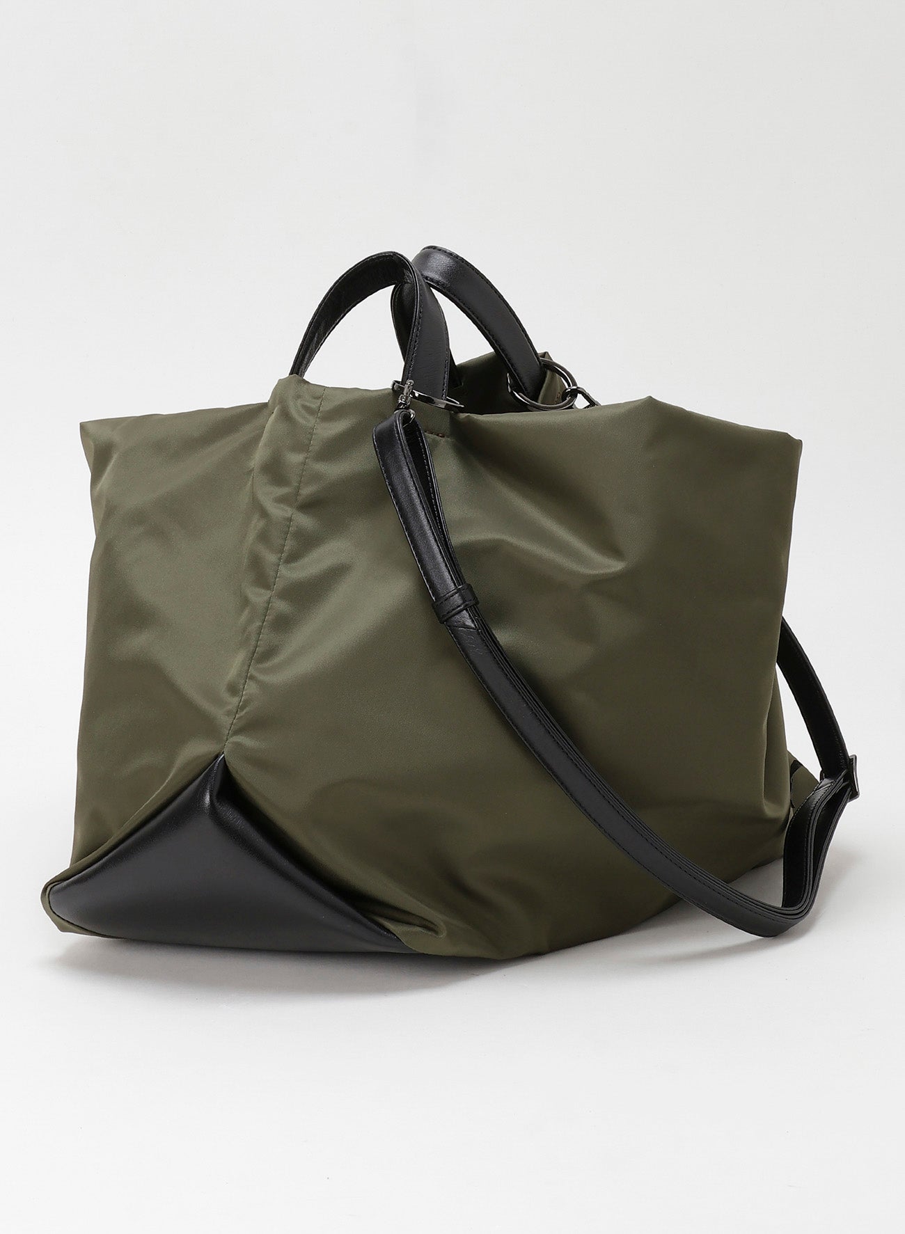 [TULIPS] evokes the feeling of a flower bud with its natural drapery when held by its handles. This versatile item features three carrying styles: handle, central handle, and shoulder strap. It uses luxurious Italian nylon with supple garment leather accents, creating a unique twist at the base.