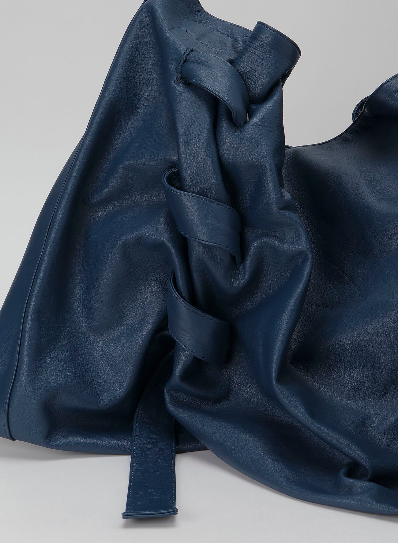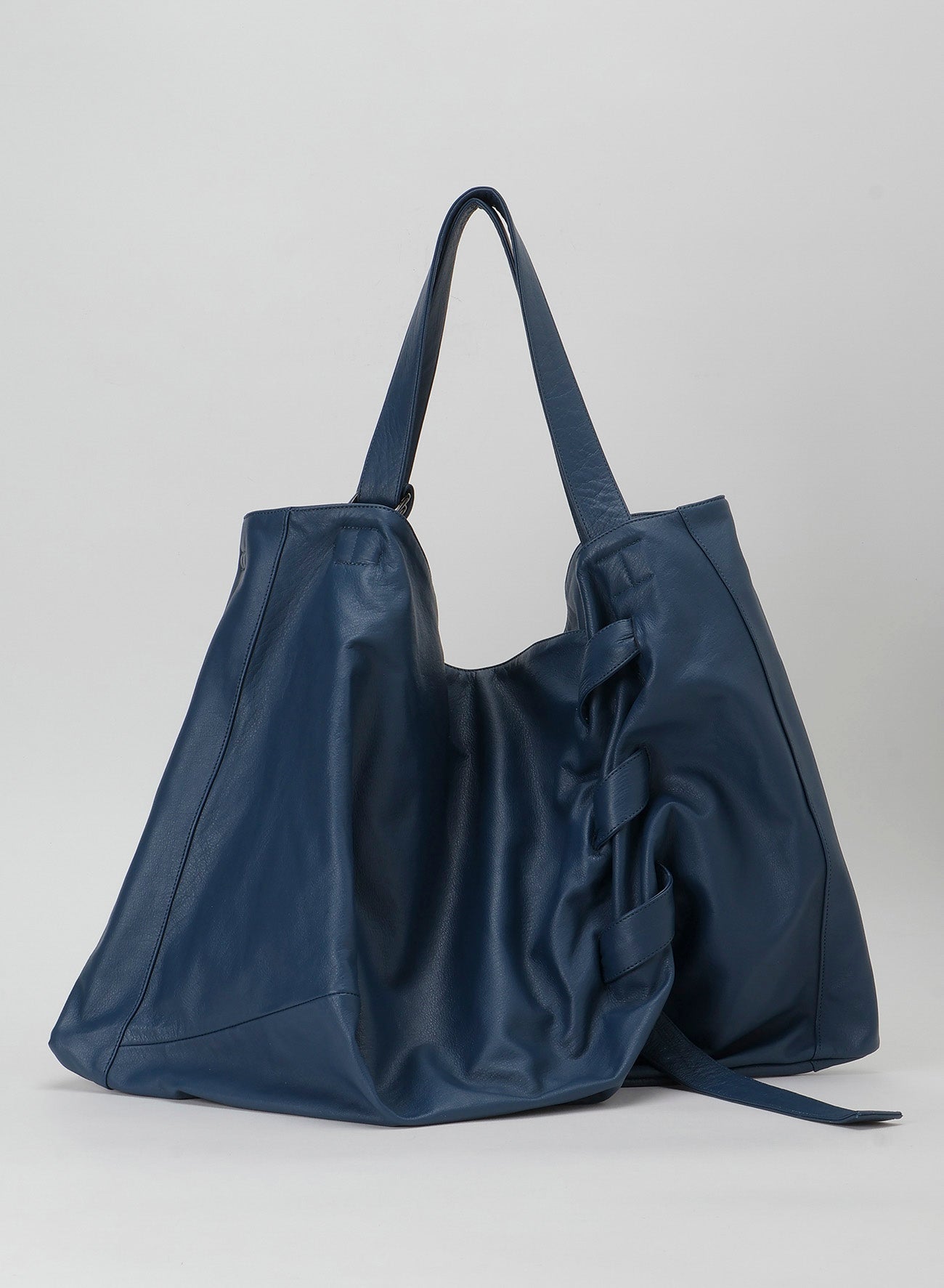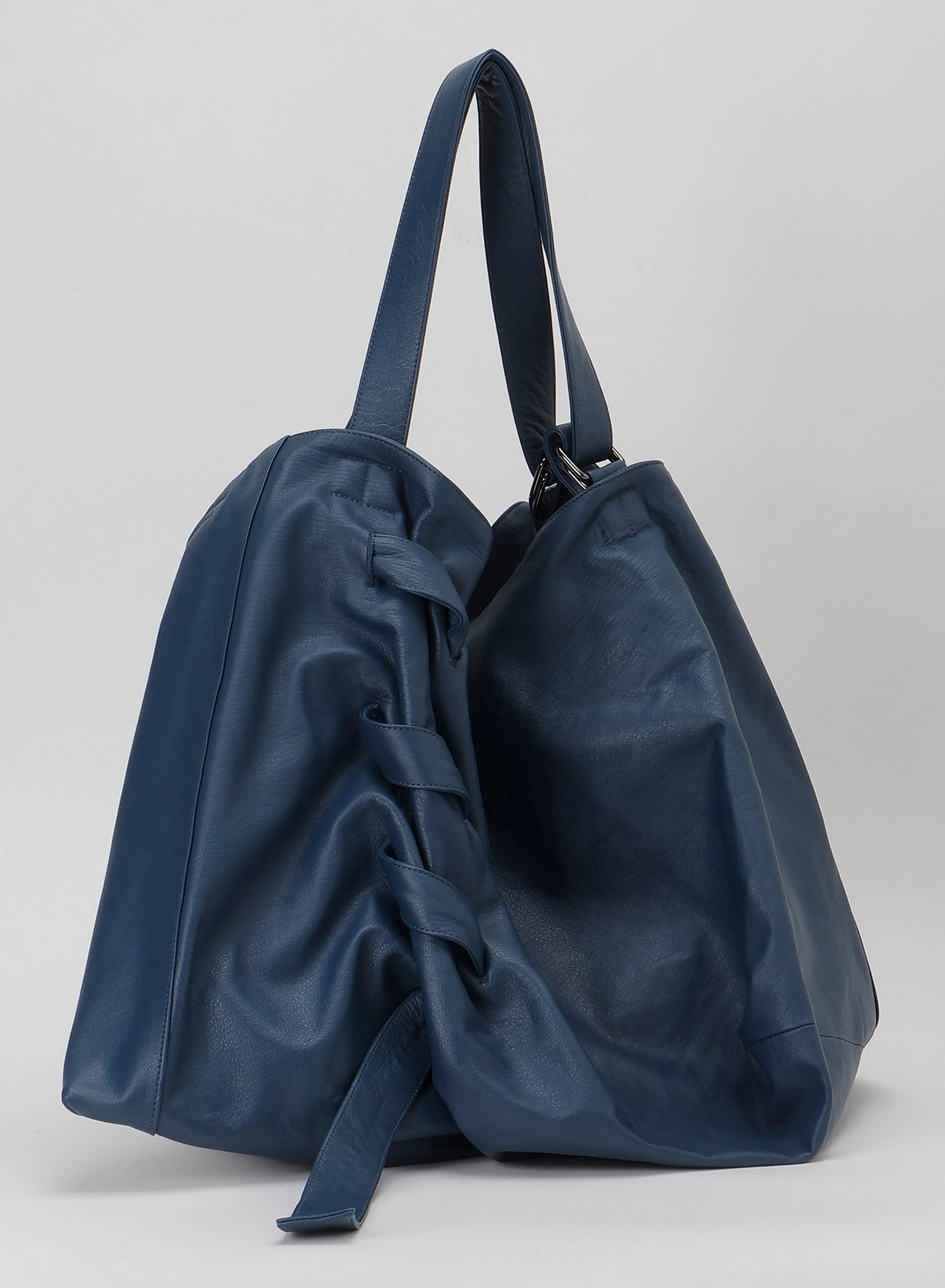This tote bag design is characterized by its distinctive central drape when carried by the handle. It features a removable shoulder strap for crossbody use and an adjustable handle. The silhouette can be altered by adjusting the ribbon's tension. The bag is made of garment leather, showcasing its natural shine and unique surface variations.