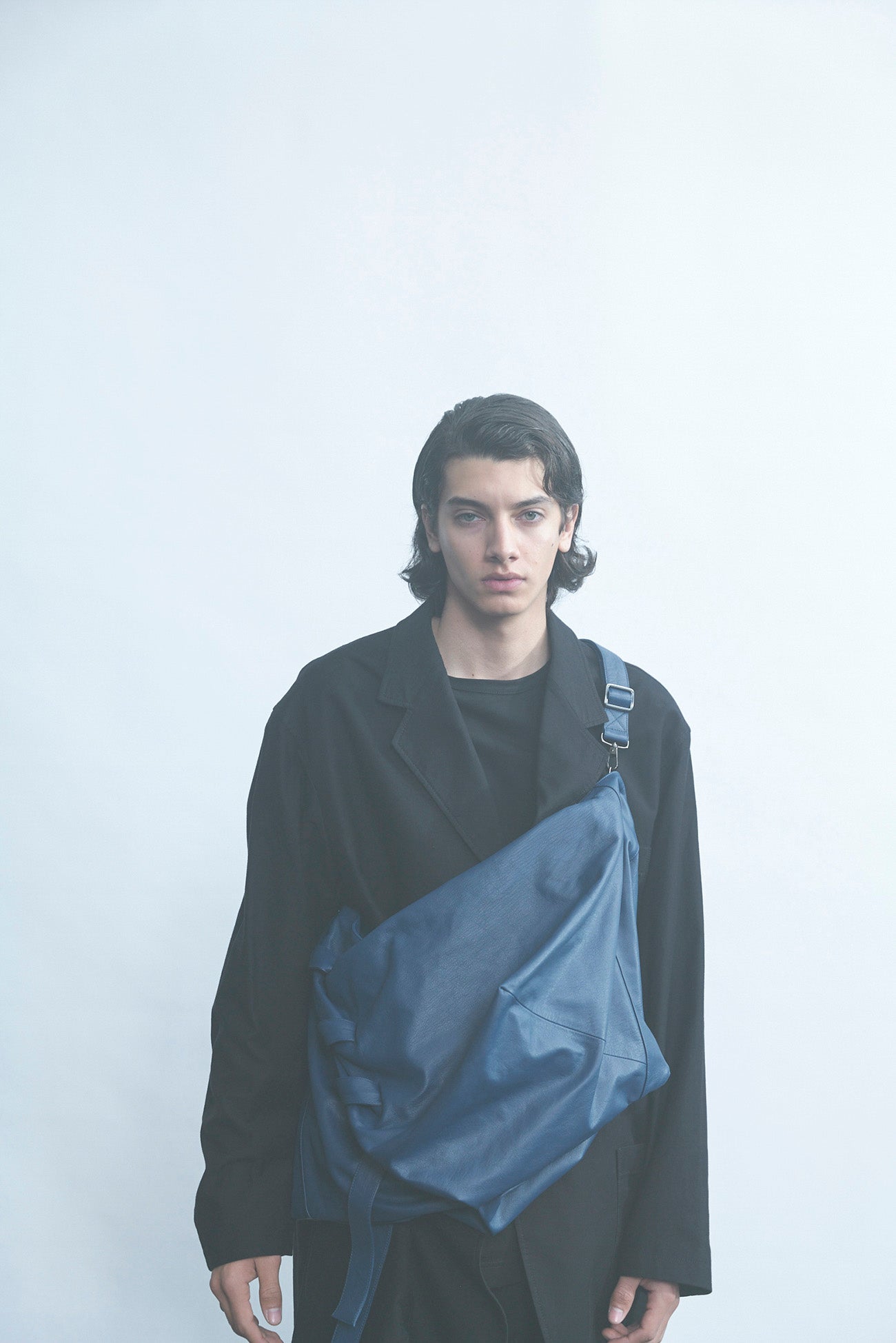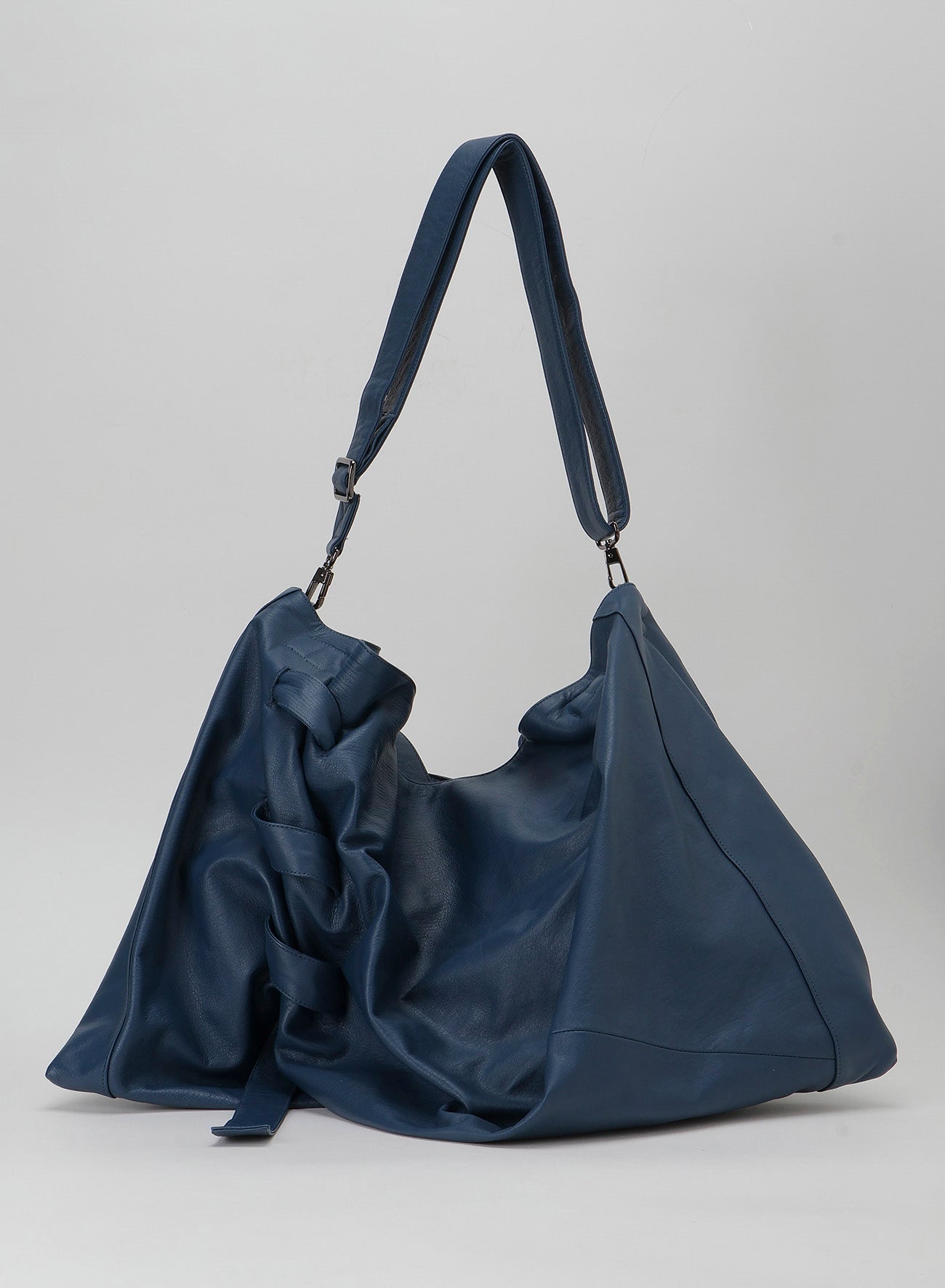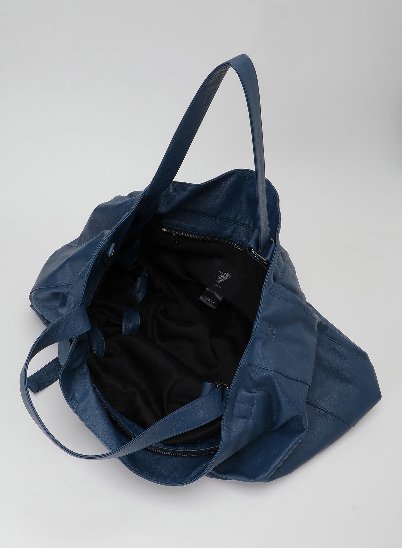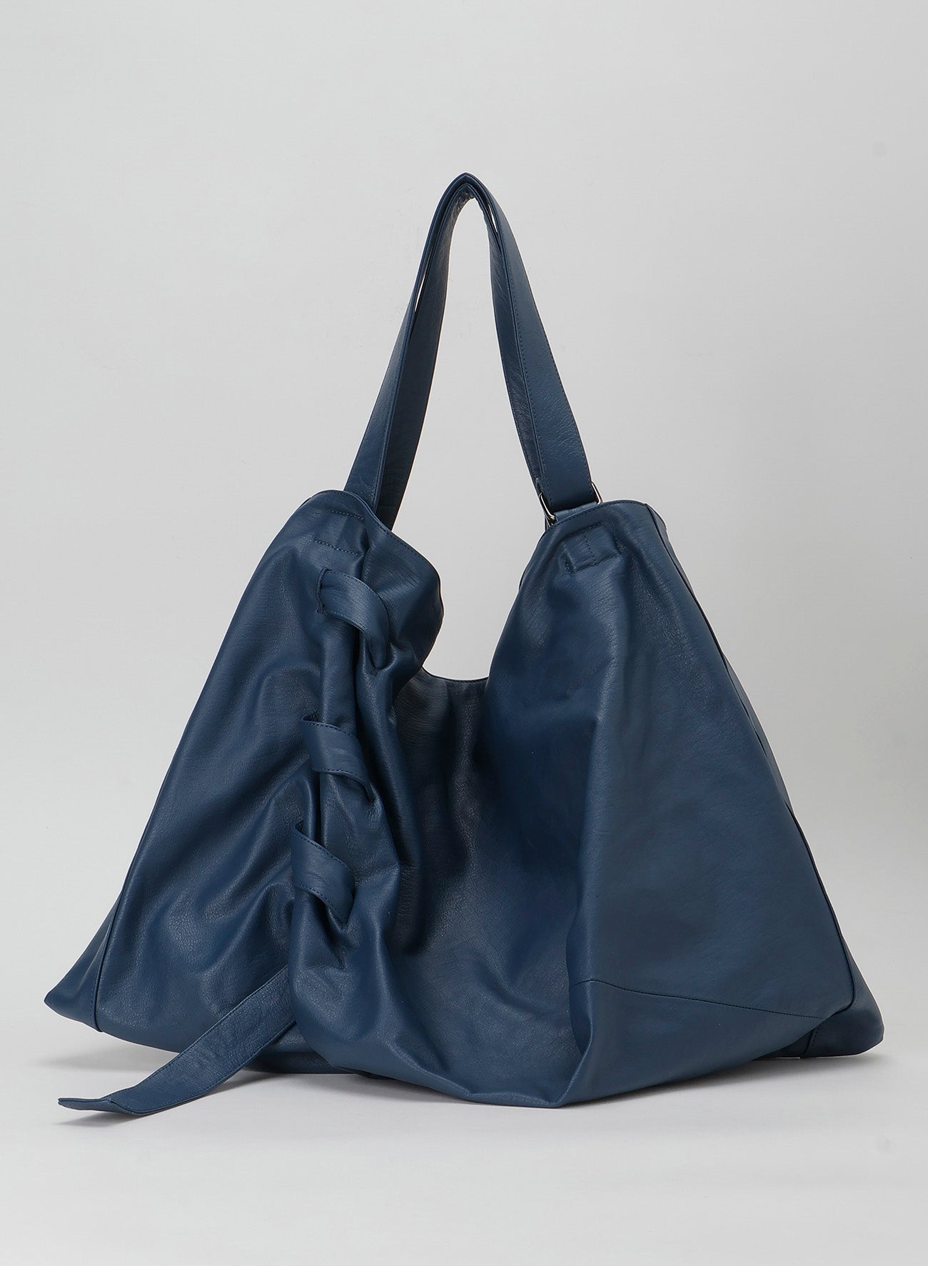 This tote bag design is characterized by its distinctive central drape when carried by the handle. It features a removable shoulder strap for crossbody use and an adjustable handle. The silhouette can be altered by adjusting the ribbon's tension. The bag is made of garment leather, showcasing its natural shine and unique surface variations.