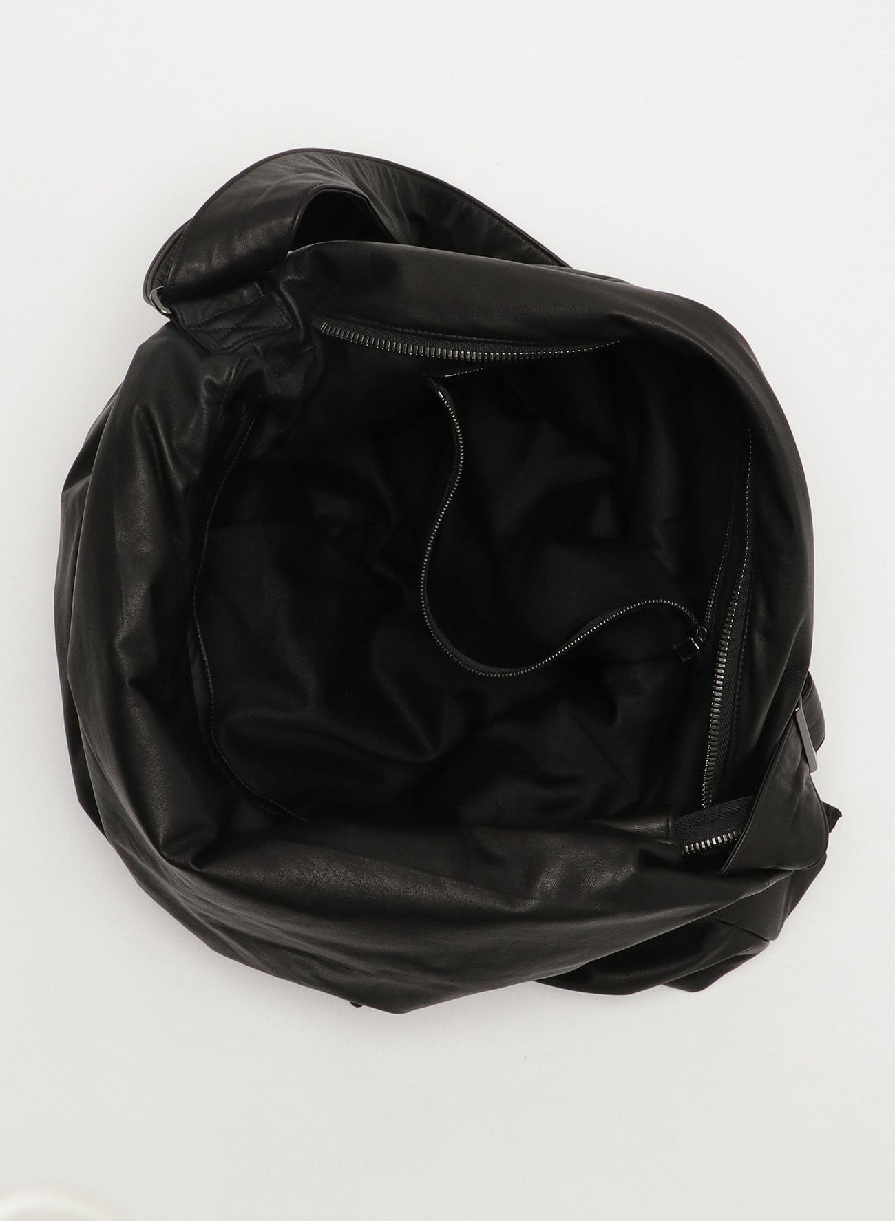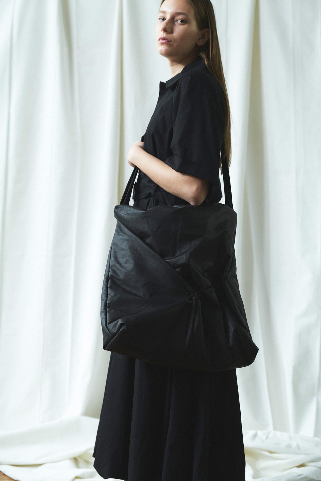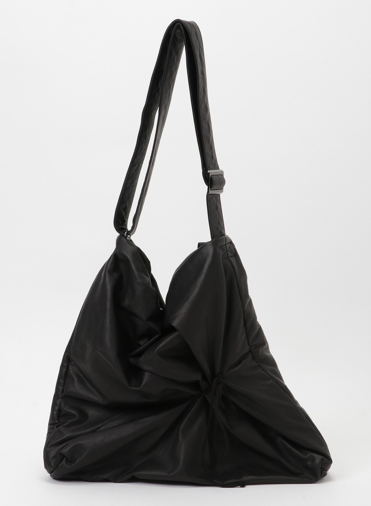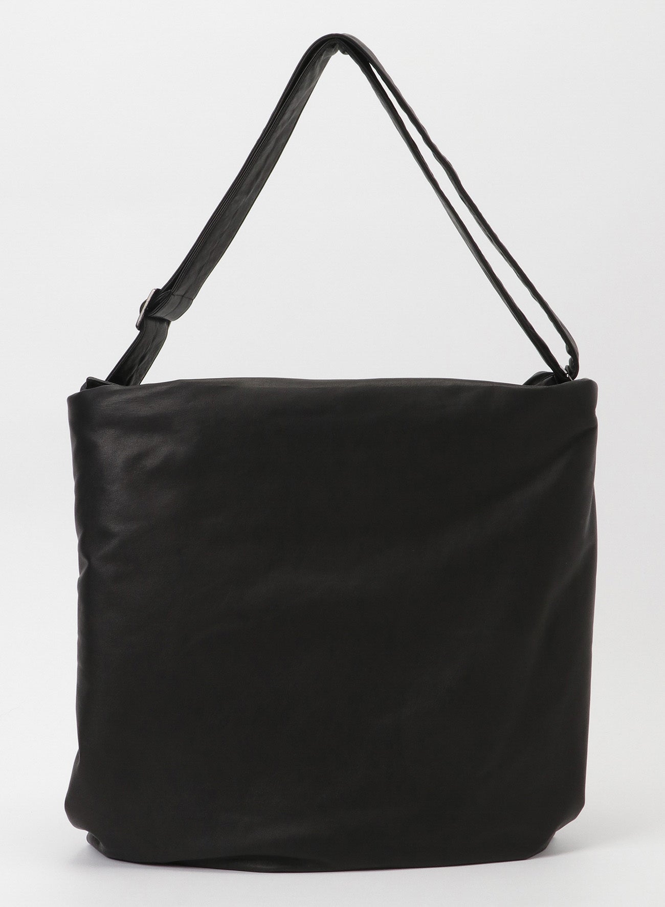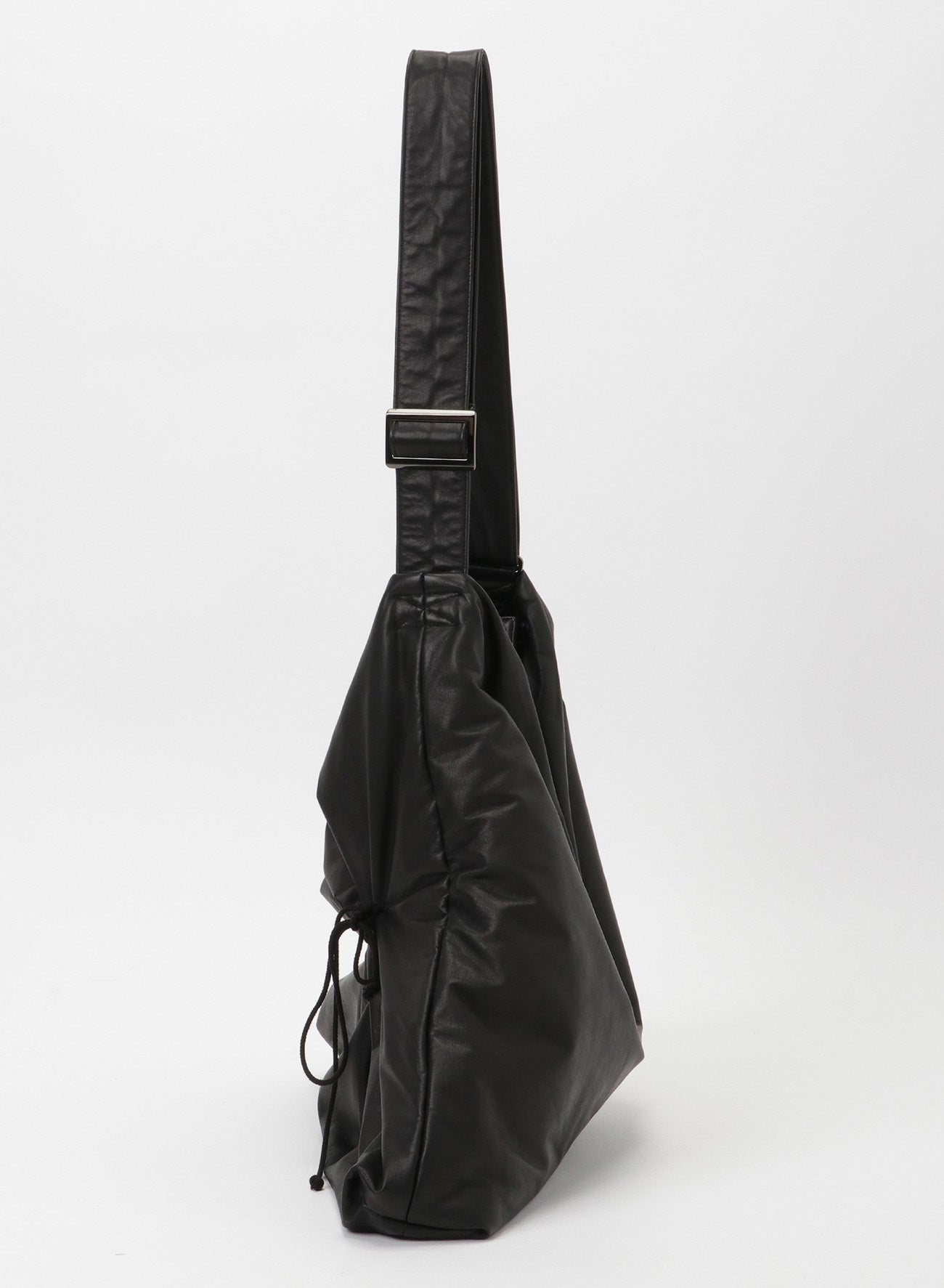This shoulder bag uses very soft leather and features a drawstring that creates a fabric-like drapery. It also emphasizes the puffiness of the padded body, giving it a distinct look.
