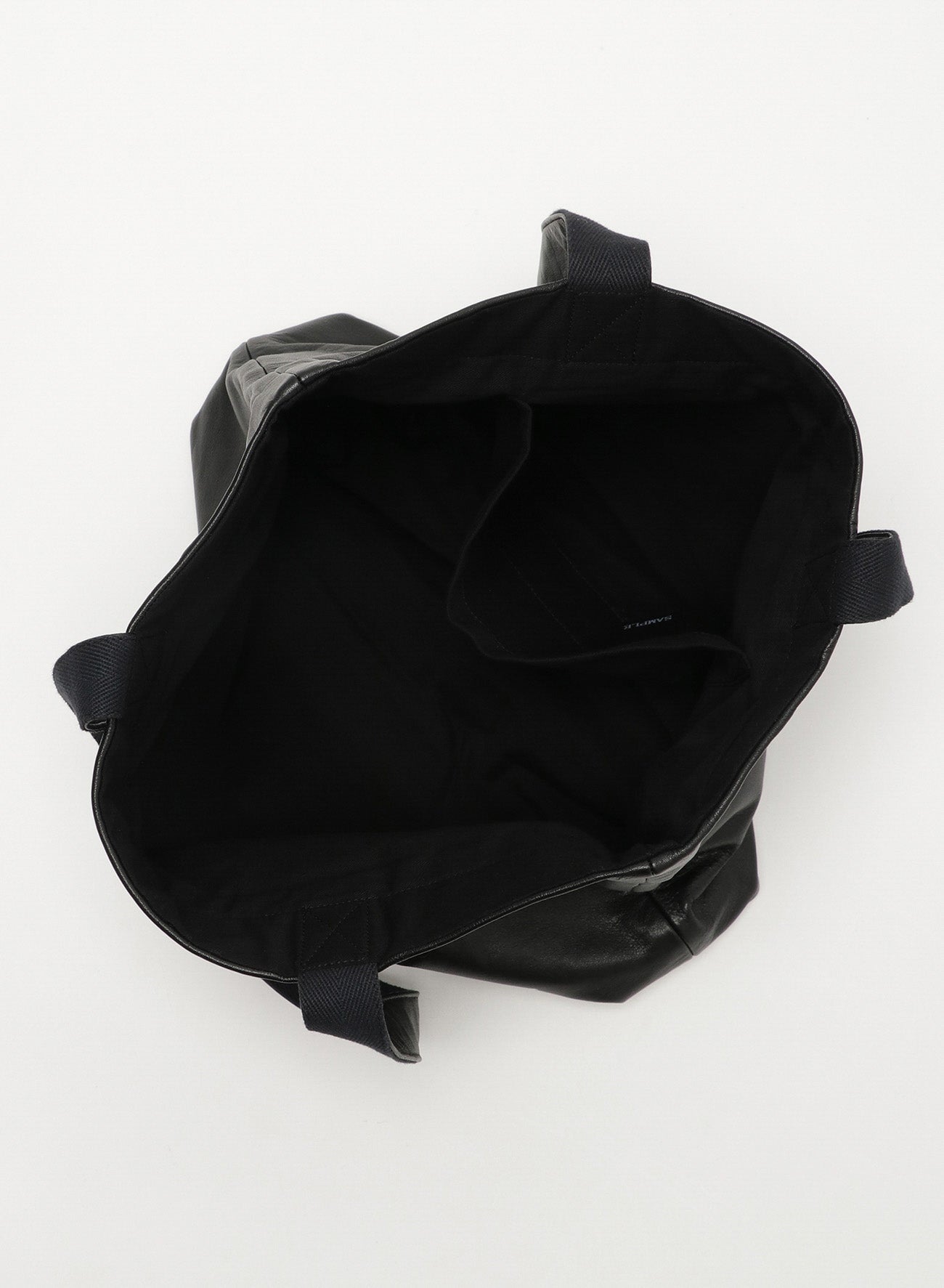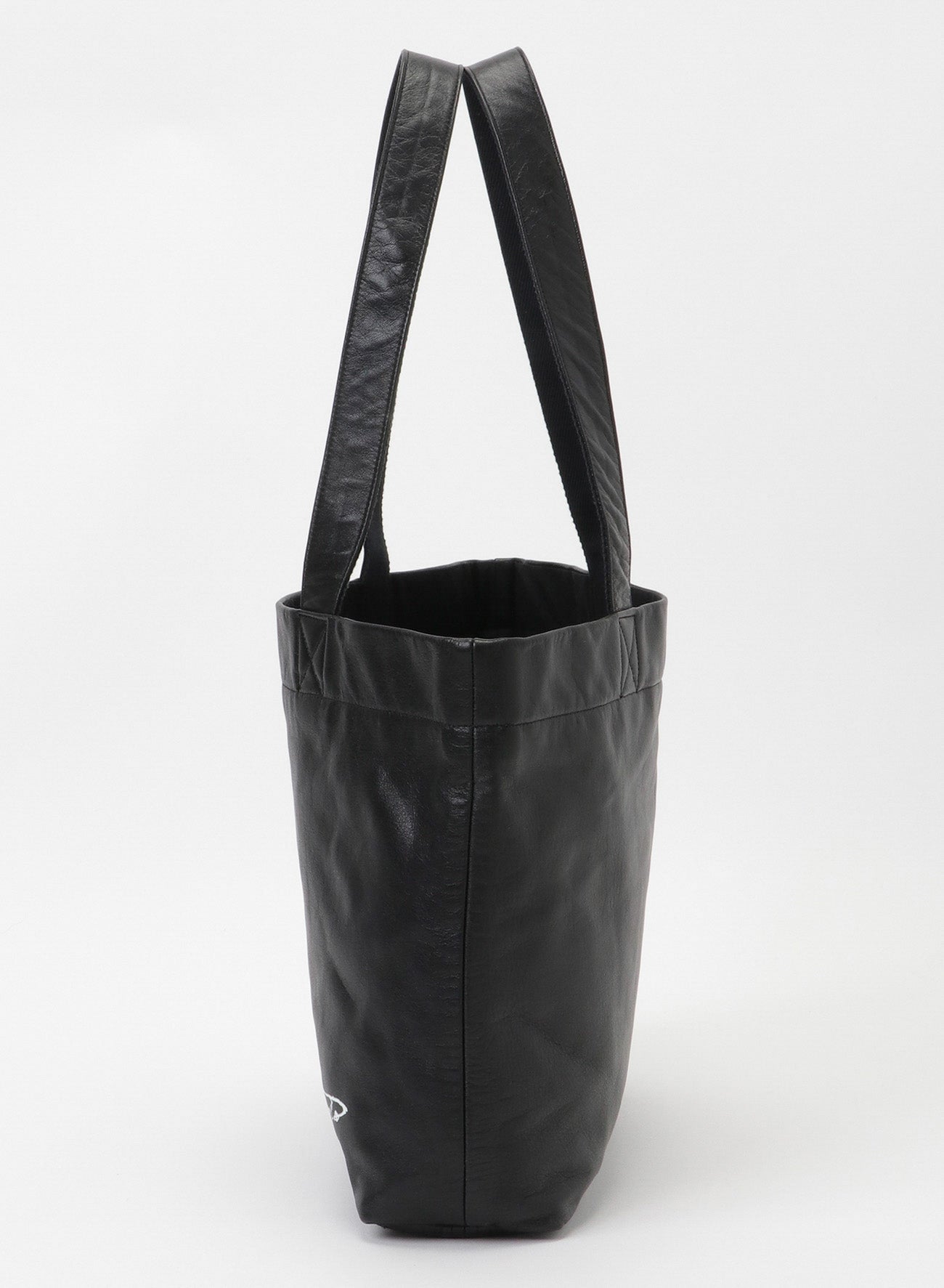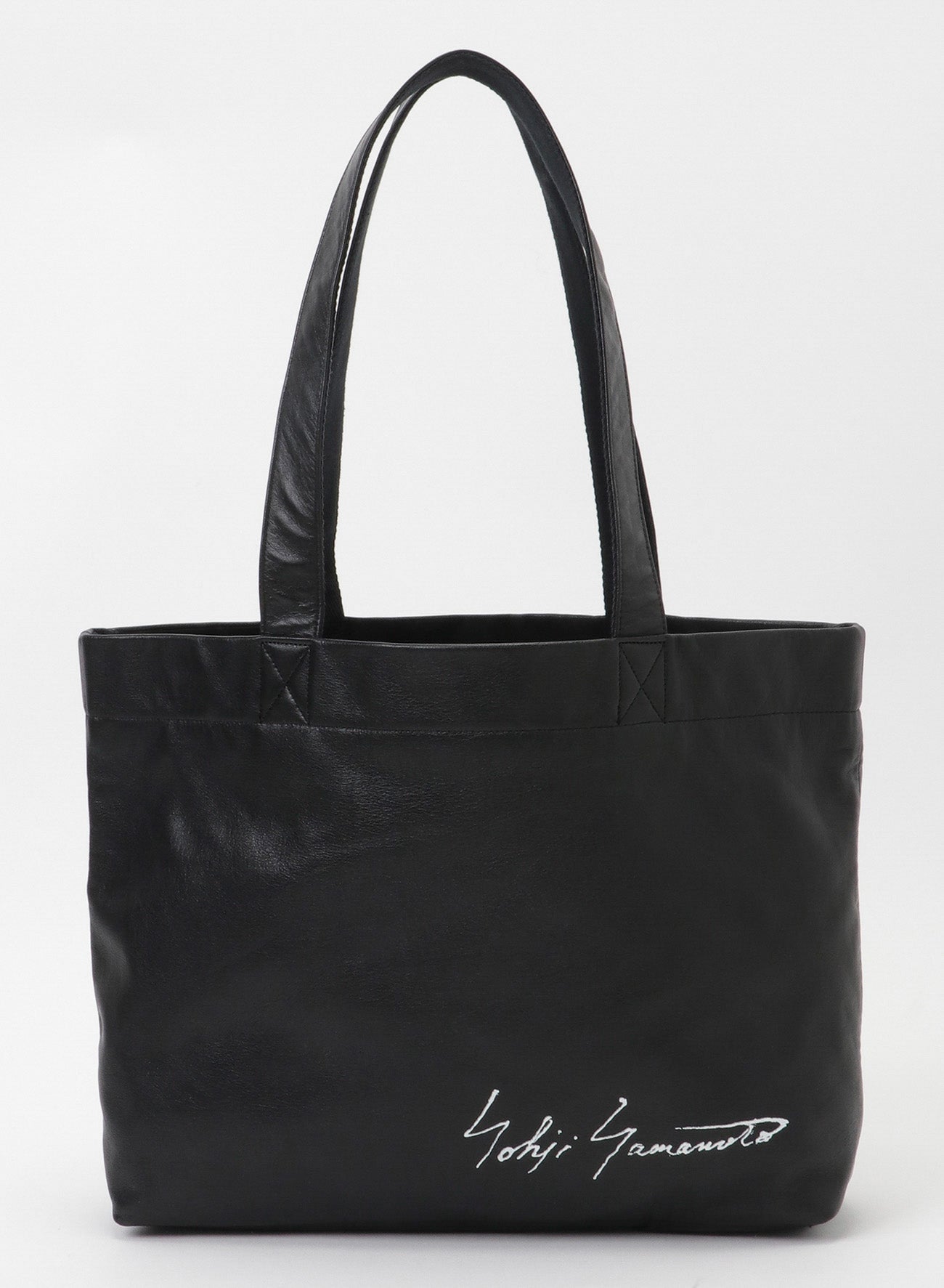 Yohji Yamamoto's tote bag in M size features his signature and is made from thin, soft cowhide. Ideal for fans of Yohji Yamamoto, this stylish and practical bag displays his iconic style through high-quality materials and elegant design. This is a must-have accessory for dedicated followers.